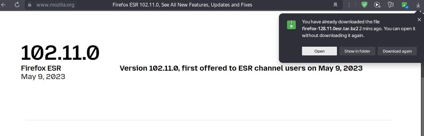 Хотел проверить на реально установленном Линуксе старую версию браузера. Вдруг из-за виртуальной машины сбой, а не самого браузера. Но официальный веб-сайт Mozilla запрещает скачивать Firefox версии 102. Вместо этого настойчиво подсовывают 128 версию браузера вместо 102.