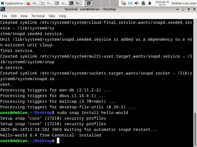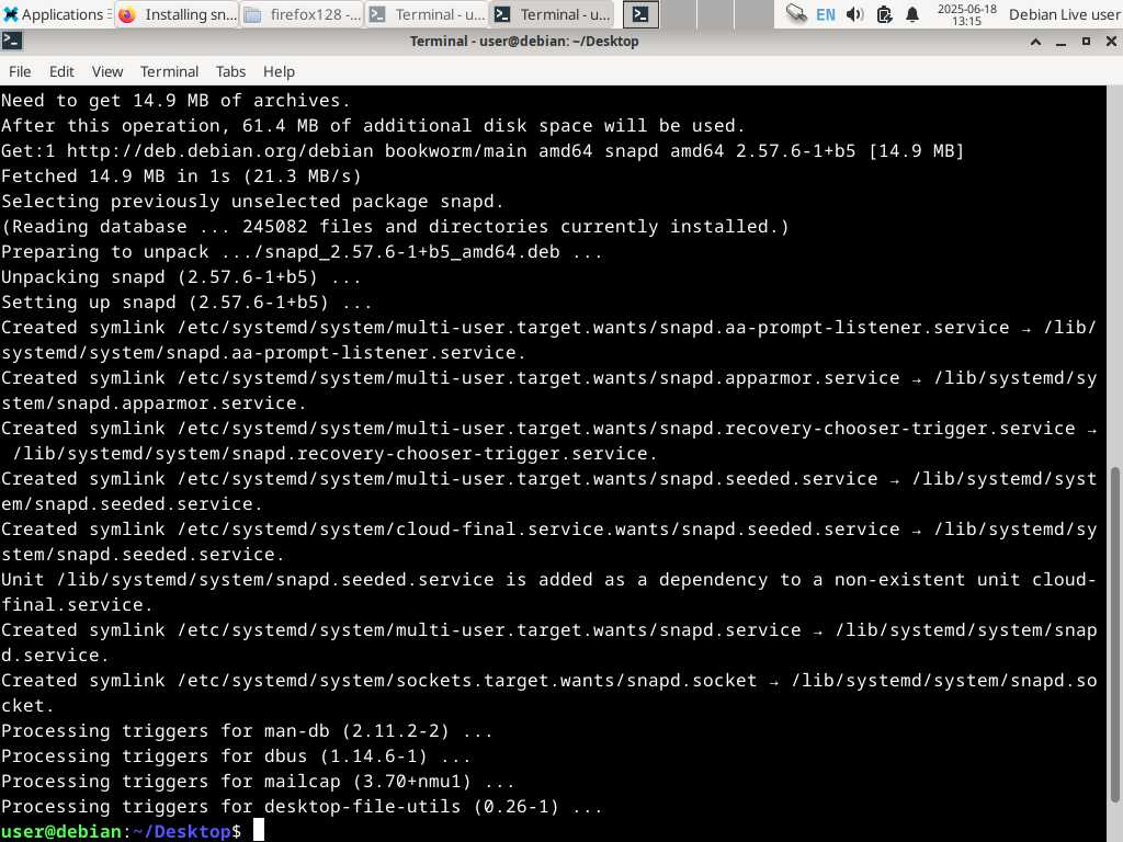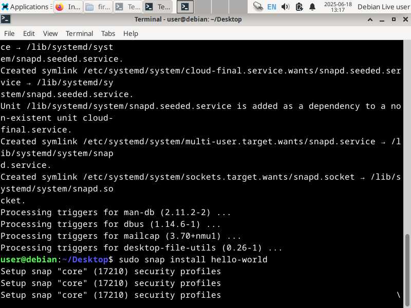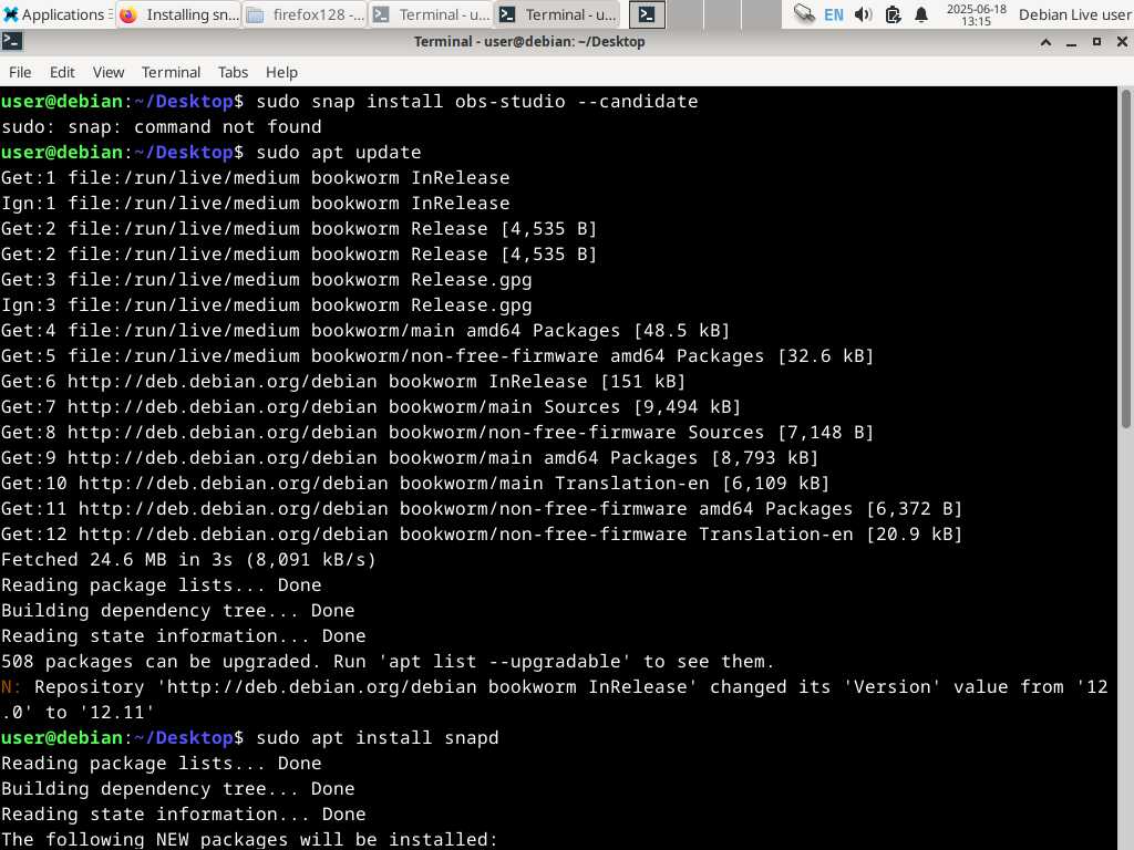Ладно, проверить всё равно надо. Так что подкидываю флешкой 128 версию браузера Firefox и пробую снова. Впрочем, результат ожидаемый: команда Snap не найдена, а значит, нужно устанавливать этот пакетный менеджер в систему, причём делать это через менеджер пакетов APT, что явный признак несостоятельности способа распространения софта для Linux.