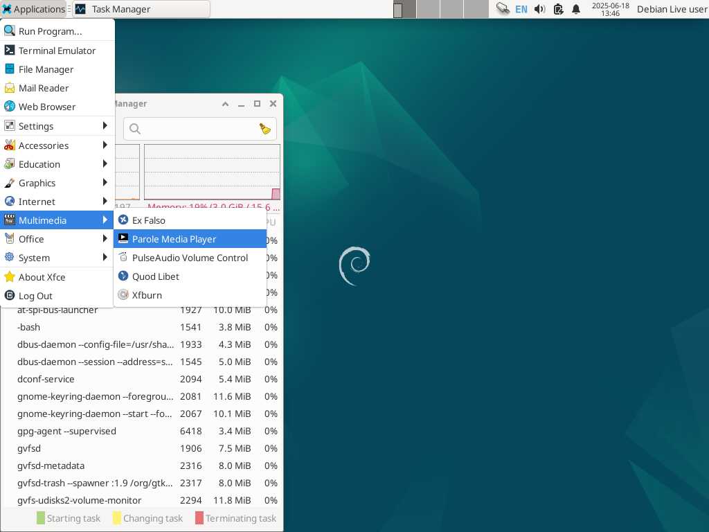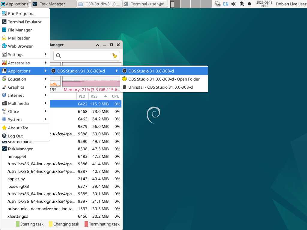 Ну а дальше просто открываю меню приложений, захожу в стандартную категорию «Applications», нахожу OBS Studio и запускаю. Оперативной памяти при этом скушало всего 254 МиБ.