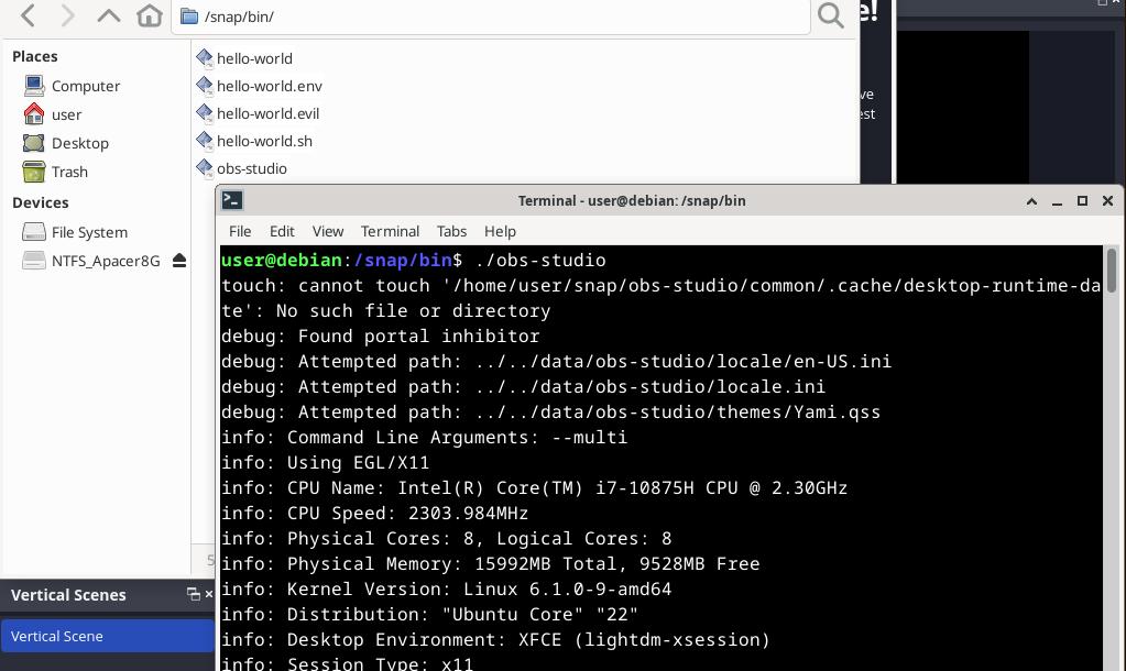 Точно. Нужно ведь из другого каталога запускать. Как же я так. Причём можно заметить, программа считает, что работает в дистрибутиве Ubuntu Core 22. То есть Snap обманывает программу насчёт рабочего окружения. Это даже может привести к проблемам в некоторых случаях.