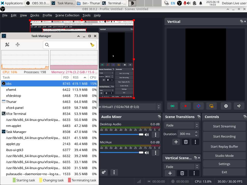 В файловой системе из 7.8 ГиБ у меня осталось свободно всего 5.8 ГиБ. Вычитаем 244 МиБ на браузер Firefox 128 версии. Получается, OBS Studio в формате Snap сожрал целых 1.76 ГиБ.