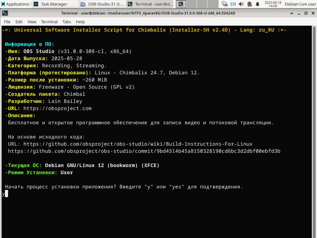 Ой, а это уже максимально плохо. Сазу после введения команды началась установка OBS Studio без предупреждений и разрешения пользователя. И качает оно просто неадекватный объём трафика из репозиториев...