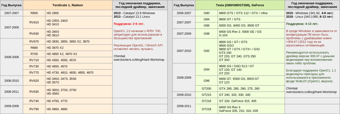 По итогу со стороны «Красных» имеем массу видеокарт Radeon HD 2000-4000 за 2007-2011 год, и все были брошены в 2013 году. Если на вопросы к реализации OpenGL и DirectX можно кое-как закрыть глаза, то нефункциональная поддержка OpenCL API — просто наихудшая сторона видеокарт Radeon.