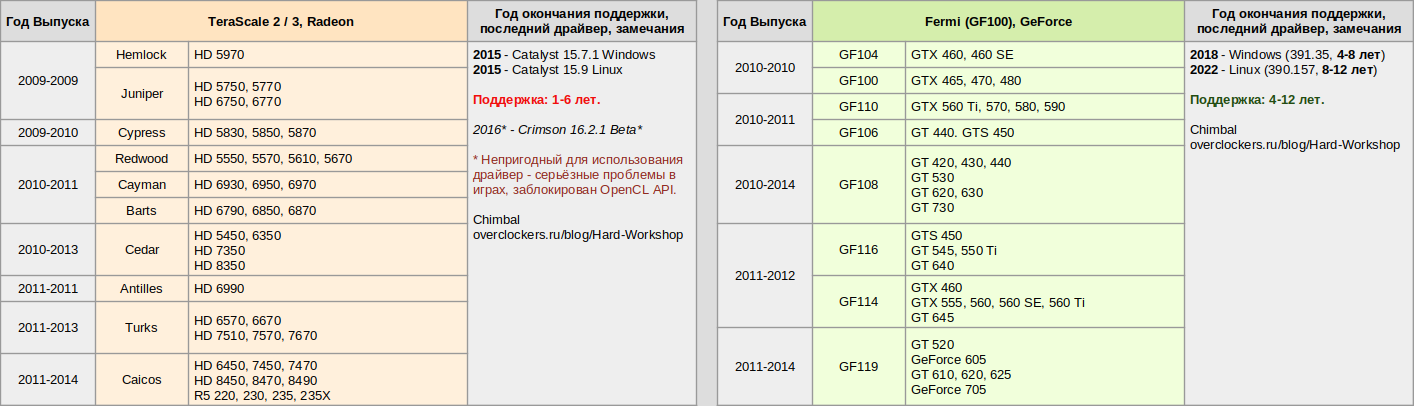 В плане поддержки у AMD снова всё плохо. Самые свежие видеокарты Radeon на архитектуре TeraScale 2 поддерживались всего 1 год с момента выпуска, а самые старые — 6 лет. У NVIDIA поддержка длилась от 4 до внушительных 12 лет.