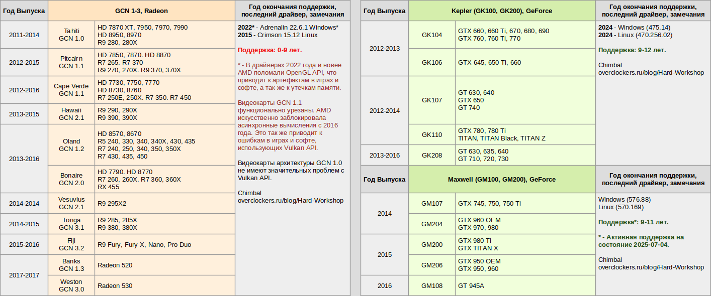 Ещё замечу. Раньше я указывал видеокарты Tahiti как GCN 1.1 на основании того, что они не урезаны функционально драйверами. Но на самом деле технически они являются GCN 1.0, а урезаны были более новые GCN 1.1. Да, AMD урезала архитектурно более новые видеокарты...