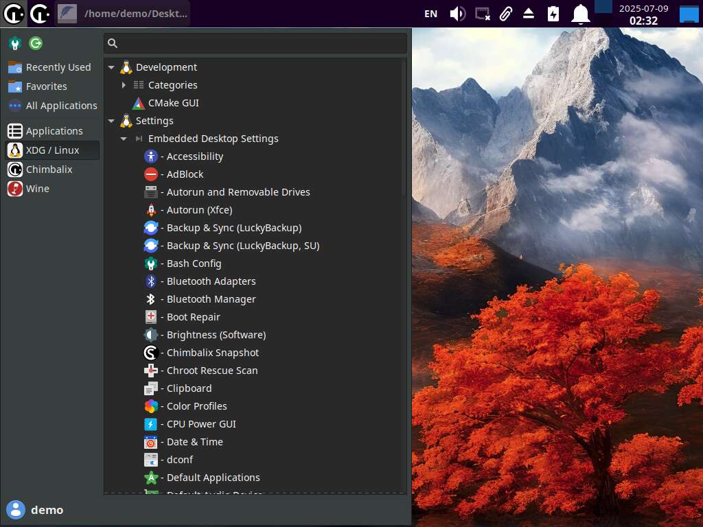 Идём дальше. Немного переработано меню приложений в основной с технической стороны. Добавлена новая категория в разделе XDG / Linux. Она не соответствует спецификациям FreeDesktop, но и не противоречит. Это было сделано специально для людей, которые не могут найти кнопку запуска панели управления (рядом с кнопкой выхода из системы).