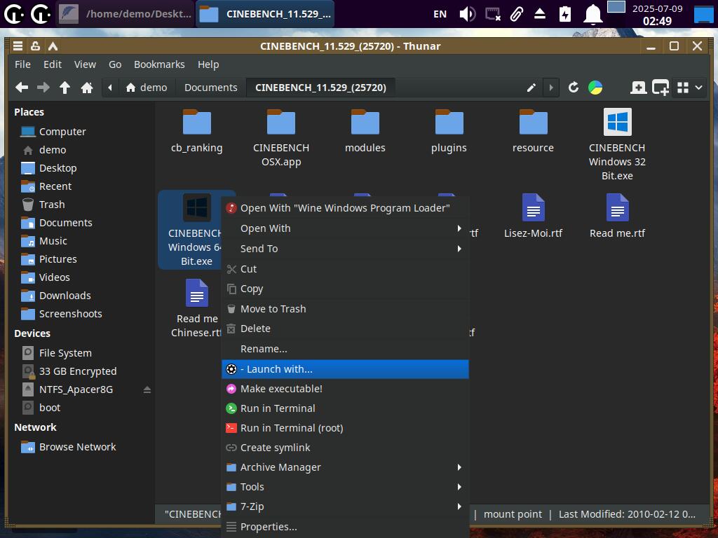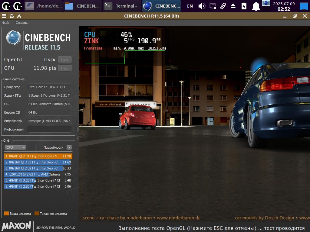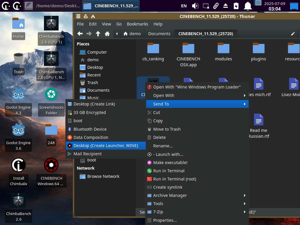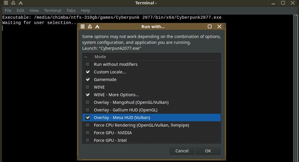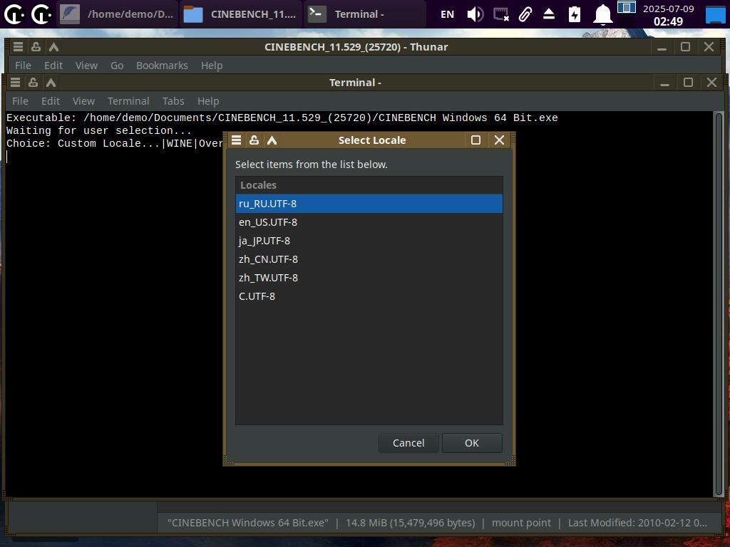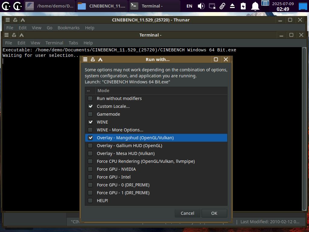 Просто выбираем исполняемый файл и запускаем. При запуске через новый пункт меню появится окно с модификаторами на выбор. Для примера, запустил CineBENCH R11 с русской локализацией и Mangohud оверлеем через Wine. Хотя тест OpenGL был провален - слишком неправильно рисует изображение Mesa3D. Но это не важно, ведь речь про новые возможности запуска приложений.