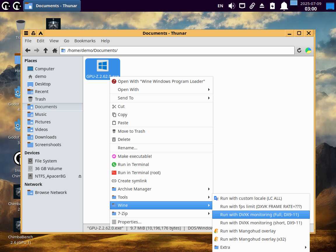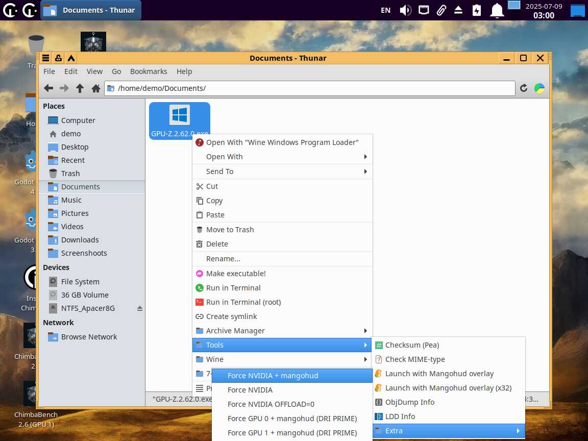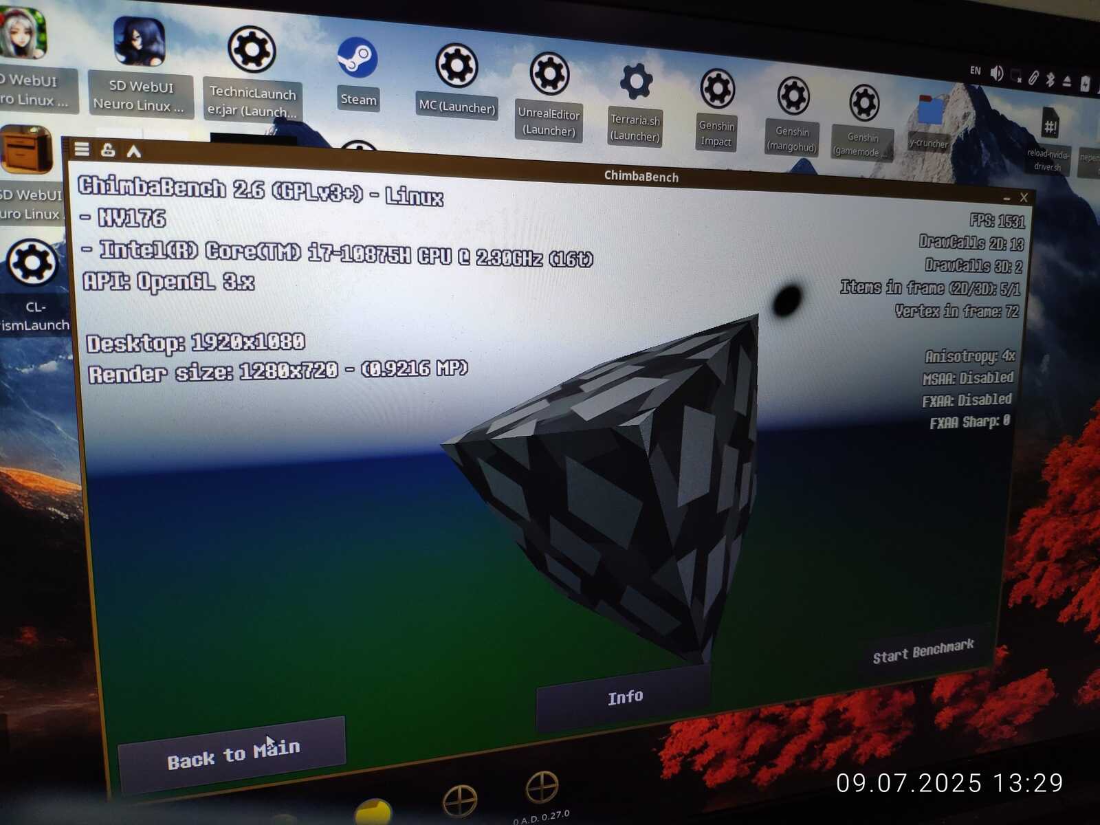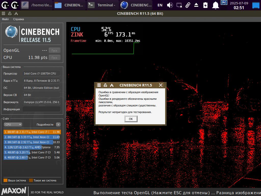 Просто выбираем исполняемый файл и запускаем. При запуске через новый пункт меню появится окно с модификаторами на выбор. Для примера, запустил CineBENCH R11 с русской локализацией и Mangohud оверлеем через Wine. Хотя тест OpenGL был провален - слишком неправильно рисует изображение Mesa3D. Но это не важно, ведь речь про новые возможности запуска приложений.