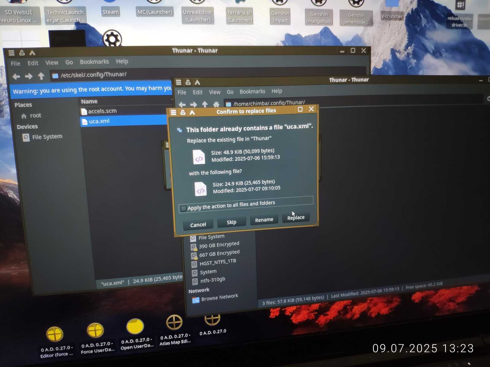 Так же заменяю руками файл конфигурации проводника Thunar, чтобы получить все функции нового контекстного меню.