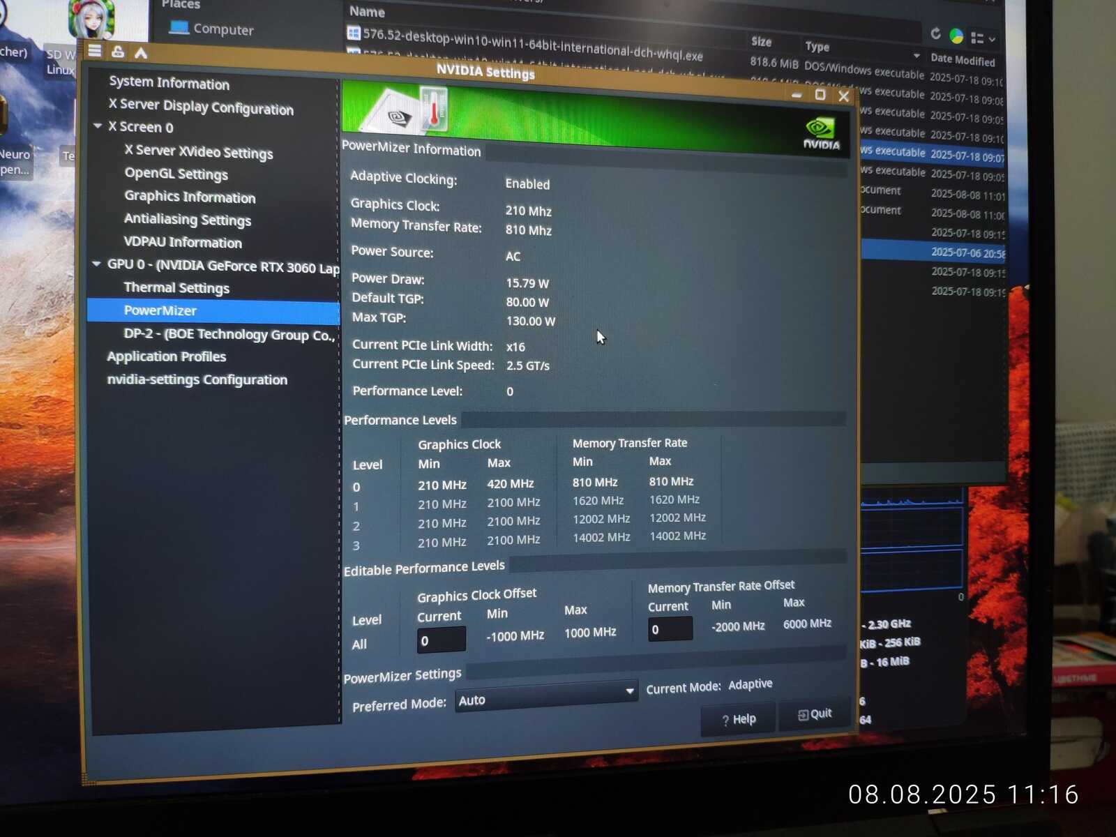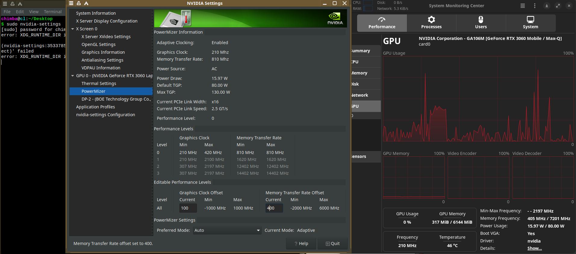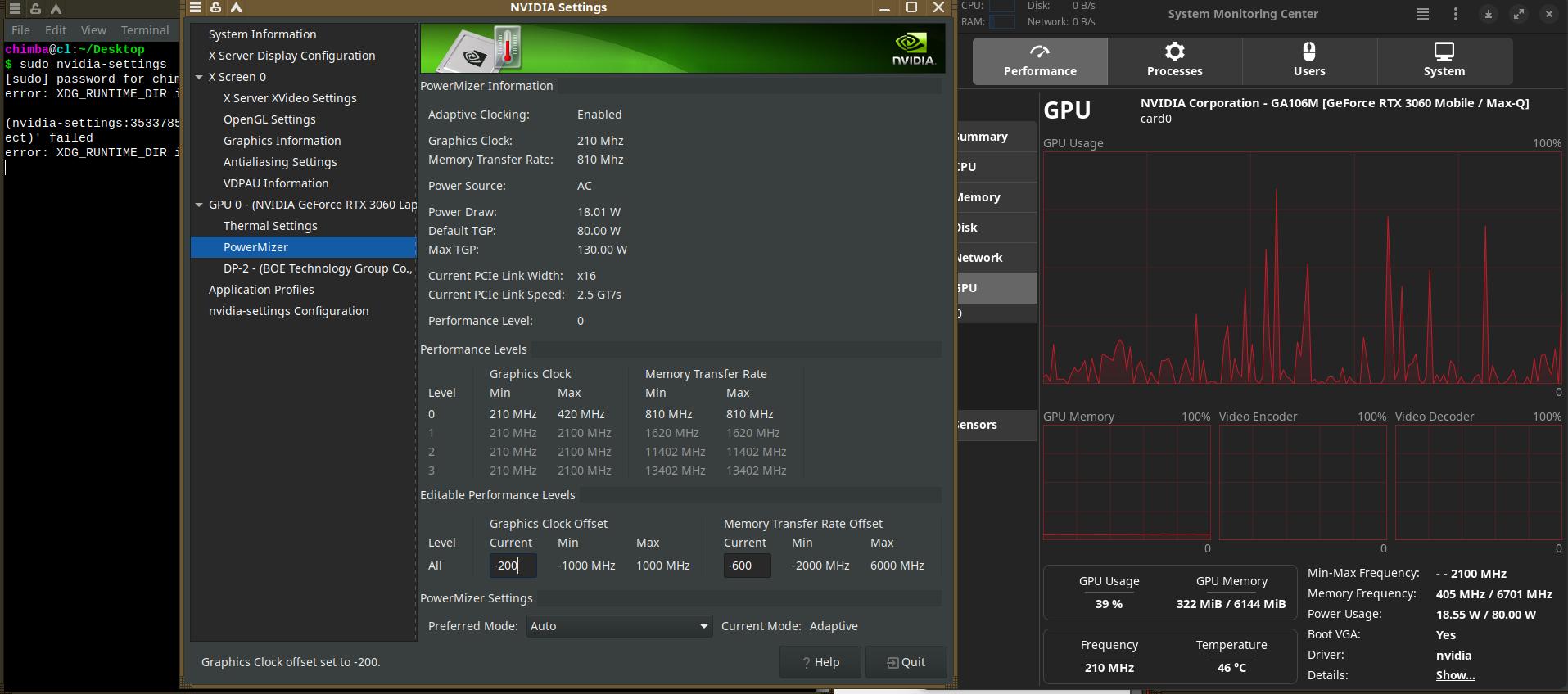 Что важного можно отметить при разгоне NVIDIA GeForce RTX 3060 Mobile в среде Linux? Ну, начнём с того, что должен быть установлен нормальный официальный драйвер видеокарты. А ещё встроенная графика должна быть отключена, что зачастую большая проблема на ноутбуках с AMD Ryzen, ибо на Красных ноутбуках часто невозможно отключение встройки.