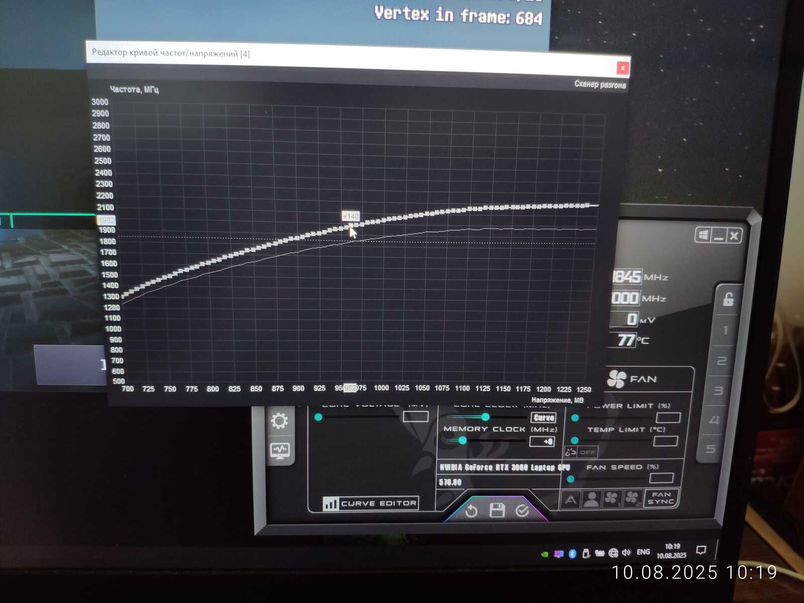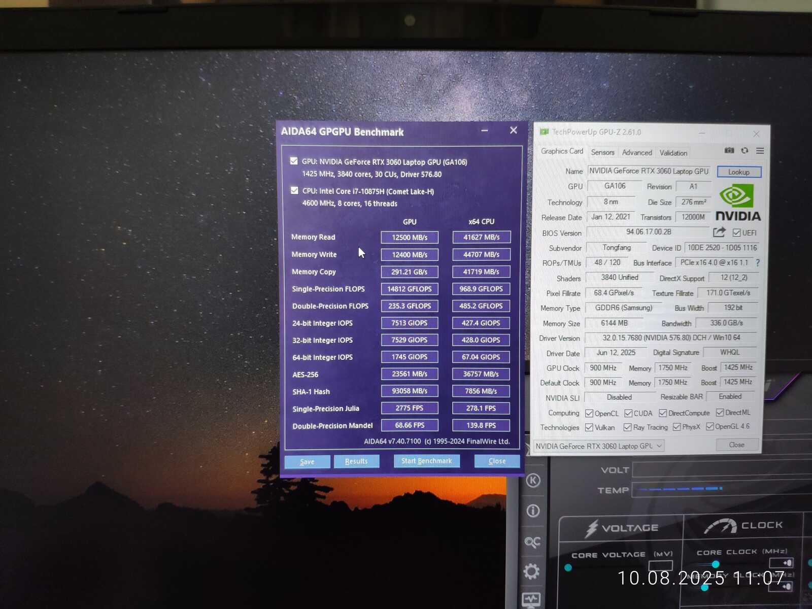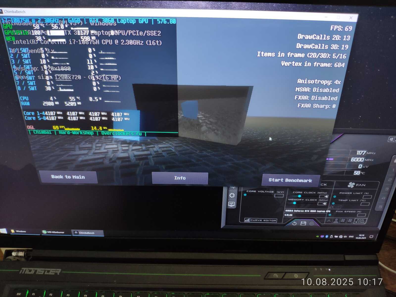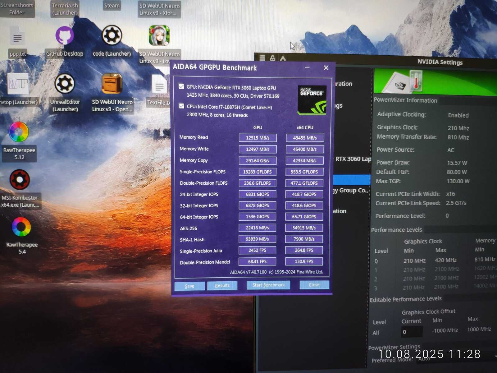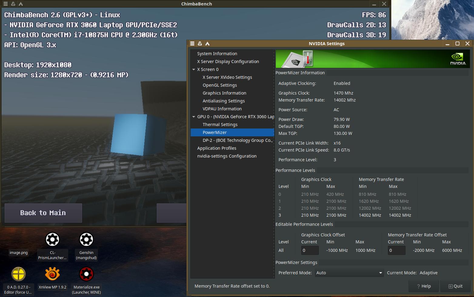 Тестовый ноутбук состоит из процессора Intel Core i7-10875H и видеокарты NVIDIA GeForce RTX 3060 Mobile на 6 GB. Так же на борту 64 GB оперативной памяти и два NVMe SSD. Для разгона буду использовать MSI Afterburner в среде Windows и контрольную панель NVIDIA в Linux.