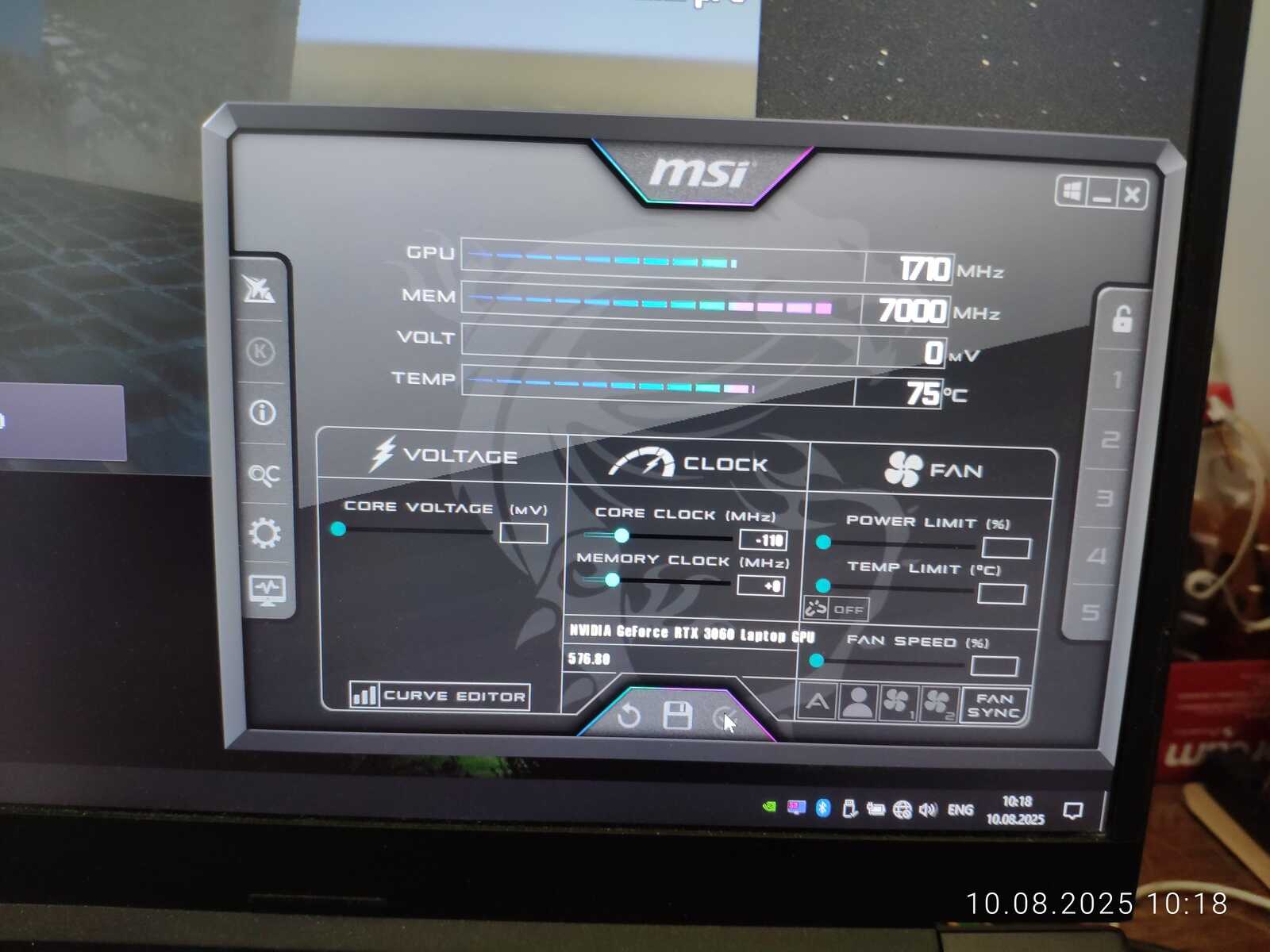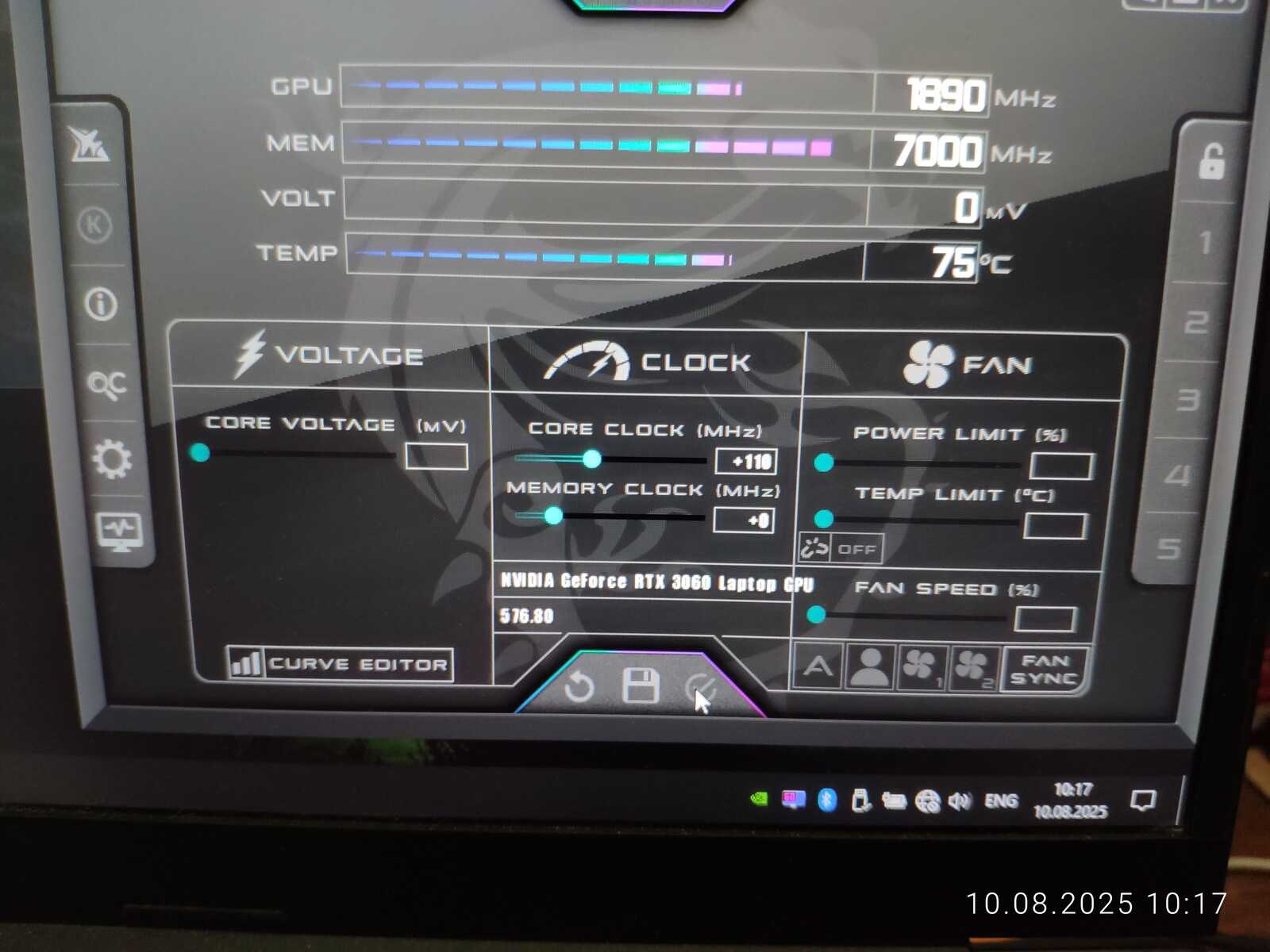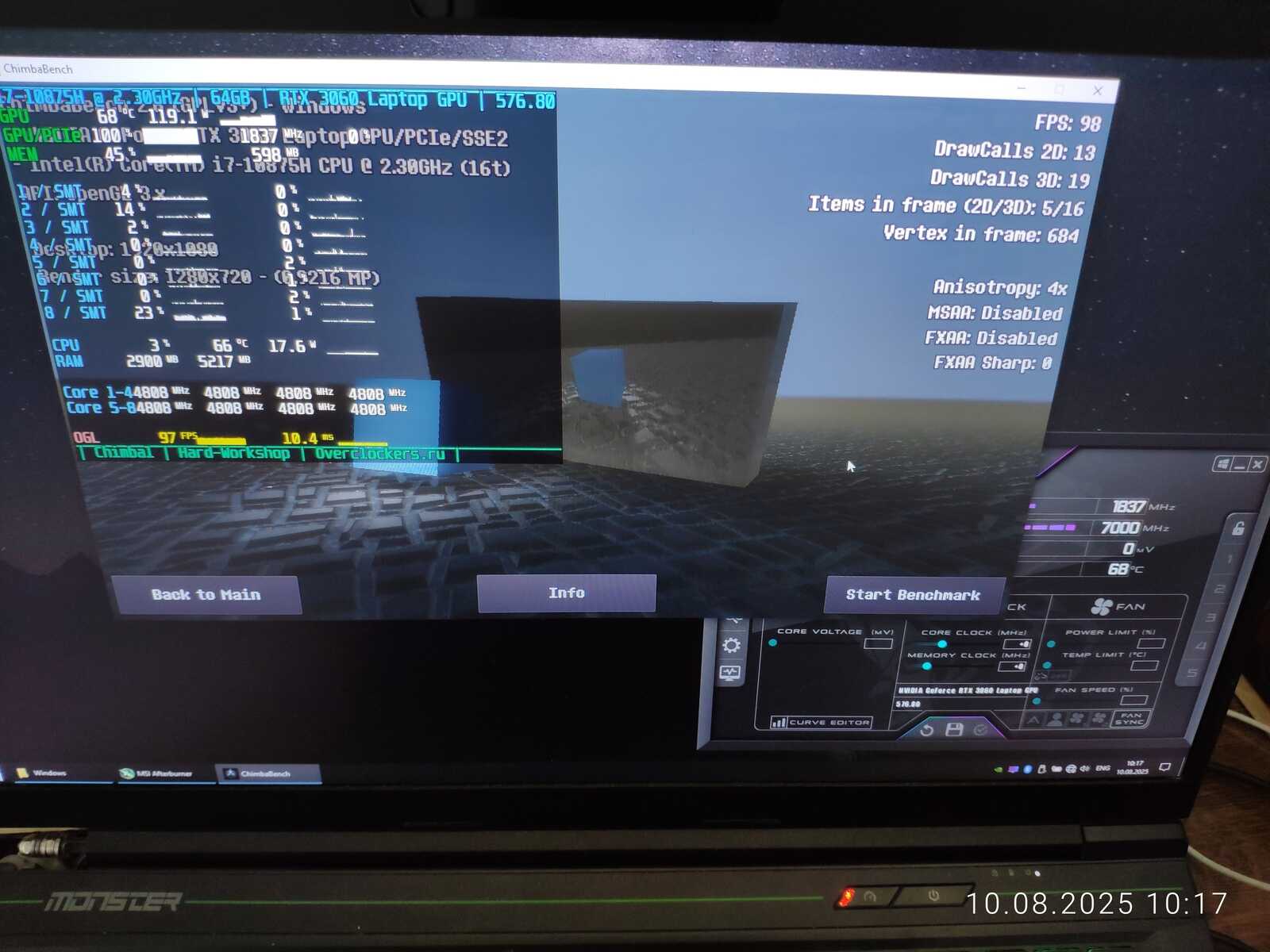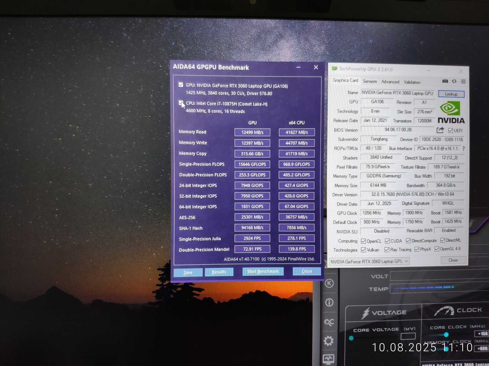 Тестовый ноутбук состоит из процессора Intel Core i7-10875H и видеокарты NVIDIA GeForce RTX 3060 Mobile на 6 GB. Так же на борту 64 GB оперативной памяти и два NVMe SSD. Для разгона буду использовать MSI Afterburner в среде Windows и контрольную панель NVIDIA в Linux.