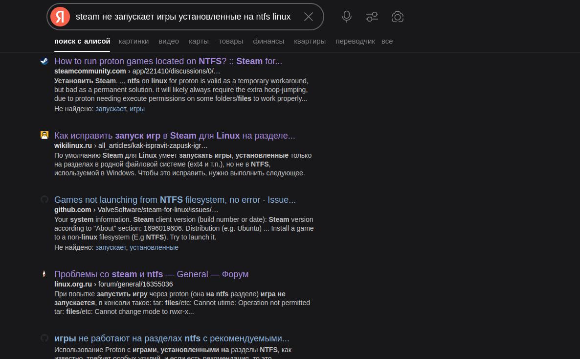 У меня просто нет возможности хранить игры в двух одинаковых экземплярах для Windows и Linux отдельно, чтобы костыль под названием Proton от Valve мог работать. Да, хвалёный запуск игр с помощью Steam Proton банально не работает, если игра установлена на диск со стандартной файловой системой NTFS.