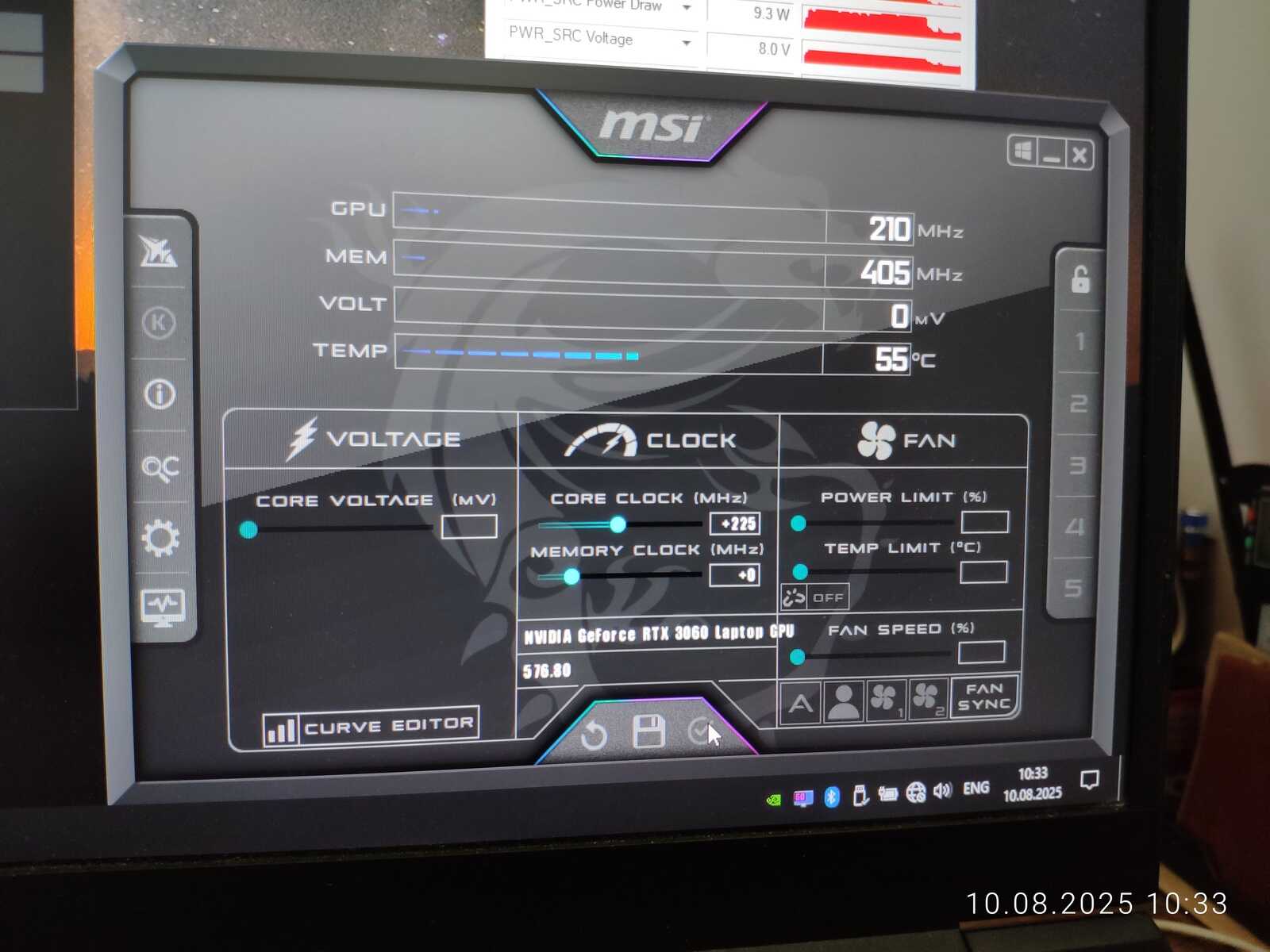 Хотя MSI Afterburner и не может трогать лимиты мощности, но в ноутбуке есть специальная кнопка, позволяющая регулировать режим работы. Офисный режим ограничивает процессор до 15 Вт, а видеокарту — до 55 Вт. Игровой режим уже позволяет видеокарте использовать до 95 Вт. Турбо режим даёт видеокарте до 120 Вт мощности.