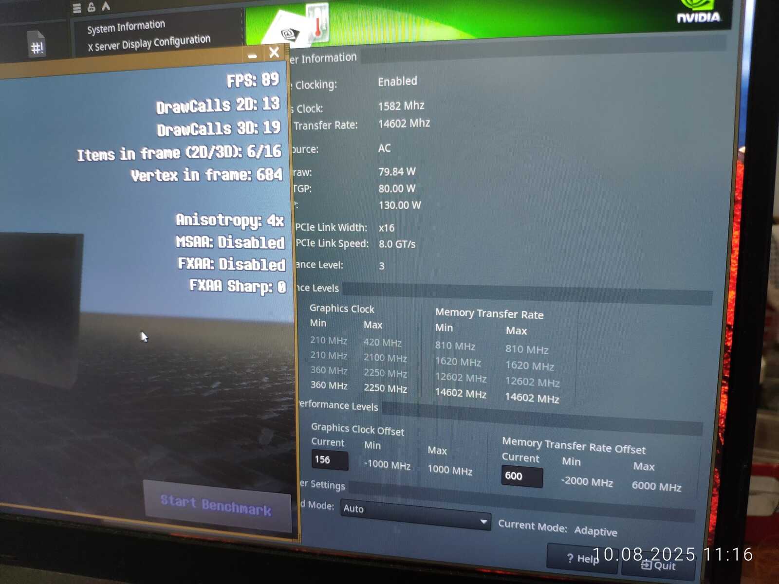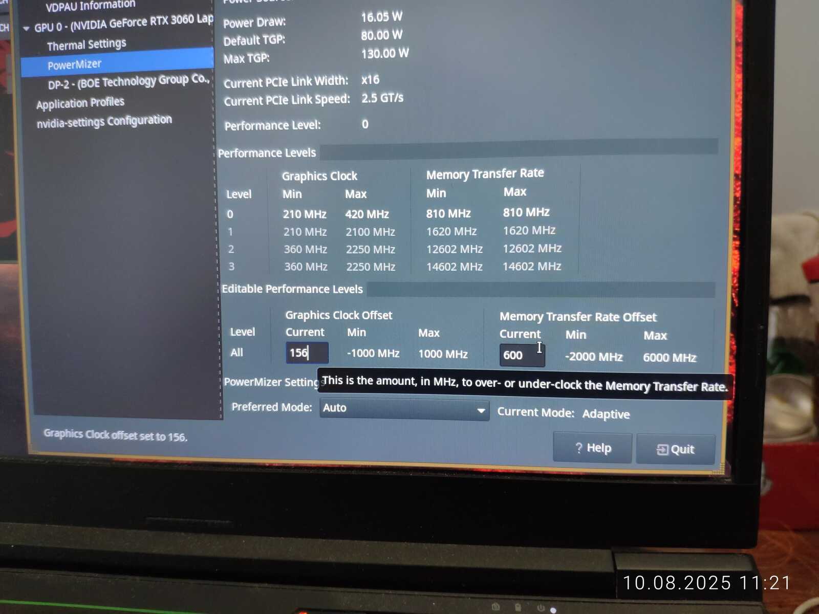 Эффективнее было бы повышать лимиты мощности для разгона. Но проблема в том, что вместо операционной системы используется Linux. Нет никаких доступных и рабочих способов изменения лимита мощности, хотя драйвер NVIDIA указывает максимальный доступный лимит в 130 Вт.