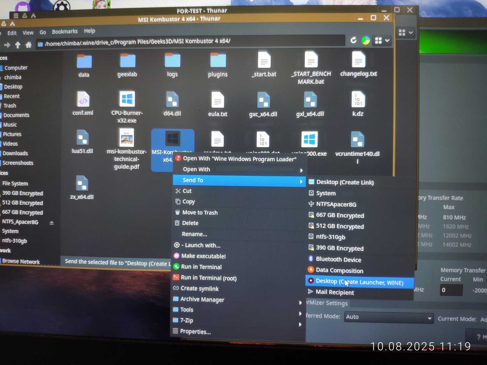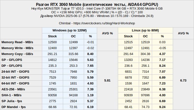 В синтетических тестах ChimbaBench и MSI Kmbustor результаты получились довольно вялые. В среде Windows разгон добавил чуть меньше трёх процентов. В среде Linux уже добавилось три с половиной процента к результатам.