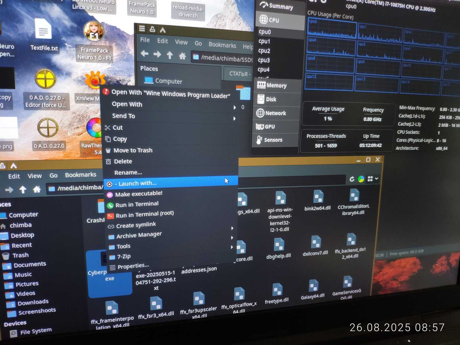 В моём же дистрибутиве Chimbalix установлен модифицированный WINE, имеющий гораздо лучшую совместимость с играми, чем стандартный. Установлены прослойки DXVK и VKD3D разных версий. Ещё была разработана специальная функция в контекстном меню для запуска софта (игр) с модификаторами, что избавляет от массы типичных для Linux танцев с бубном.
