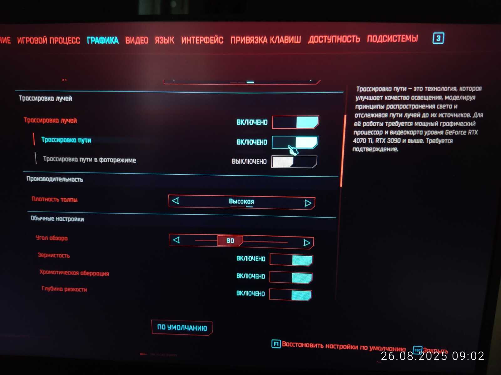 Path-Tracing — ресурсоёмкая технология, но знаете, я лучше включу технологию масштабирования и пожертвую fps, чем буду смотреть на висящие в воздухе диваны и мутные пятна вместо отражений на глянцевых поверхностях.