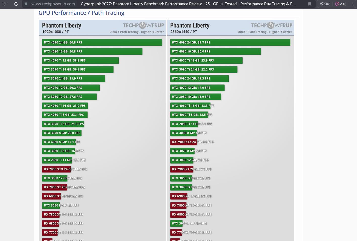 Подавляющее большинство видеокарт AMD вообще не тянут Path-Tracing. И, судя по всему, моя RTX 3060 Mobile будет на уровне между Radeon RX 6900 XT и RX 7900 XT. Довольно неплохо.