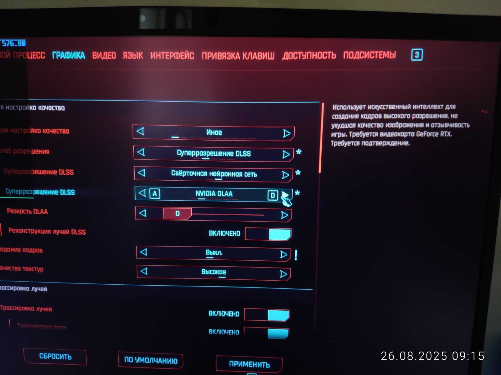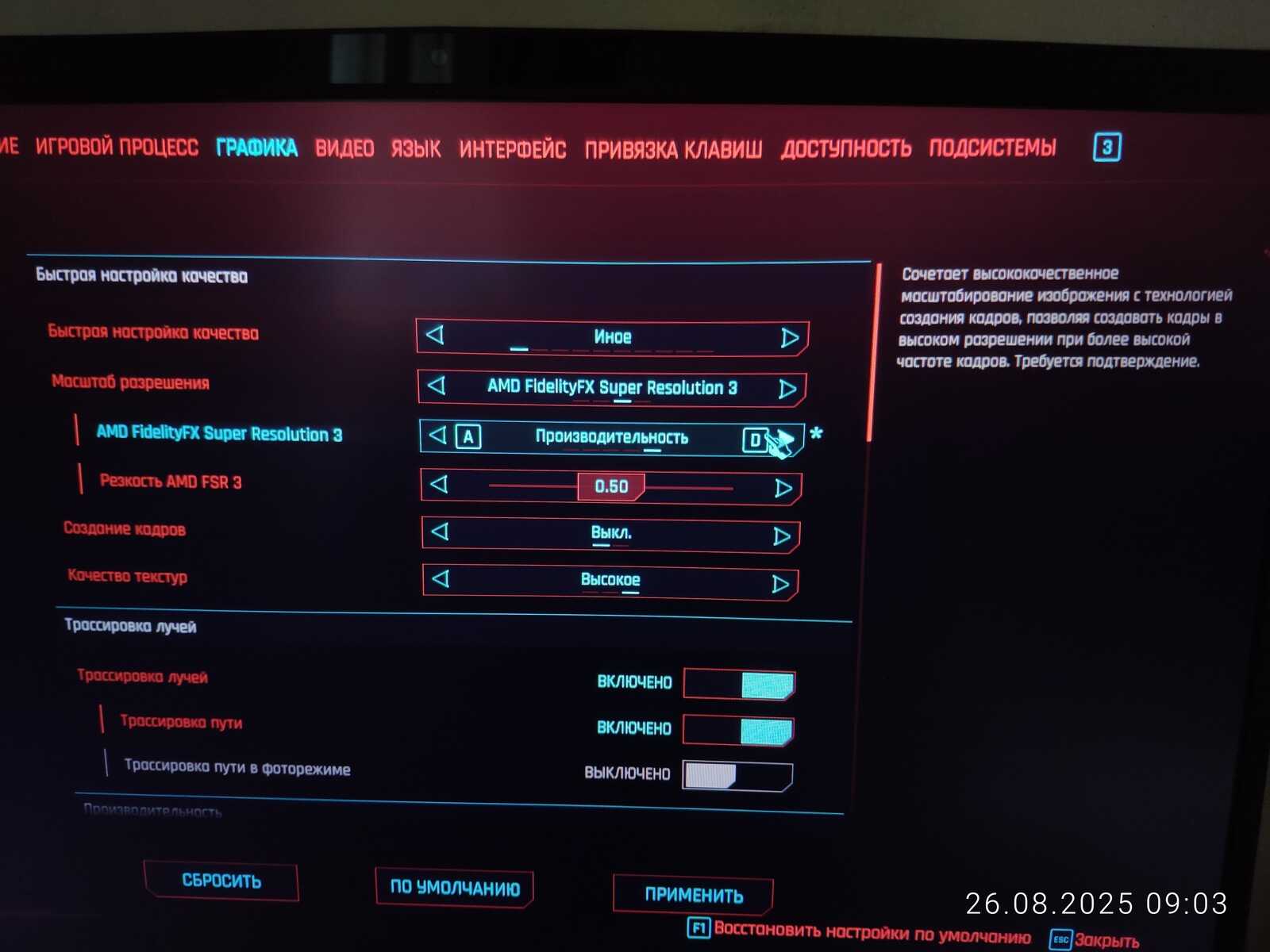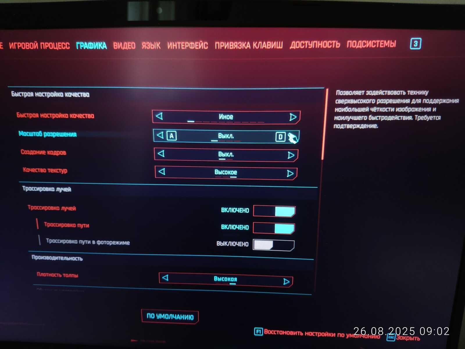 Вернёмся к настройкам. В игре Cyberpunk 2077 доступны разные методы масштабирования. AMD FSR выдаёт довольно паршивую картинку. Но почему не проверить?