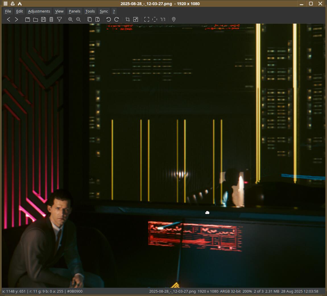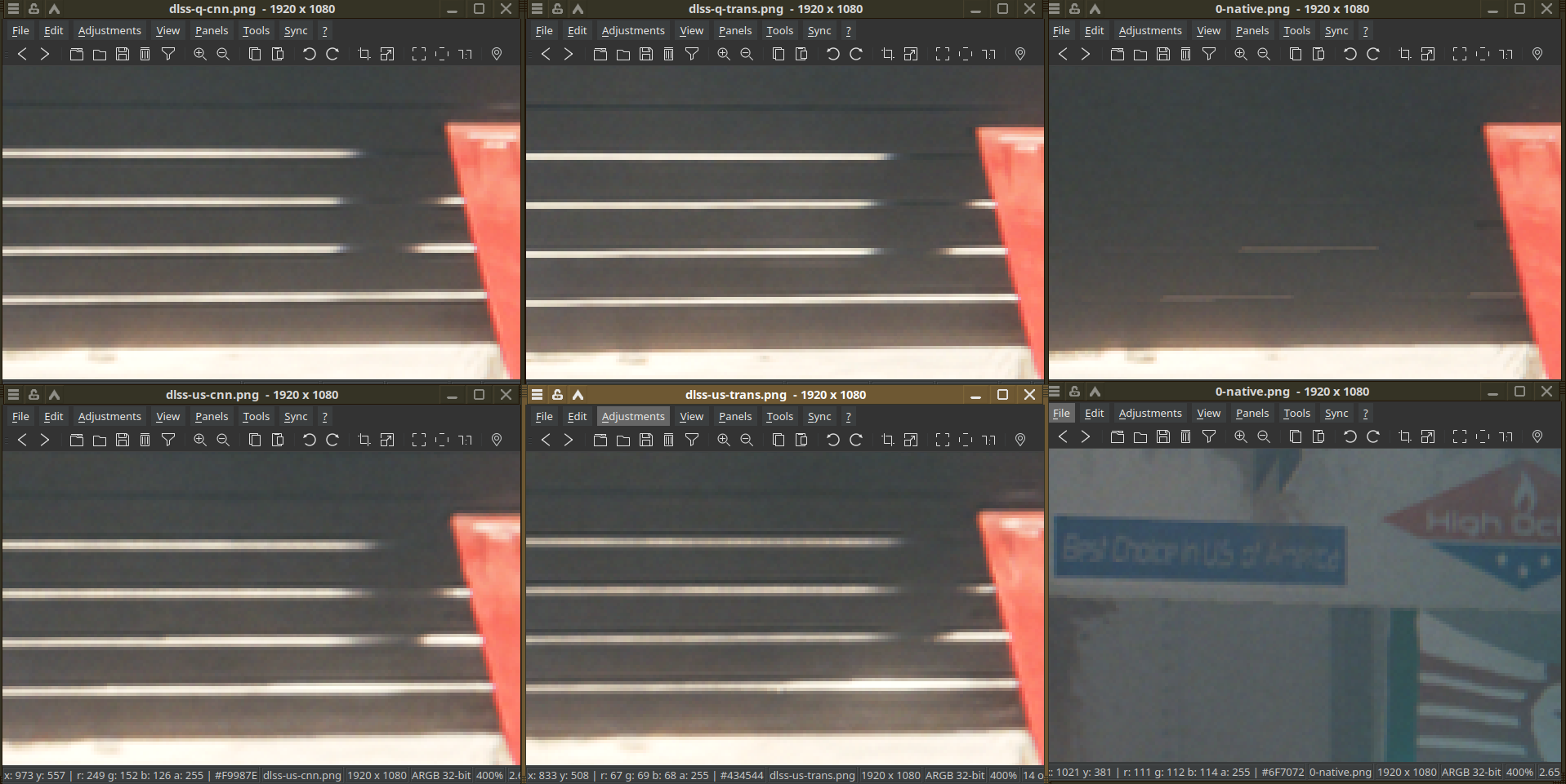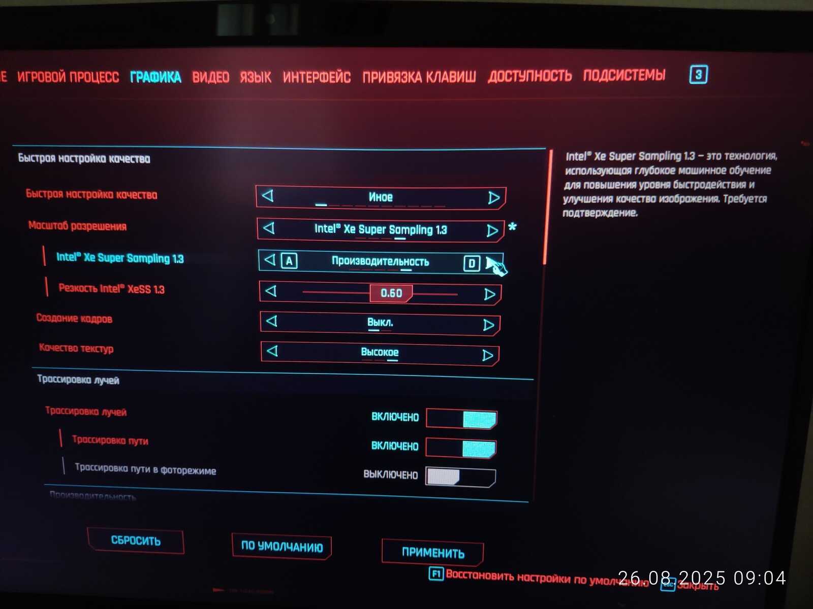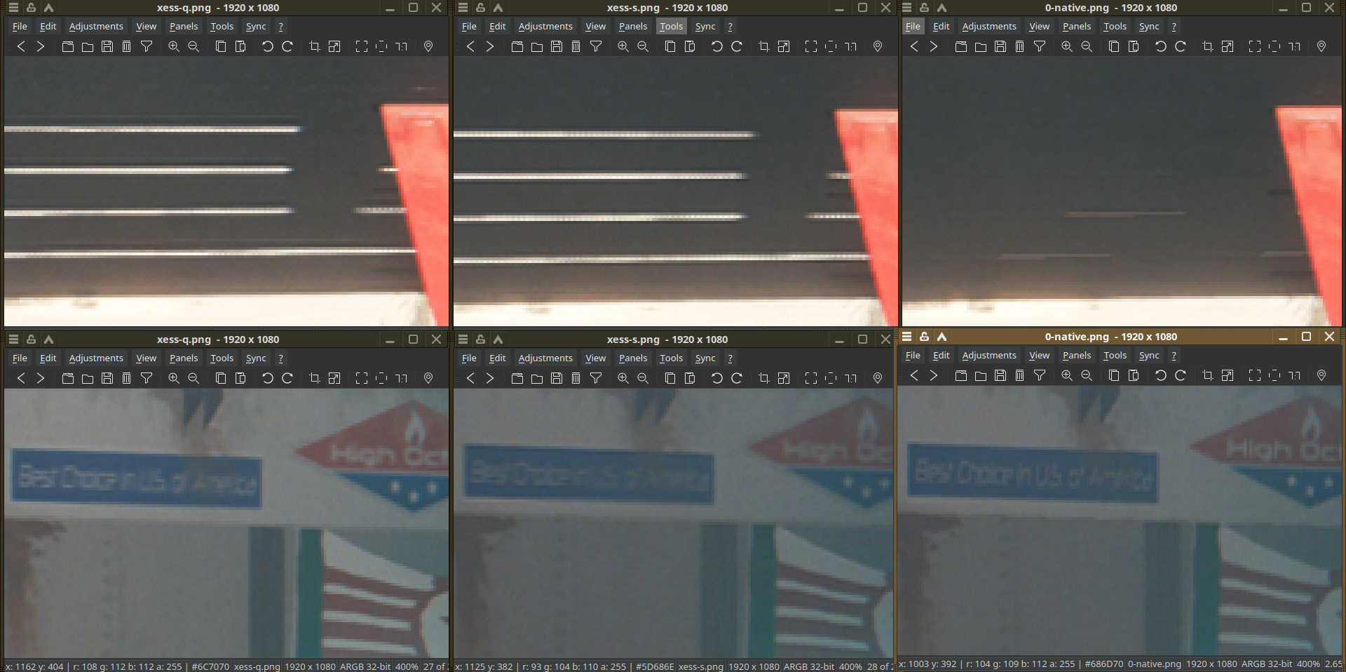 Intel XeSS — самый качественный и приятный алгоритм масштабирования из доступных в среде Linux. Текст на табличках остаётся относительно читаемым даже в низком качестве. Никакой тряски и артефактов графики. Просто хорошо работающий алгоритм, в отличие от «творений» AMD.