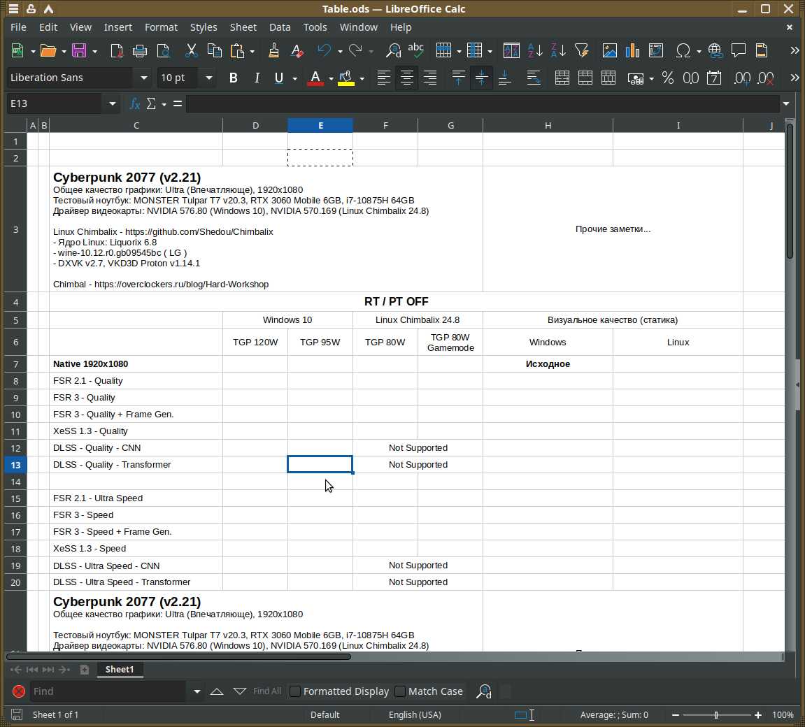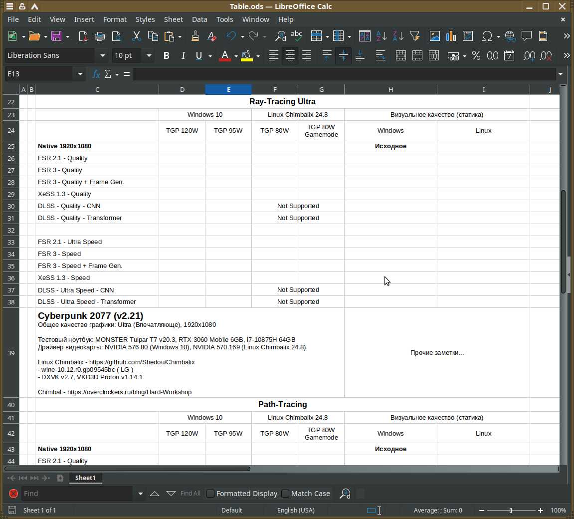 Так же заранее подготовлю таблицу для результатов тестирования. Обычно я это делаю после сбора данных, но сейчас другой случай... Если пару десятков простых результатов можно и без заметок собрать, то сейчас нужно собирать с разными параметрами трассировки лучей и масштабирования, а так же не забыть сделать скриншоты для сравнения качества графики.