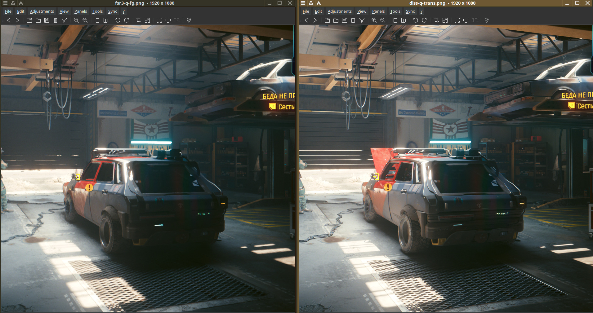 Слева — FSR 3 с генерацией кадров, справа — DLSS. Куда потерялся кусок машины с технологиями AMD? Про качество вообще молчу. Поделка Красного лагеря и близко не стоит с NVIDIA DLSS. Даже тени какие-то мутные при использовании FSR. Будто настройки графики в ноль снижает.