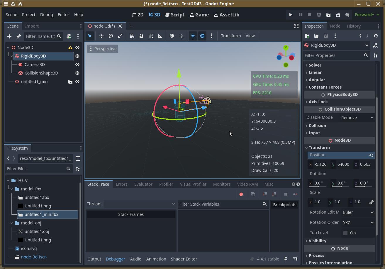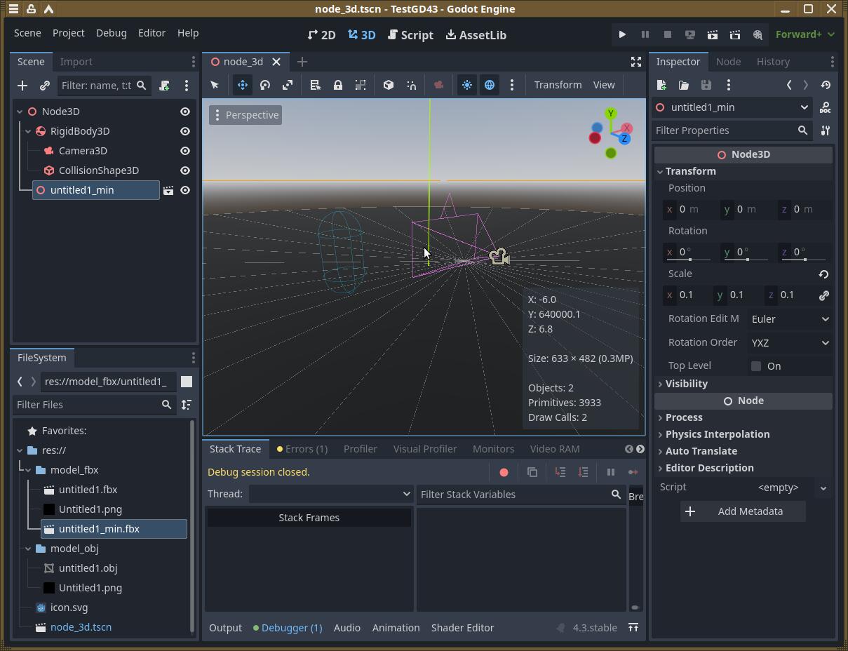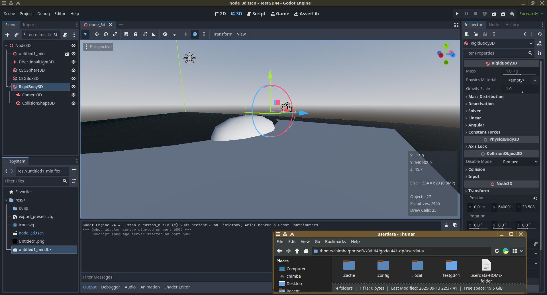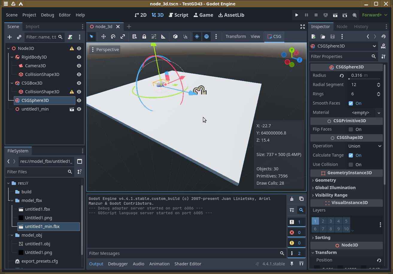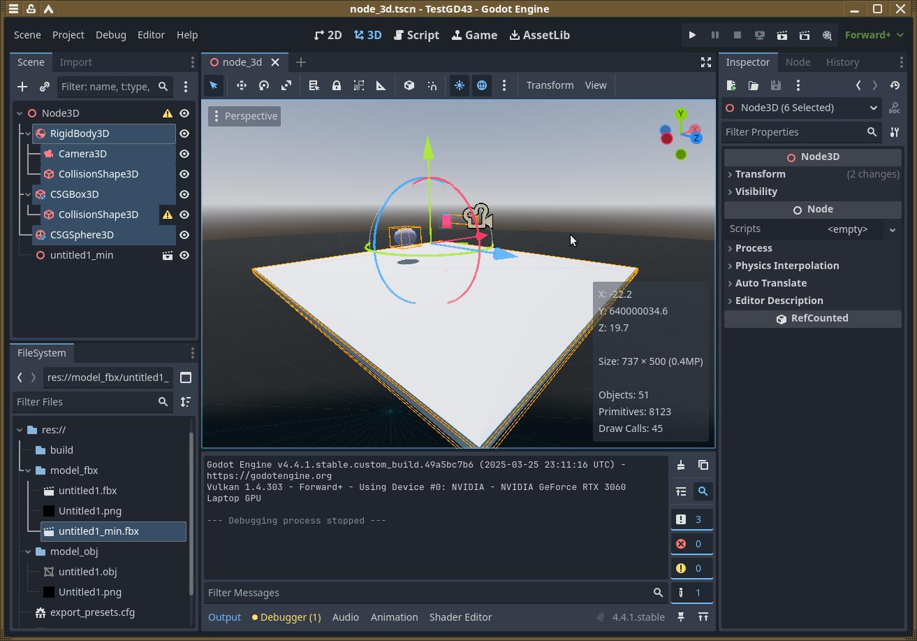 Осталось проверить функционал экспорта проекта. Обычные шаблоны тут подойдут, но возникнут проблемы с точностью после экспорта игры. Потому подкидываю скомпилированный шаблон с двойной точностью. При смене физического движка происходит сохранение и перезапуск редактора, но сцена сохраняется неправильно... Будто Godot пытается центрировать объекты по координатам в низкой точности. Пришлось перенести камеру на внушительное расстояние, чтобы она оказалась не на одной координате с платформой.