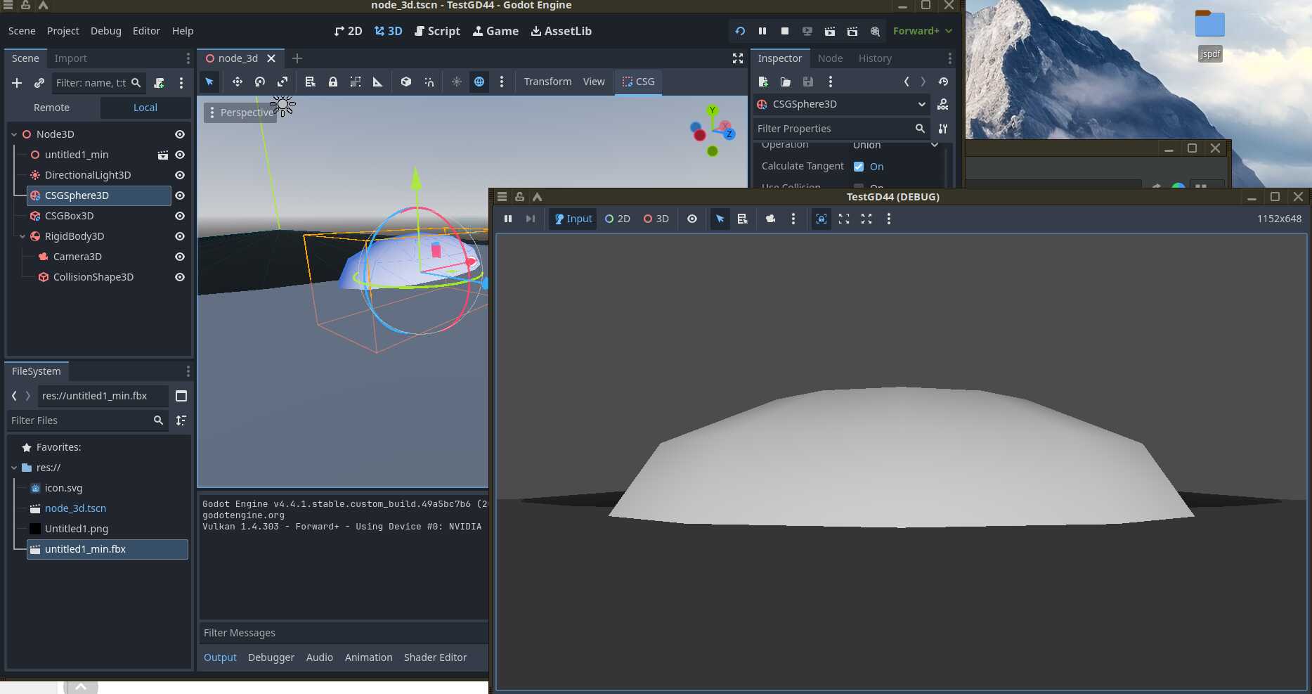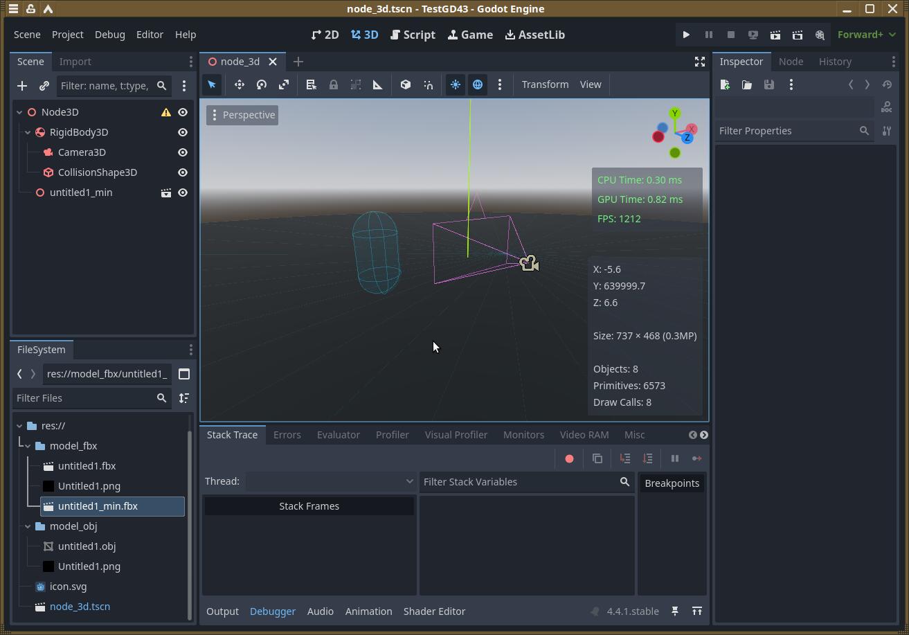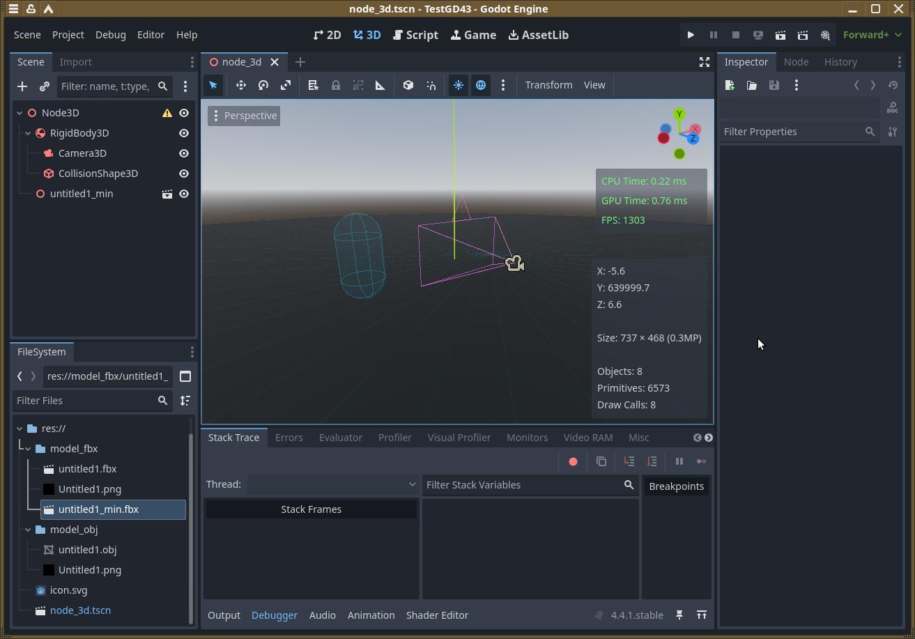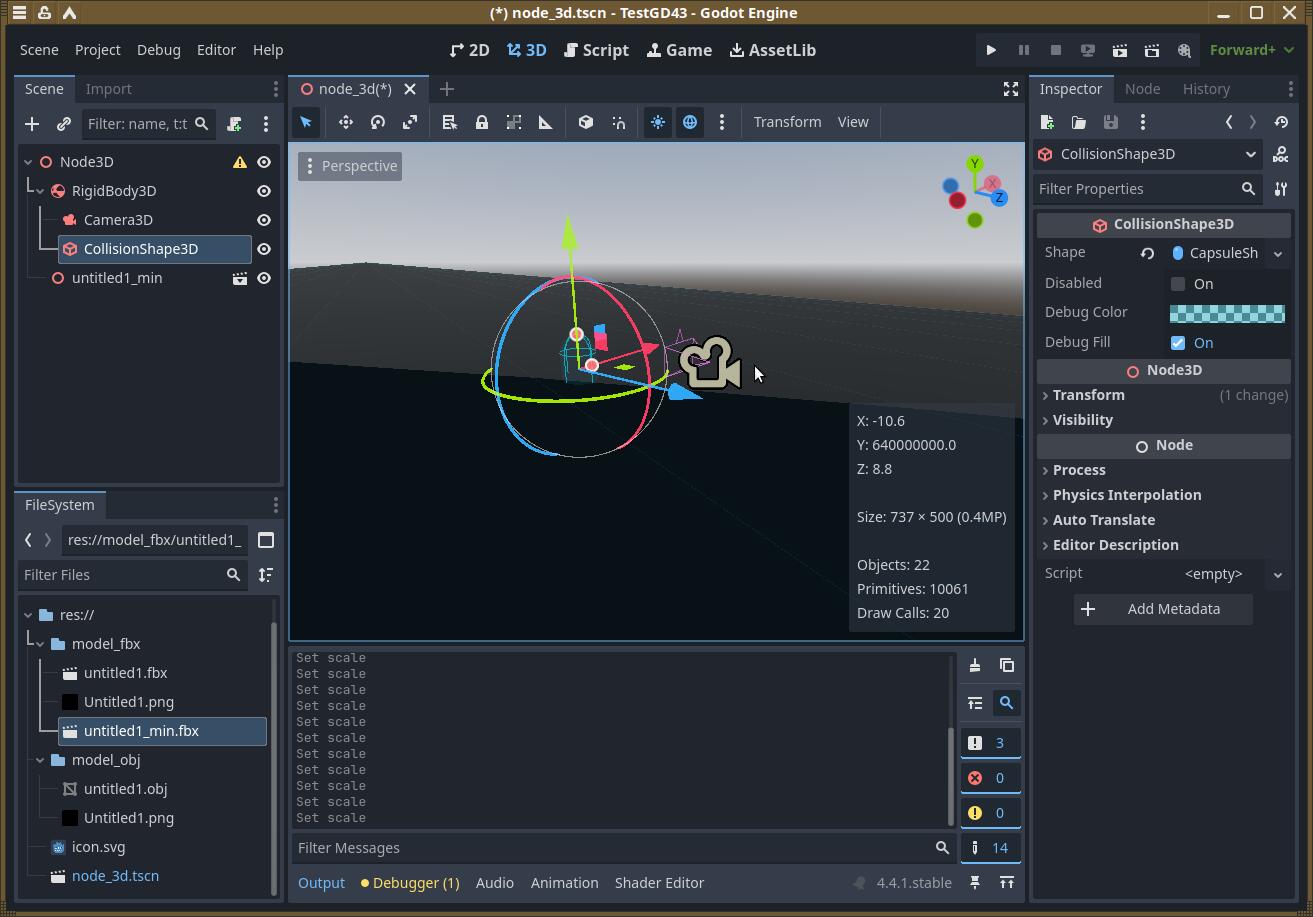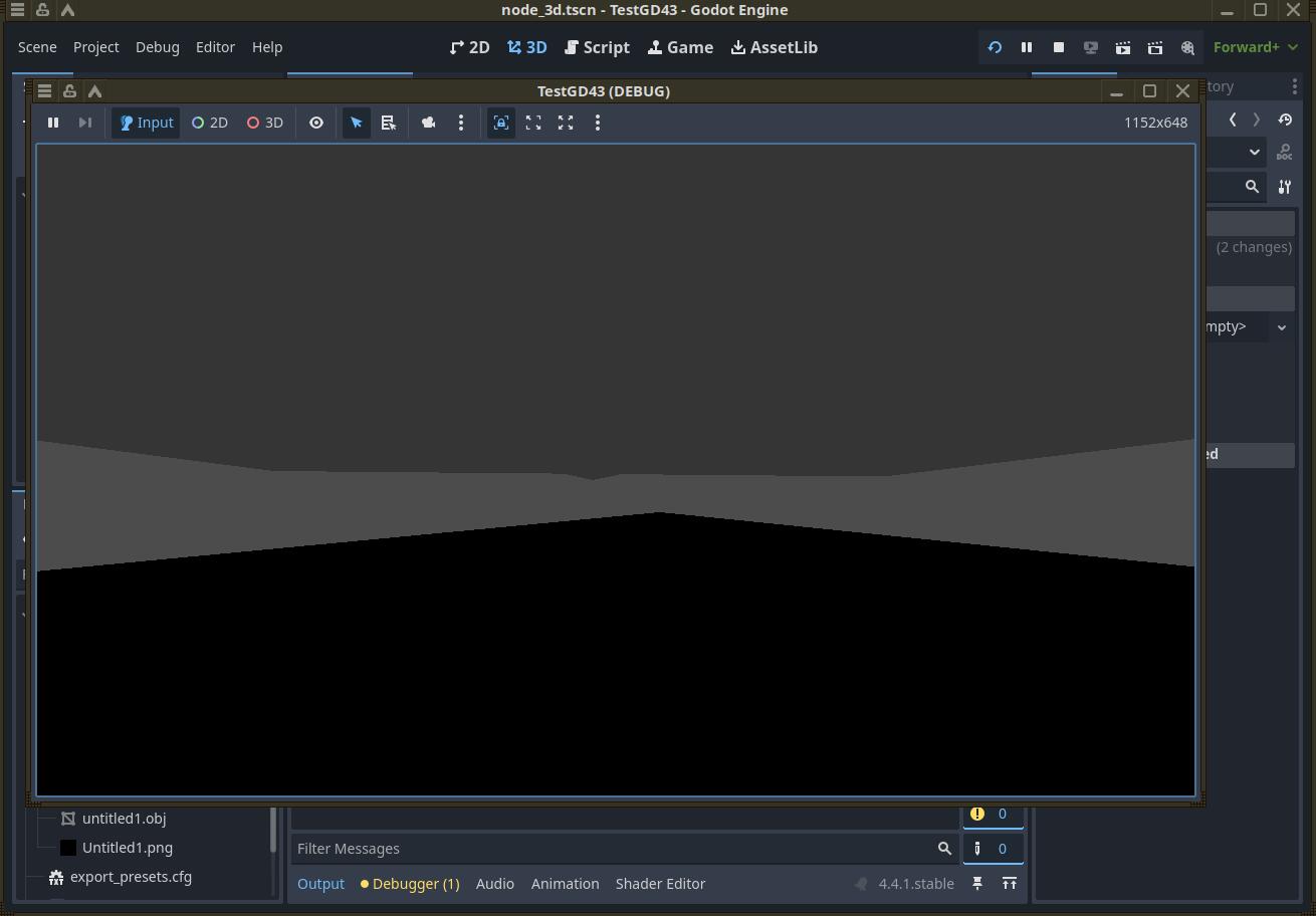 Осталось проверить функционал экспорта проекта. Обычные шаблоны тут подойдут, но возникнут проблемы с точностью после экспорта игры. Потому подкидываю скомпилированный шаблон с двойной точностью. При смене физического движка происходит сохранение и перезапуск редактора, но сцена сохраняется неправильно... Будто Godot пытается центрировать объекты по координатам в низкой точности. Пришлось перенести камеру на внушительное расстояние, чтобы она оказалась не на одной координате с платформой.