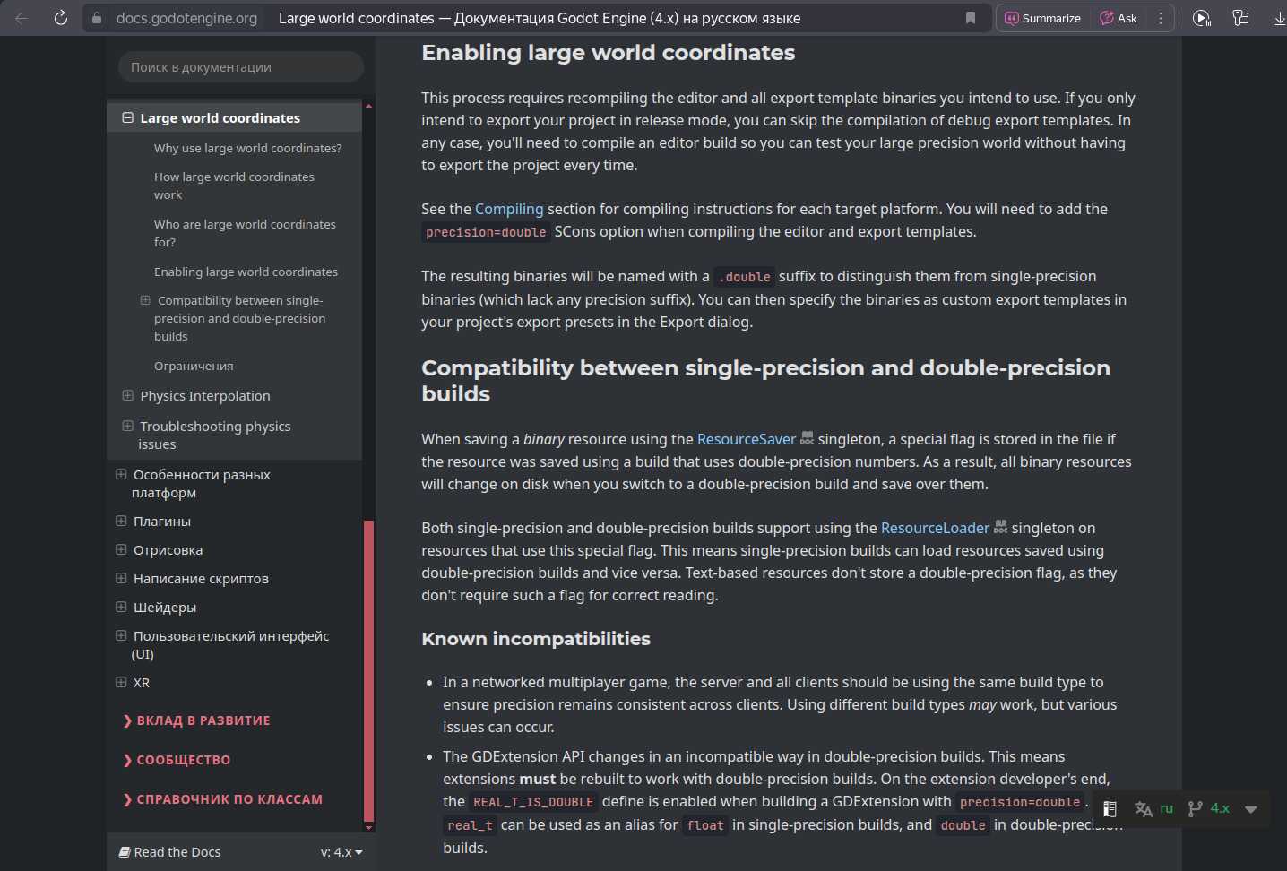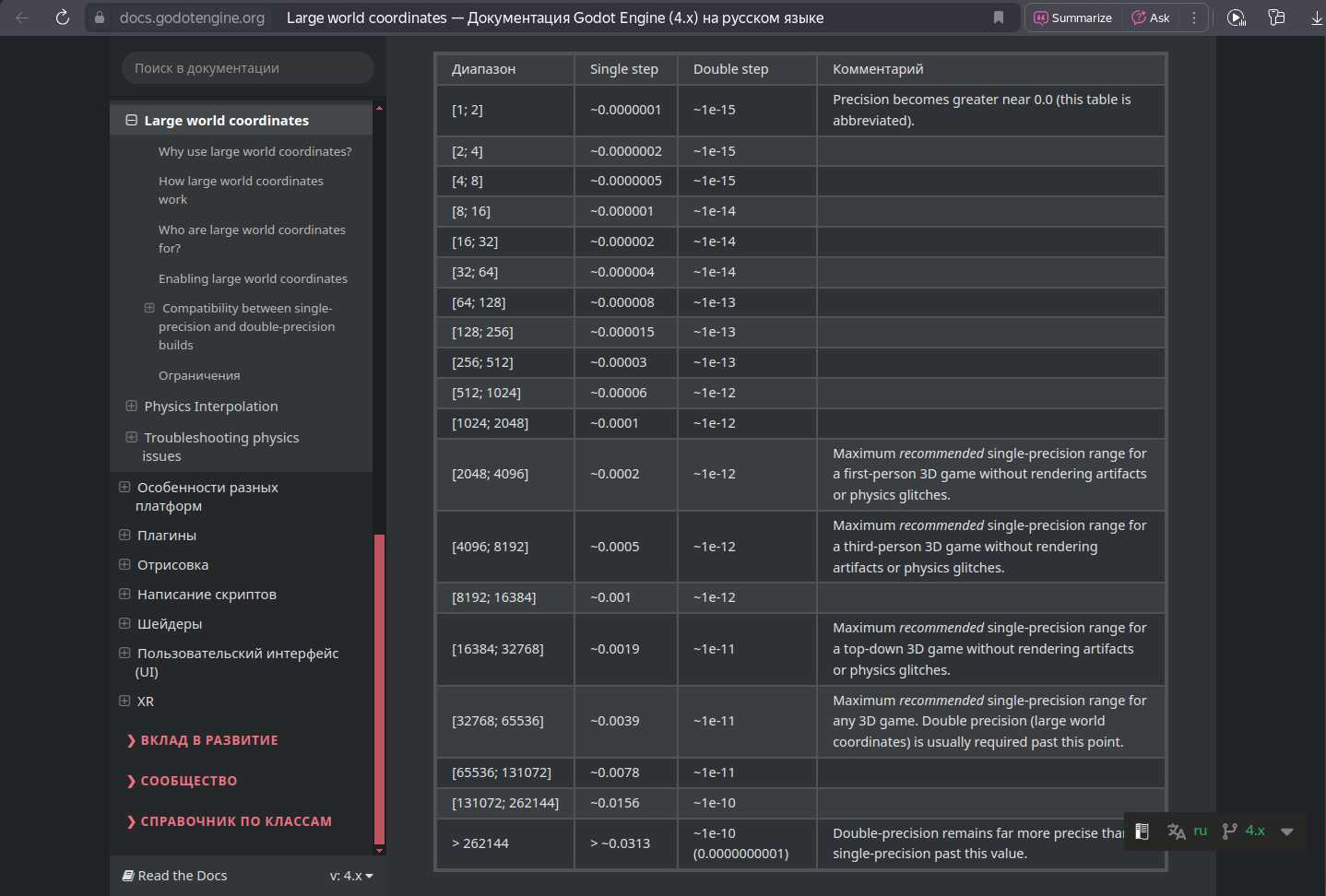 Это, конечно, довольно печальный уровень точности. До уровня Unreal Engine очень далеко. Но намного лучше того, что предоставляют разработчики игрового движка в разделе загрузок на официальном сайте. Полагаю, теперь Godot будет нормально работать примерно до пяти миллионов единиц по координатам игрового мира.