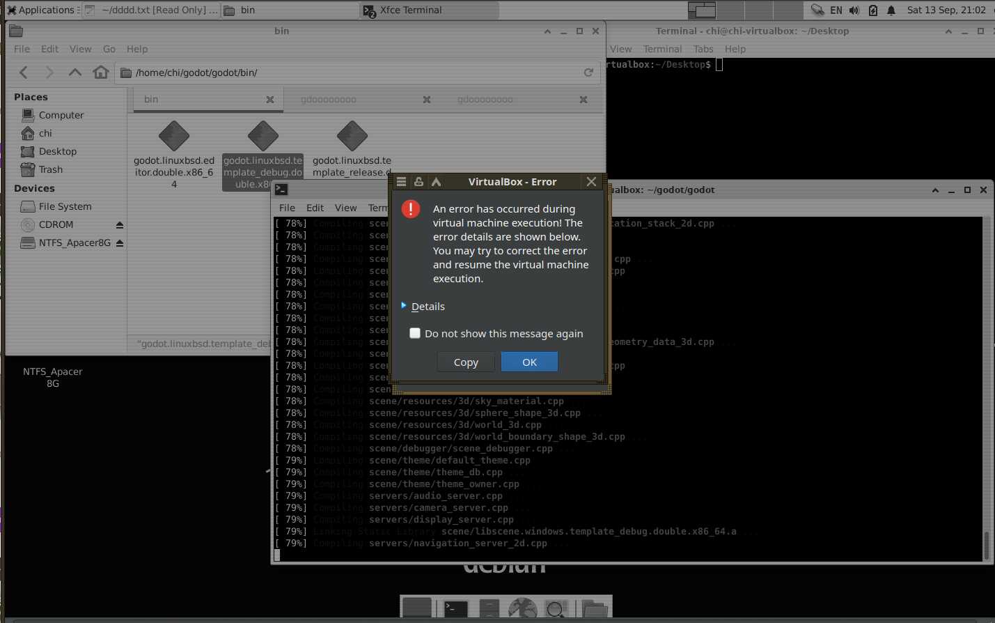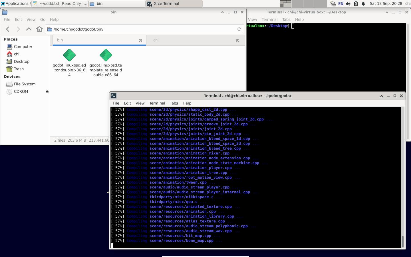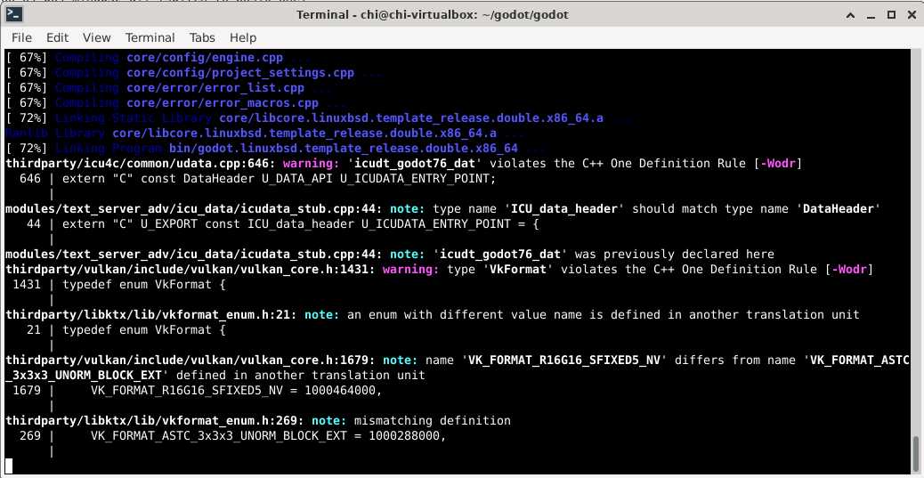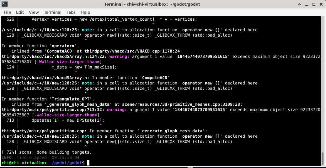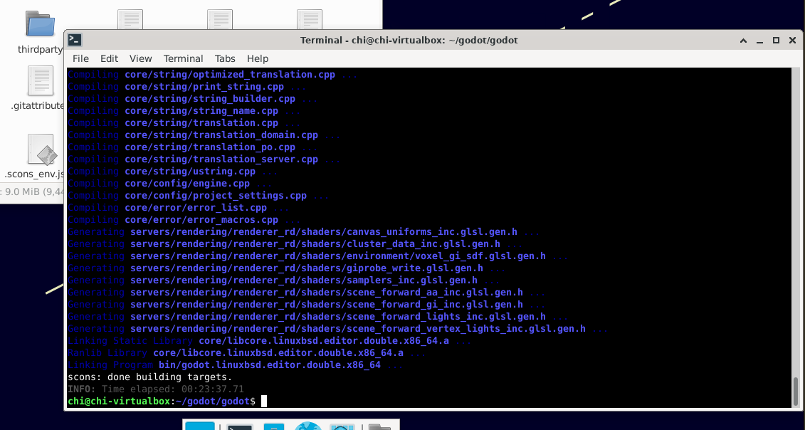 Ладно, ладно... Пошла компиляция! На удивление, это не самый мракобесный процесс компиляции софта. Я бы даже похвалил разработчиков Godot Engine за относительную простоту компиляции исходного кода. Жаль, они не удосужились это сделать вместо меня, пользователя...