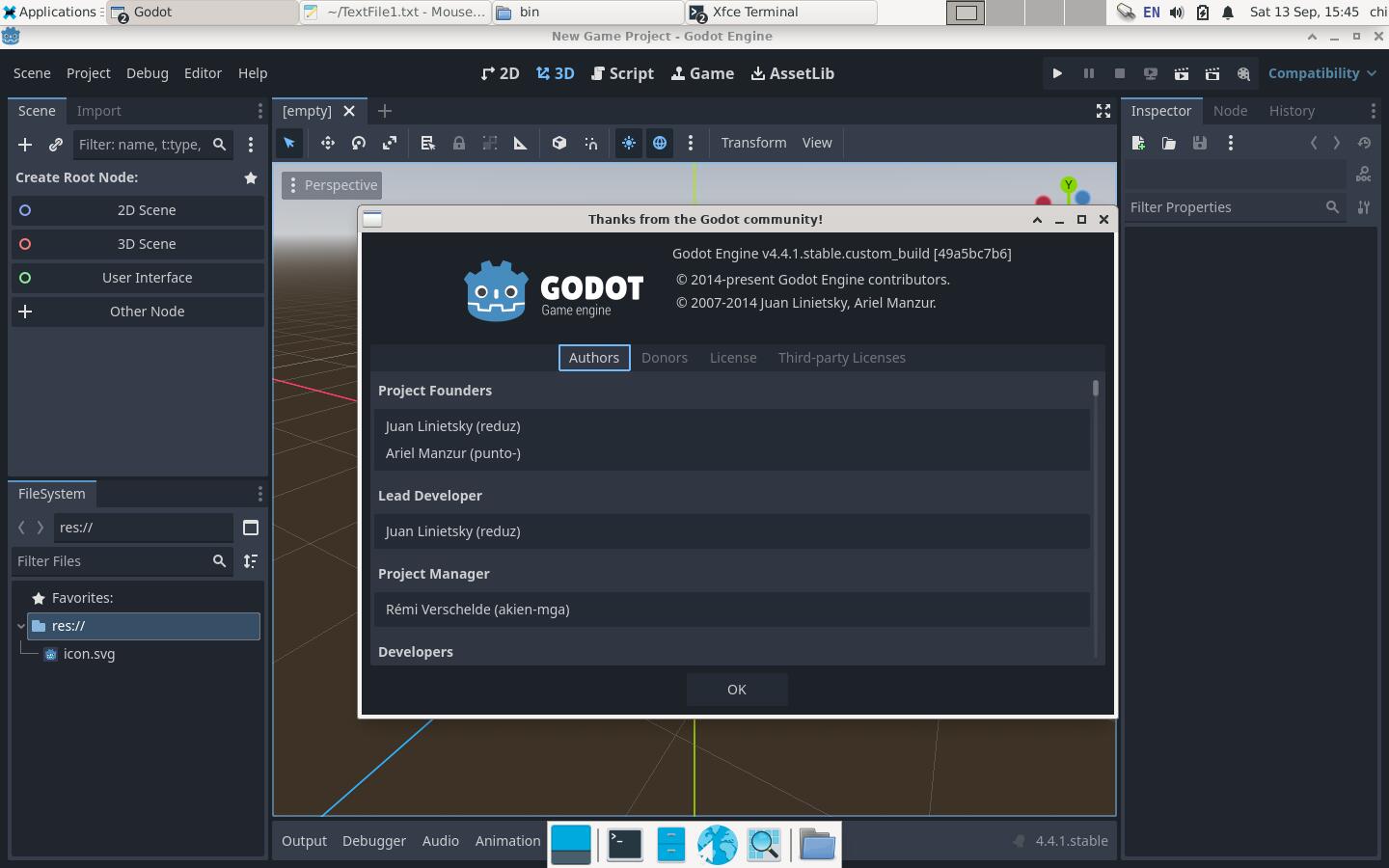 А потом скомпилировал заново редактор Godot с параметром Production, ибо с ним меньше весит и быстрее работает. Так написано в инструкциях. Короче, в общей сложности потрачено больше двух часов времени на компиляцию игрового движка из исходного кода, включая создание виртуальной машины и подбор подходящего Линукса. Даже не знаю, был ли смысл компилировать с флагом Production? Размер слегка меньше, а запускается, на глаз, одинаково.