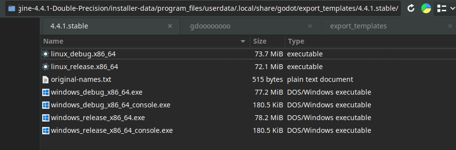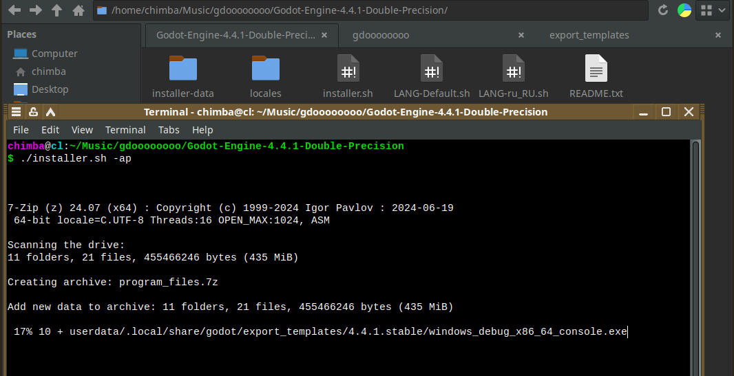 Чтобы мои труды не потерялись зря, было решено упаковать скомпилированный Godot Engine Double Precision в распространяемый формат Installer-SH. Первым делом копирую шаблон экспорта в локальный домашний каталог. Изначально я думал оставить программу на свободе, но потом передумал. Лучше пусть сидит в своей песочнице, тем более мусорит довольно много.