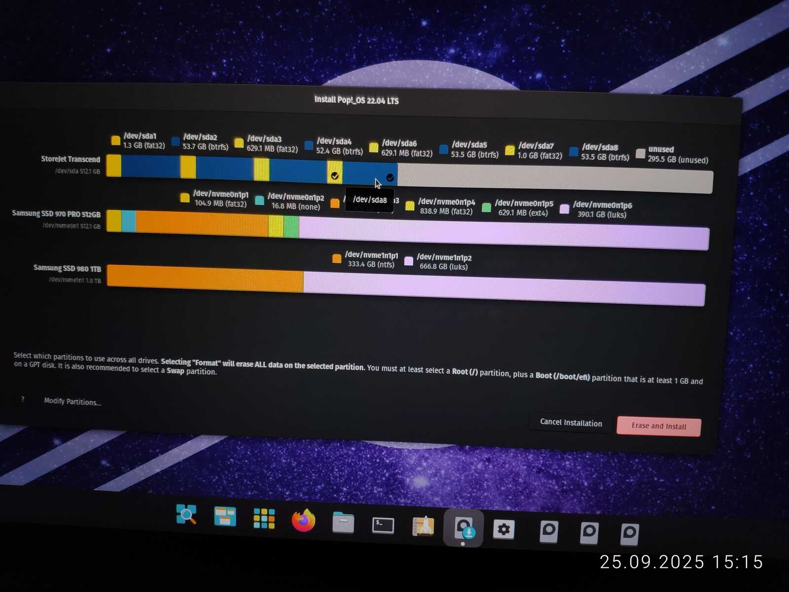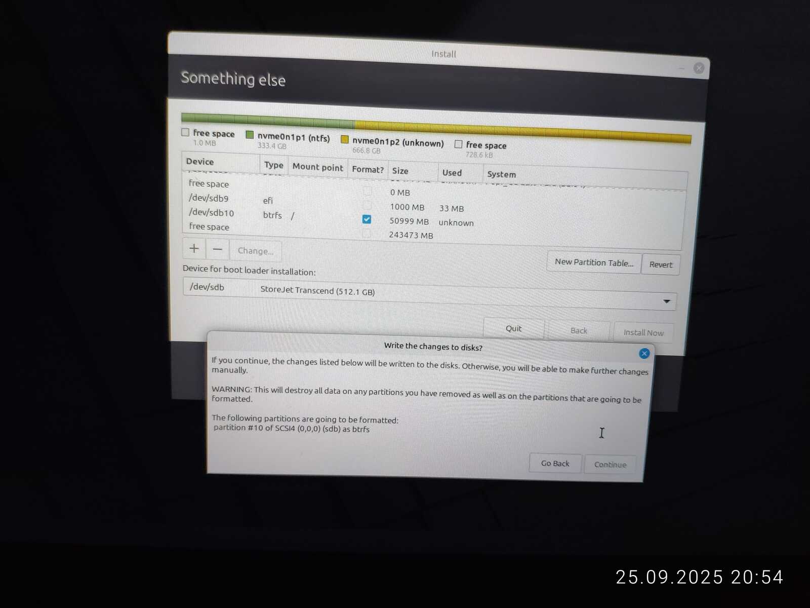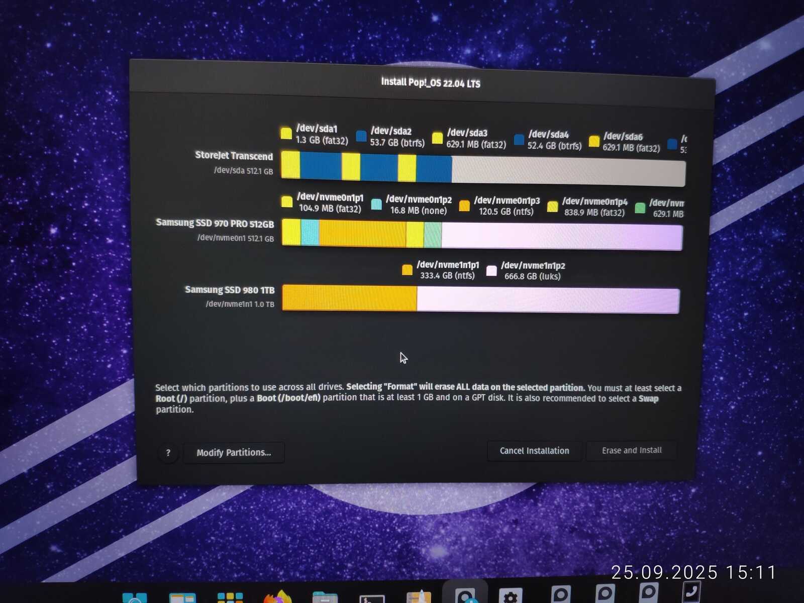 Остаётся только ещё раз устанавливать и молиться, чтобы всё получилось при следующем эксперименте с параметрами загрузчика. Это тот случай, когда Линукс требует стереть весь диск для установки в полностью автоматическом режиме, ибо чёрт ногу сломит в редакторе разделов «простого и дружелюбного» Linux Mint.