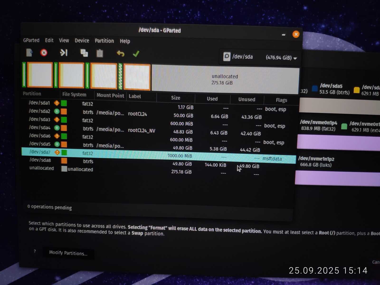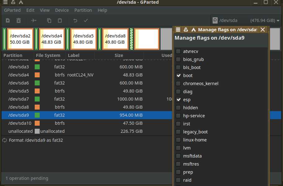 И тут я подумал: Если загрузчик Linux Mint настолько кривой, может просто починить его инструментами от дистрибутива Chimbalix? Форматирую ESP раздел в положенную файловую систему FAT32. Проверяю флаги и тип раздела.