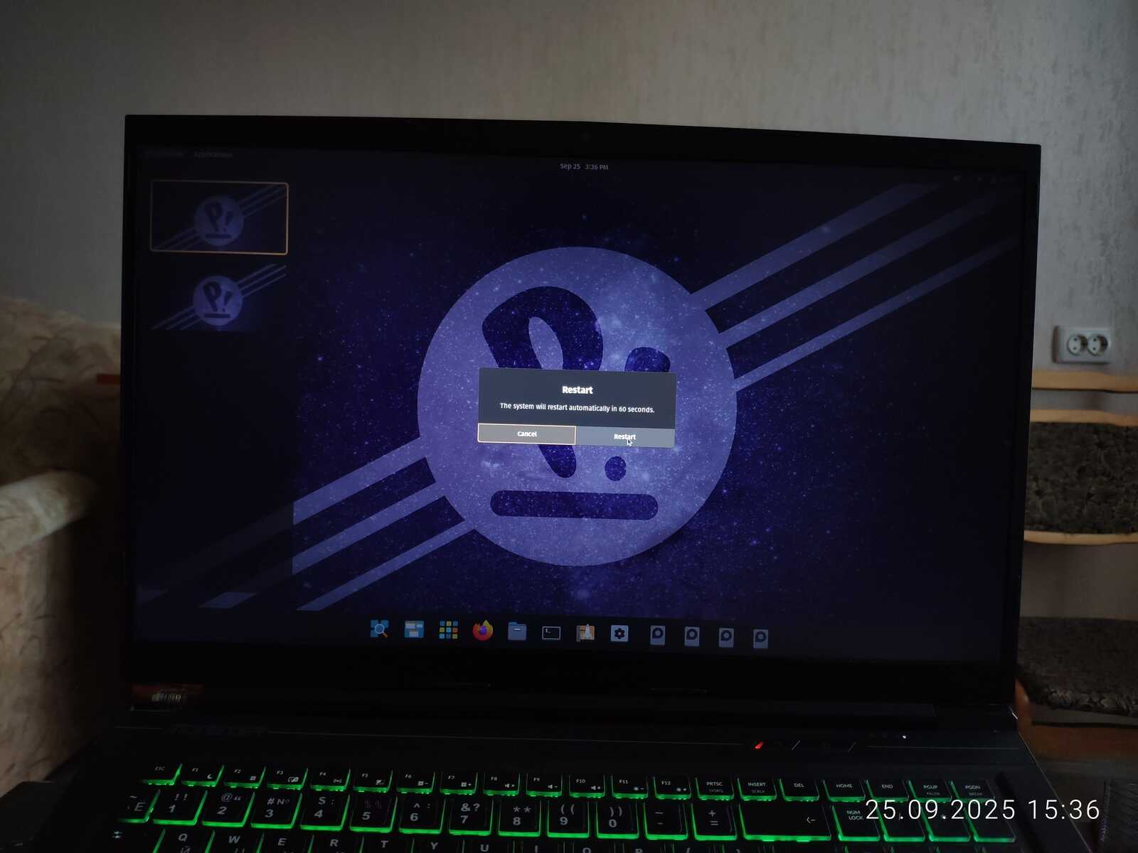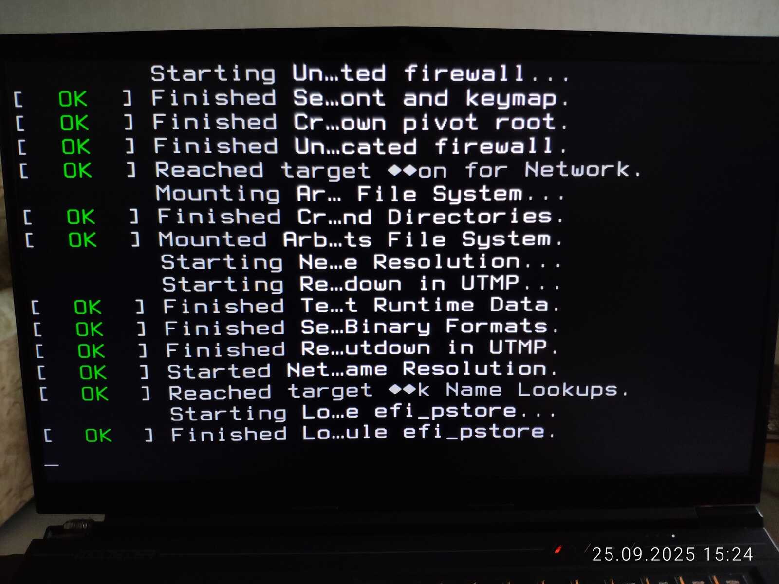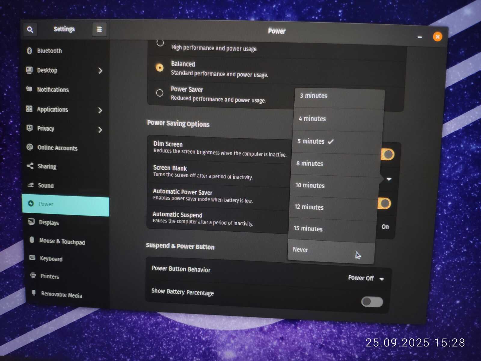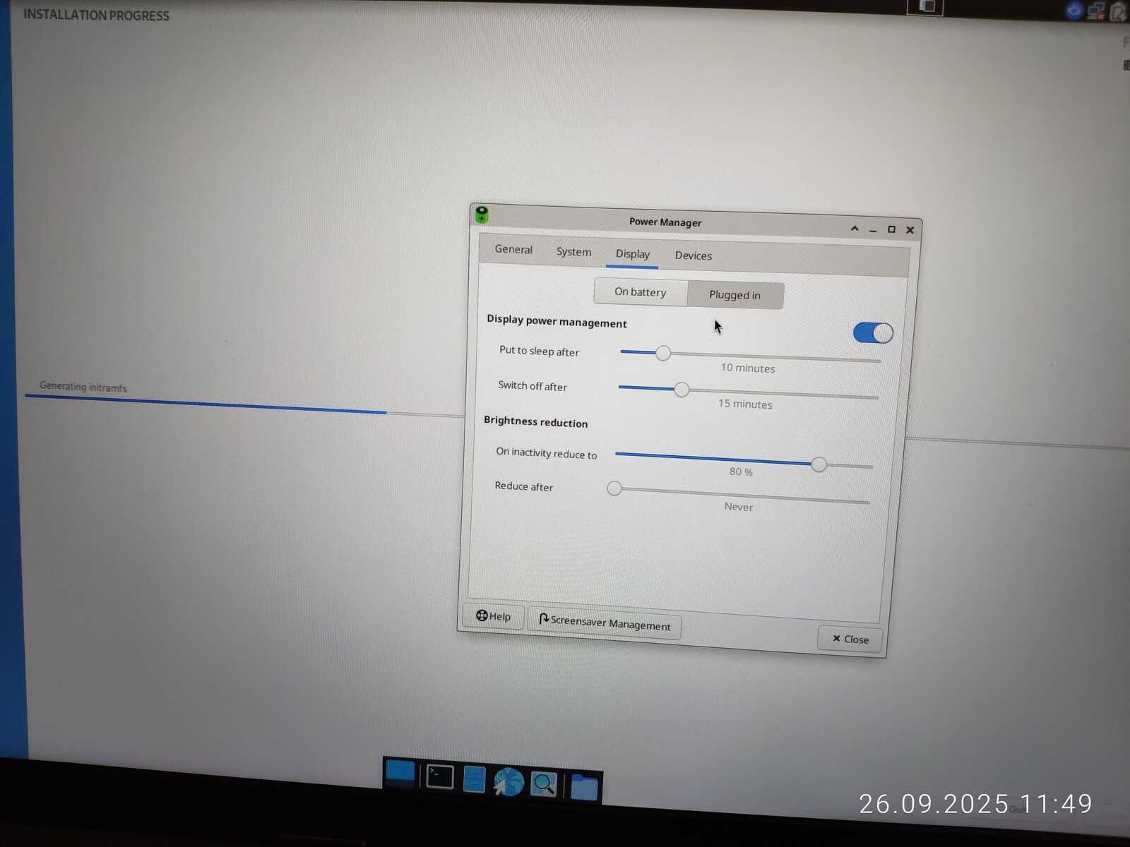 А ещё система неадекватно настроена. Прямо в процессе установки экран затенялся, всем видом показывая, что хочет уйти в спящий режим. Это очень плохо, особенно учитывая, что у Линуксов порой бывают серьёзные проблемы со спящим режимом. Спасибо вечно кривому ядру Linux за это.