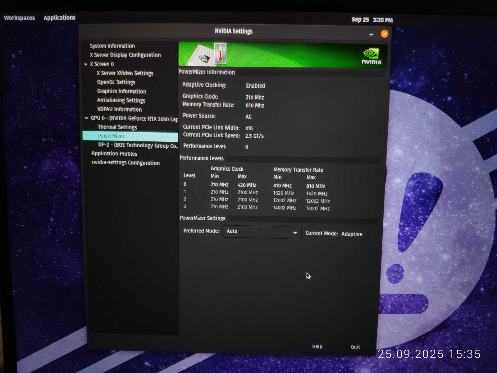 А что там с прибитым к системе драйвером NVIDIA? Вижу 580 версию, но она какая-то ущербная. Нет вкладки Vulkan в разделе информации, да и раздел PowerMizer какой-то кастрированный. Нет важной информации и функций разгона.