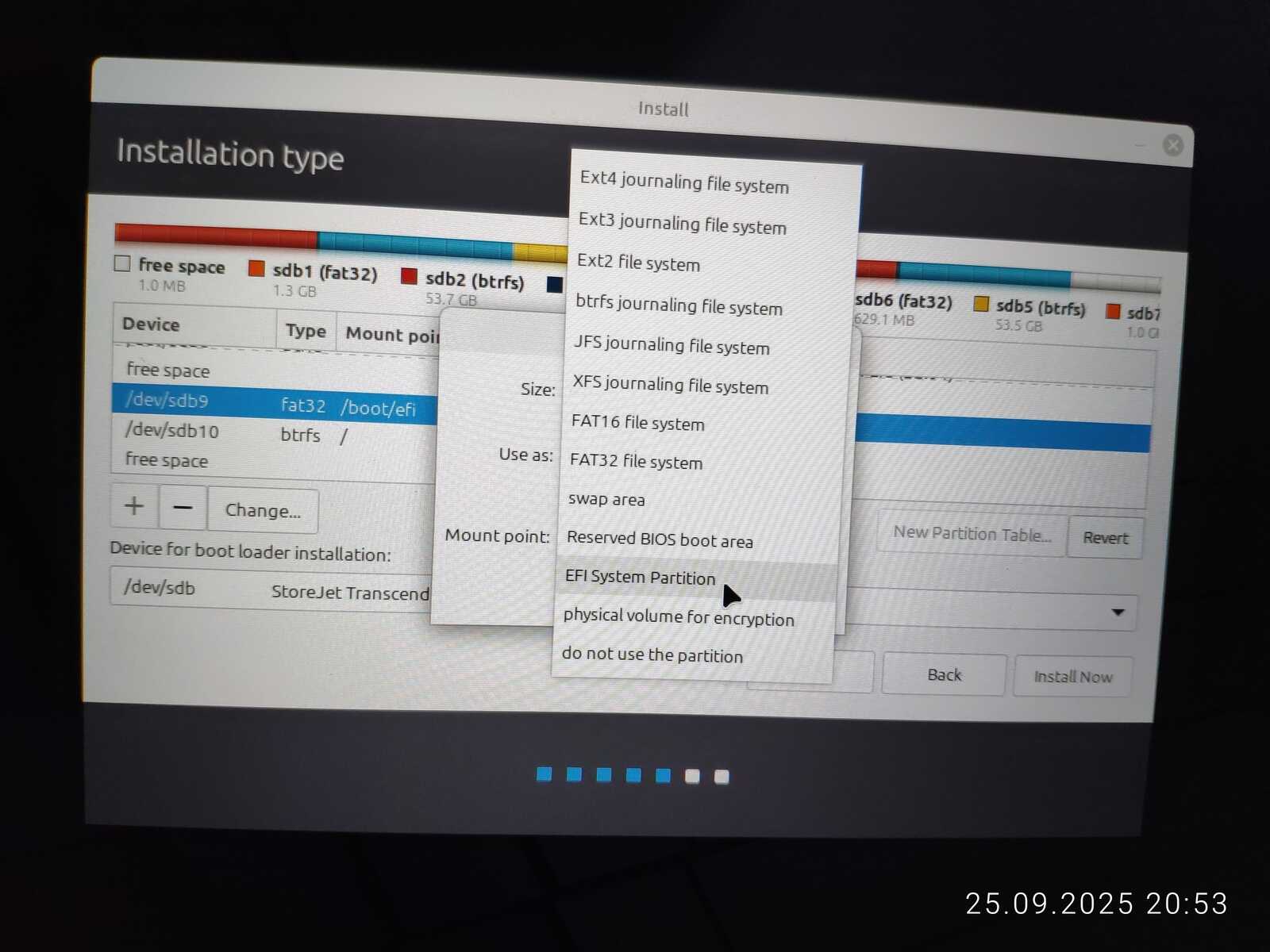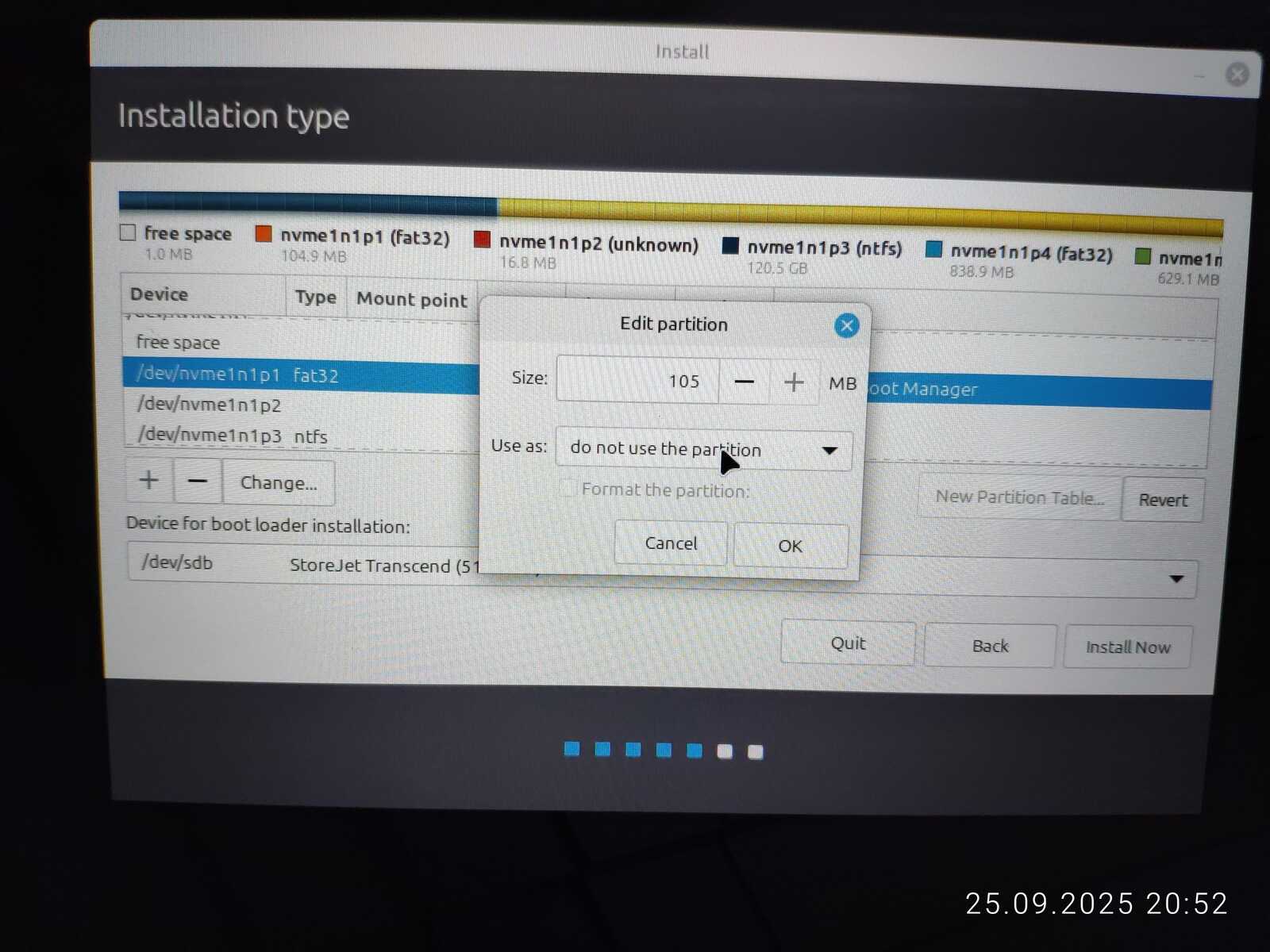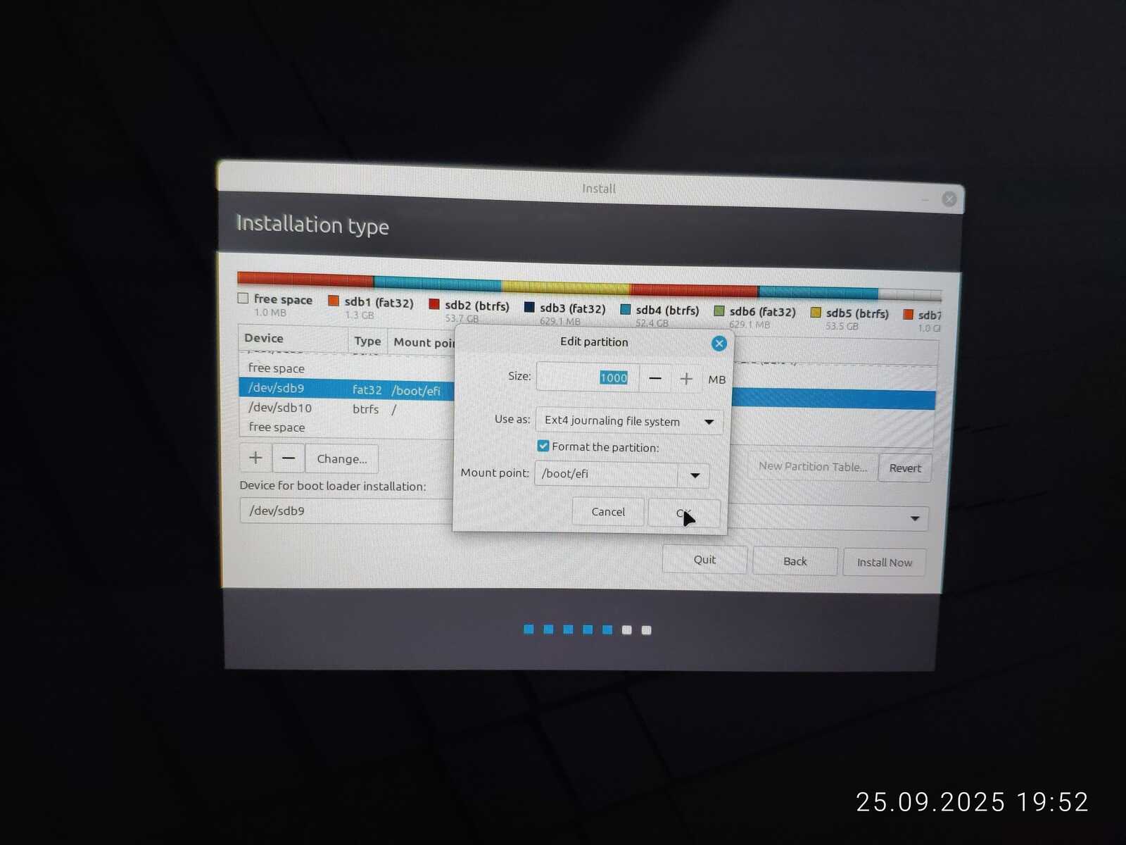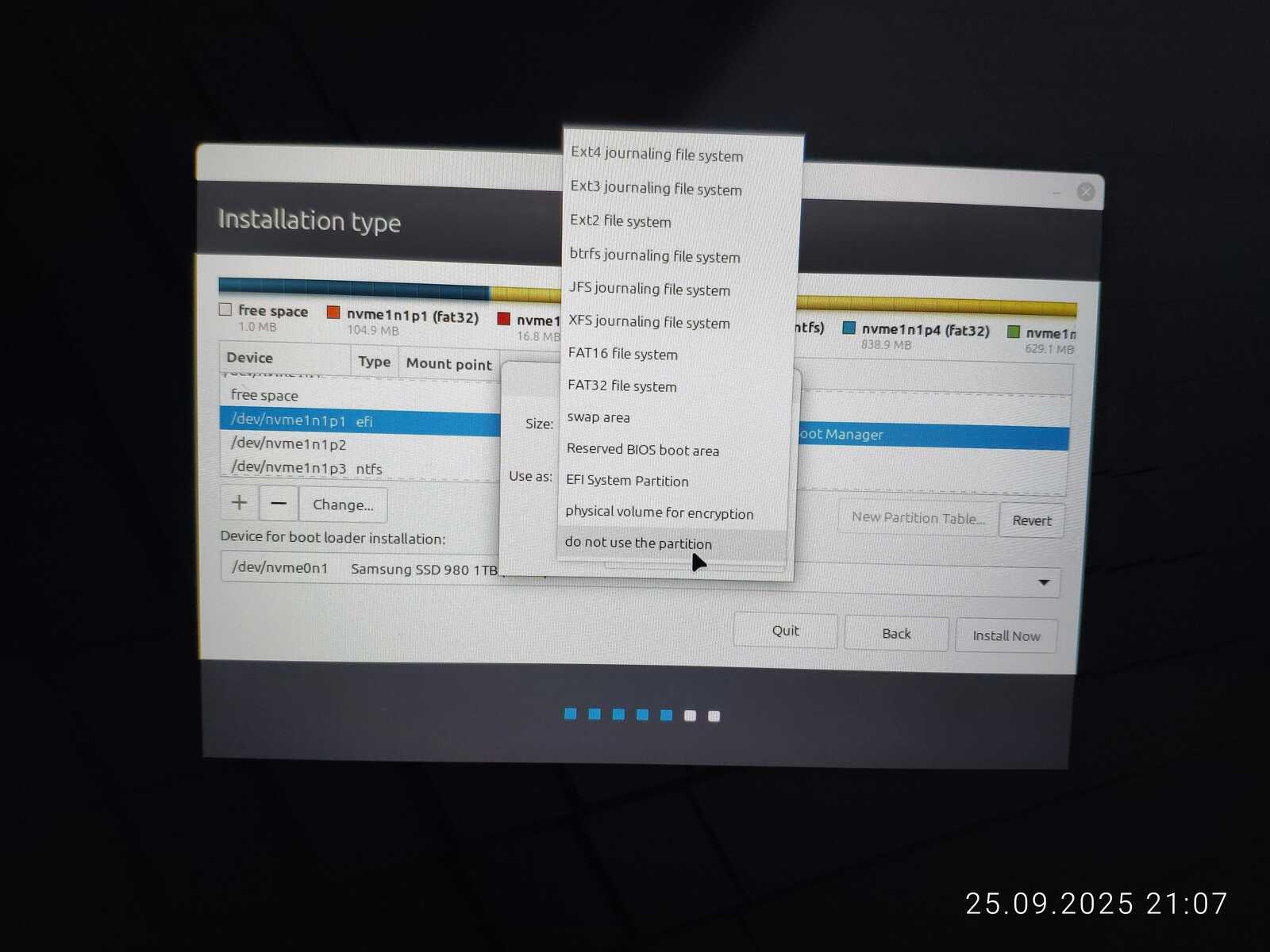 Опять занимаюсь снятием галочек с каждого EFI раздела, чтобы оставить только необходимый. Опять пытаюсь установить. Ну не хочу я уничтожать пять установленных операционных систем ради одного Linux Mint, отдавая всё во власть программы автоматической разметки.
