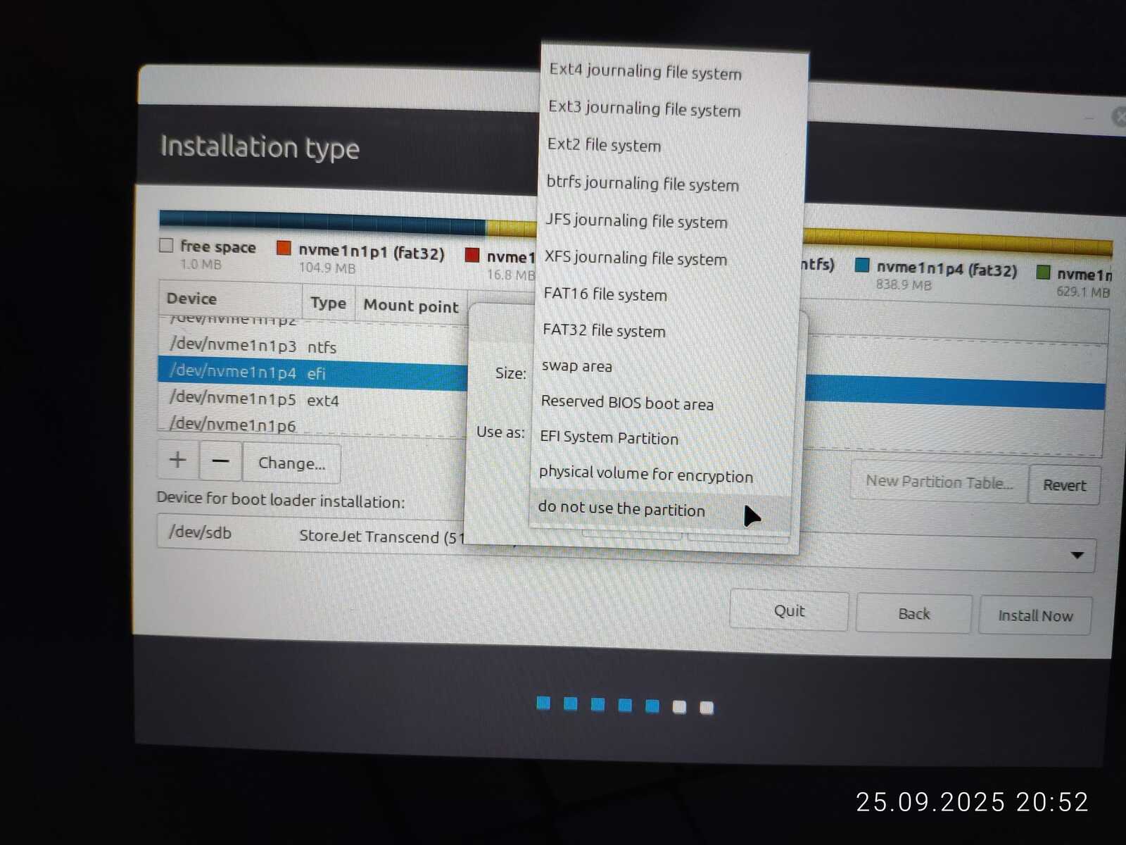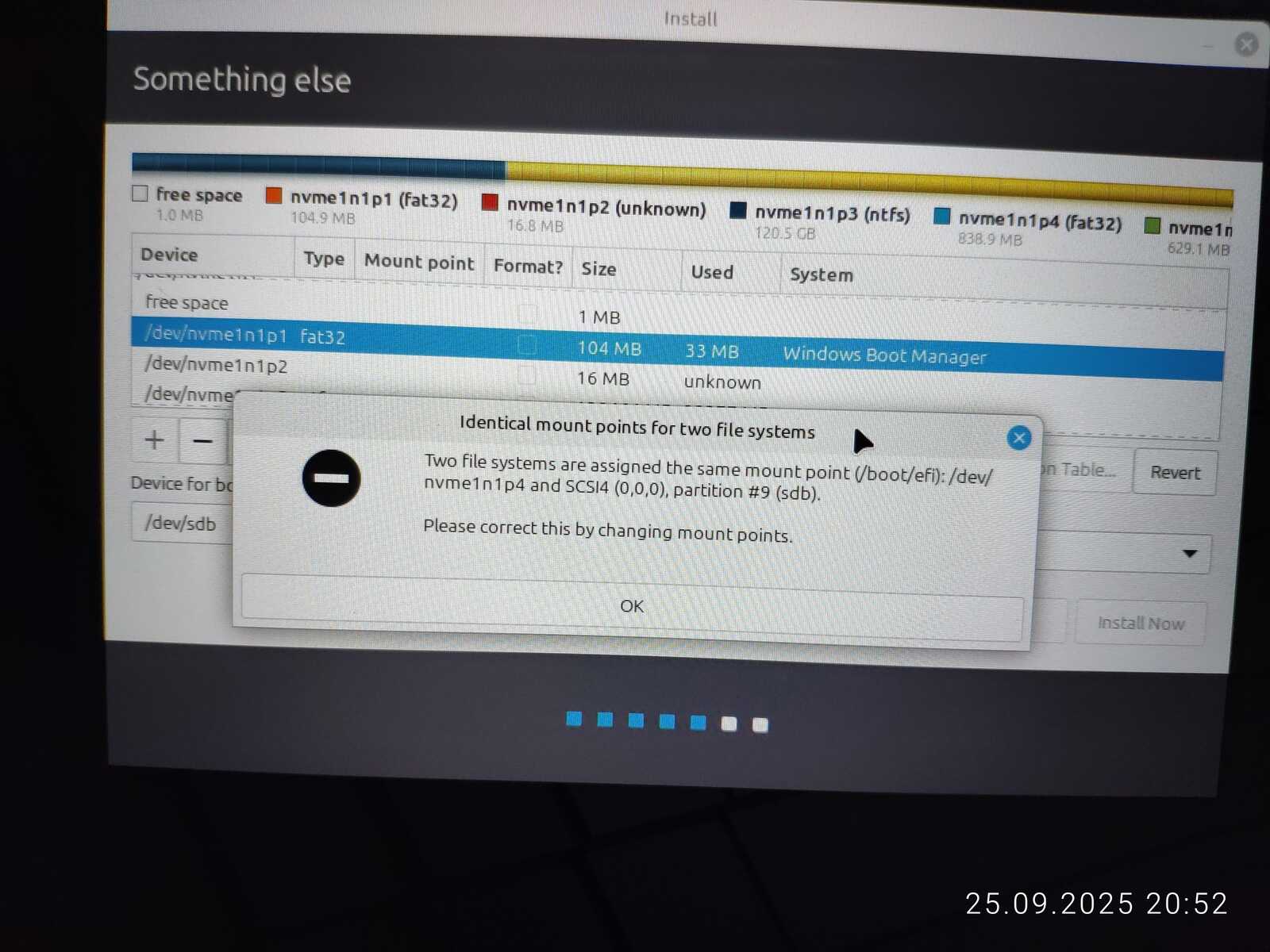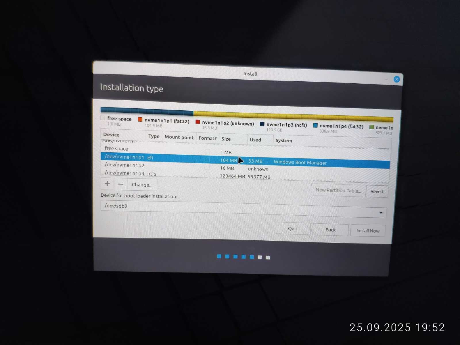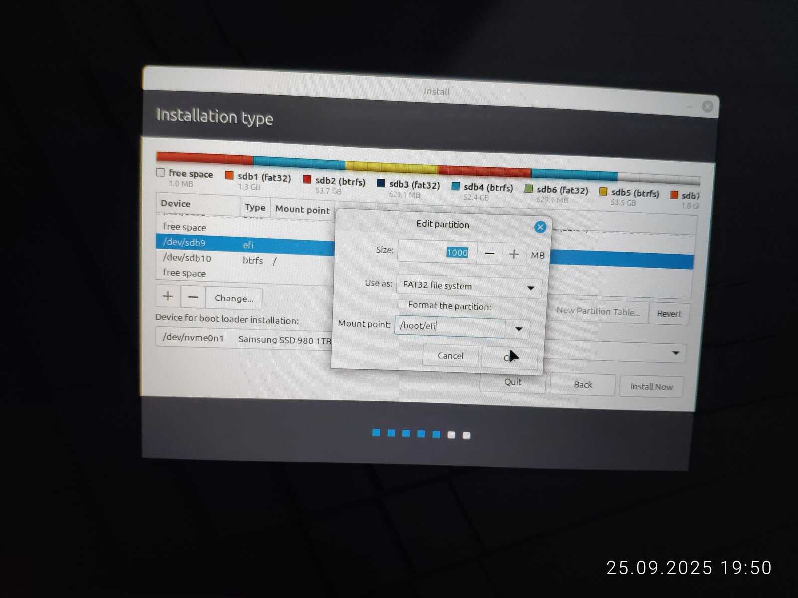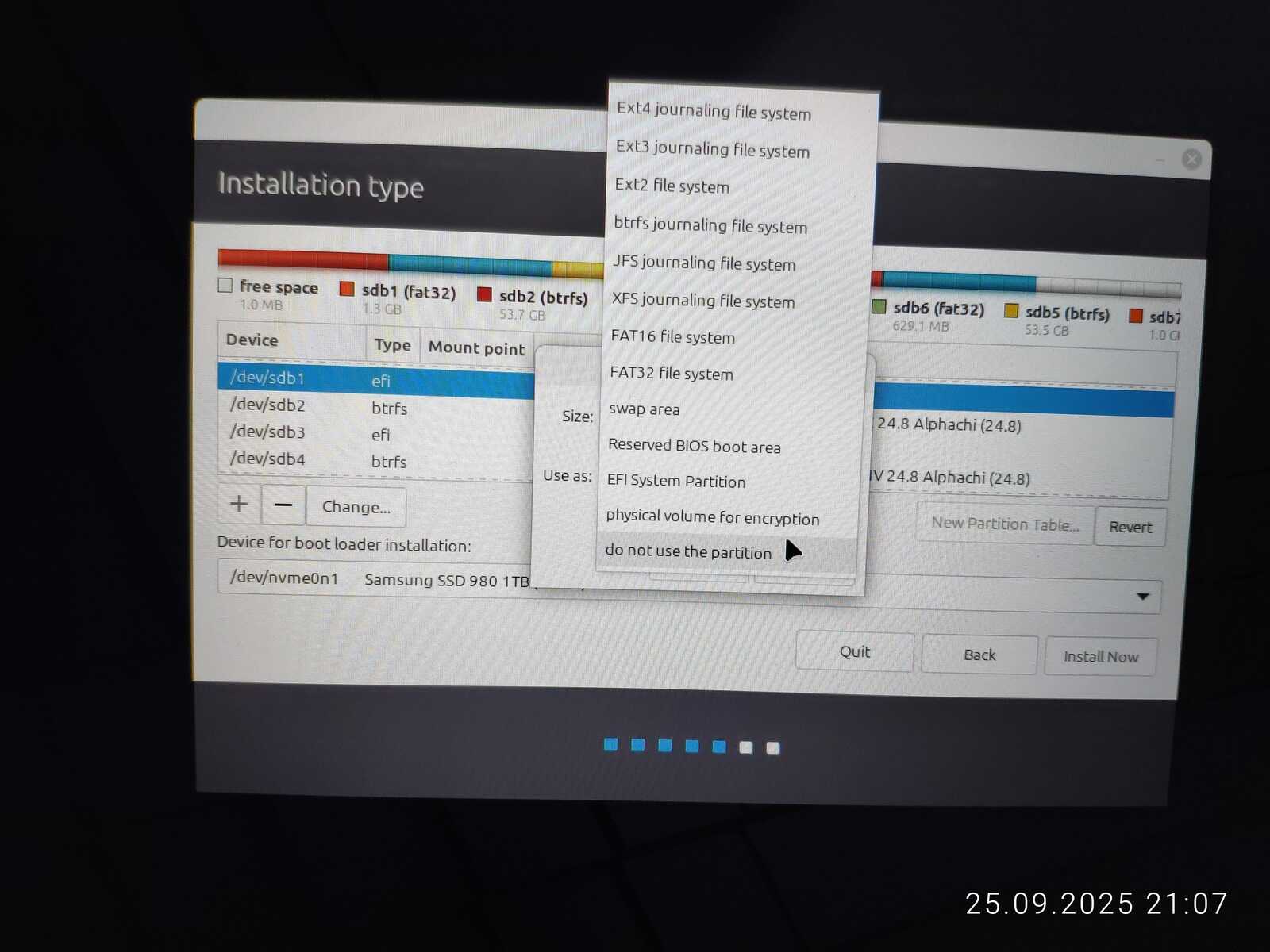 Опять занимаюсь снятием галочек с каждого EFI раздела, чтобы оставить только необходимый. Опять пытаюсь установить. Ну не хочу я уничтожать пять установленных операционных систем ради одного Linux Mint, отдавая всё во власть программы автоматической разметки.