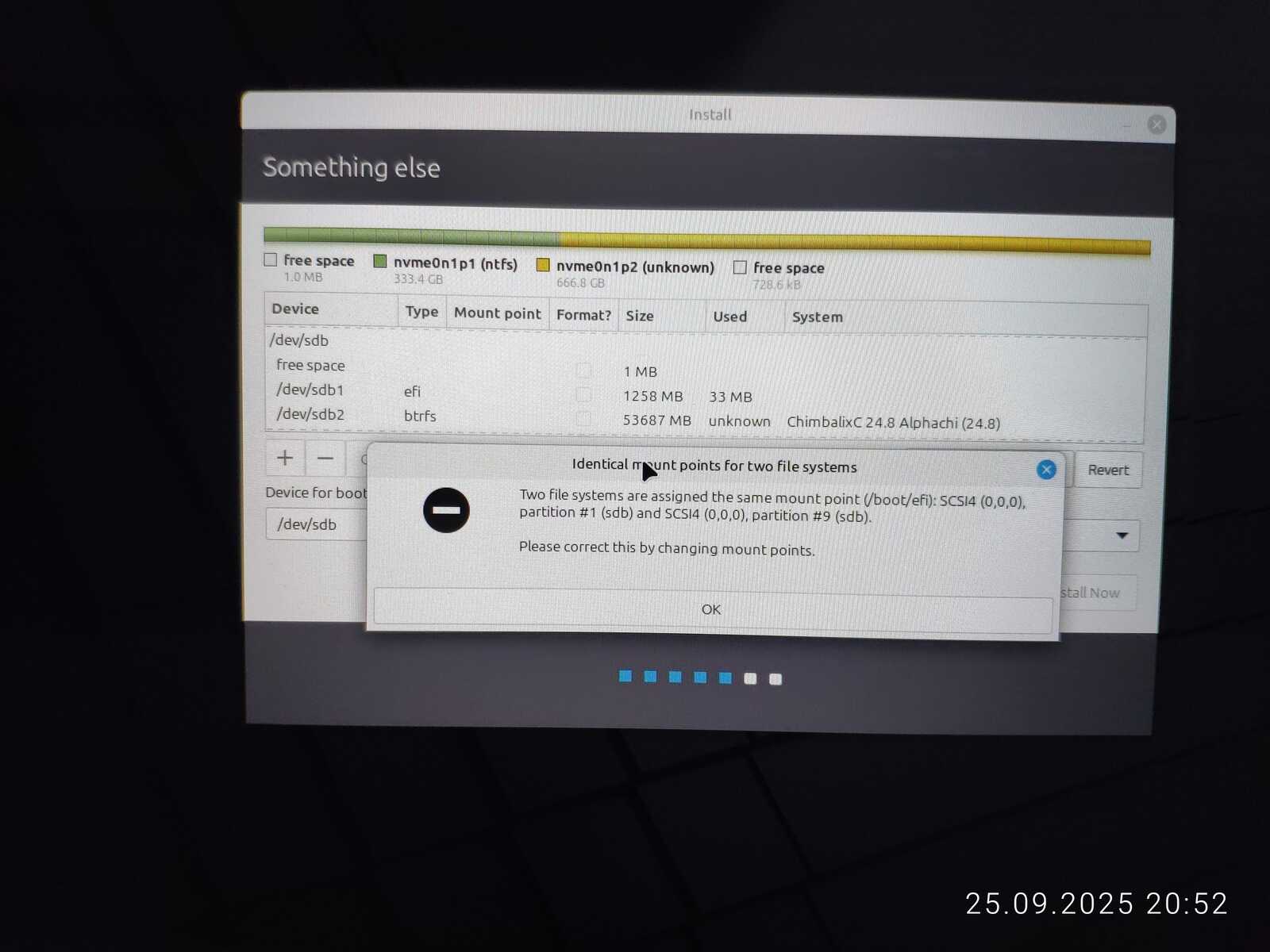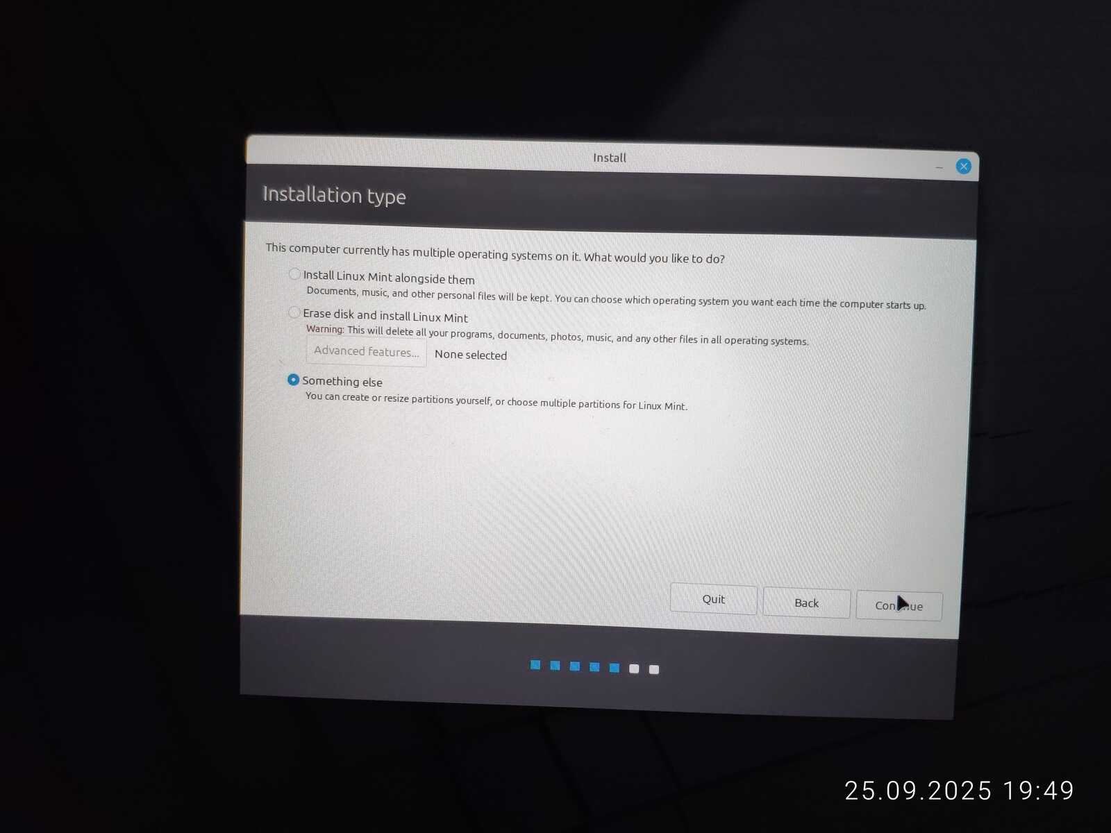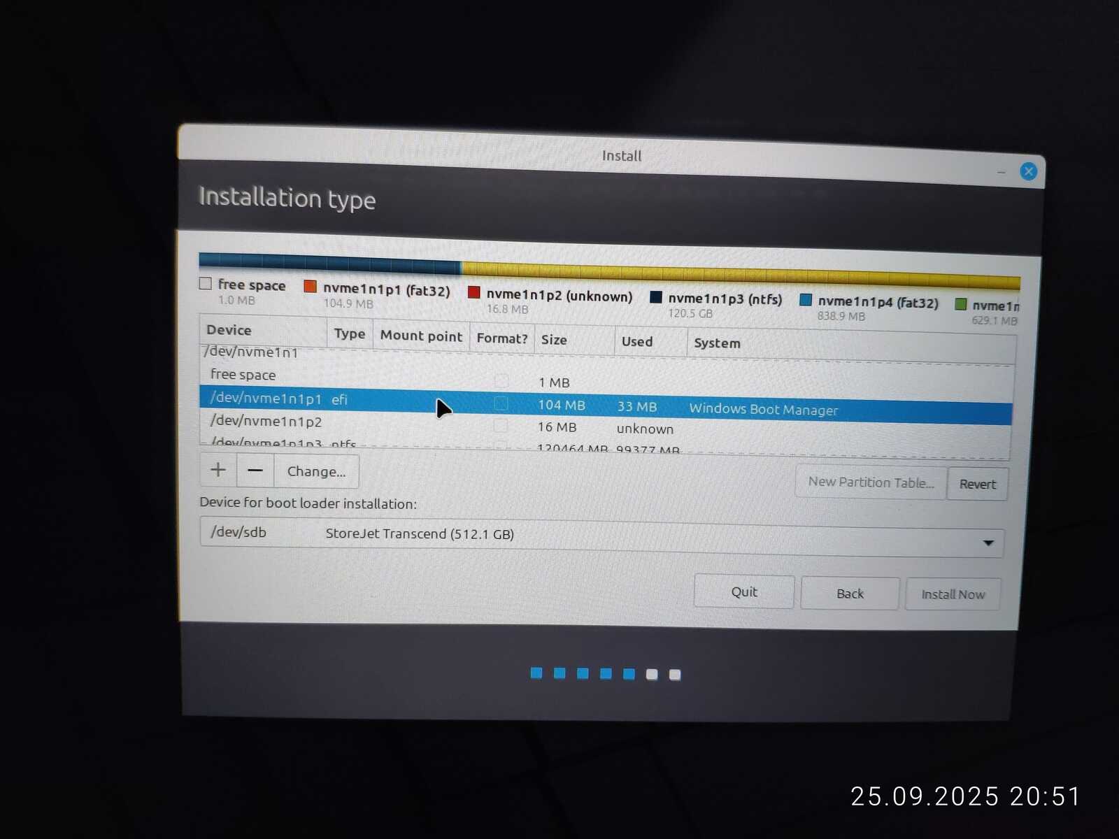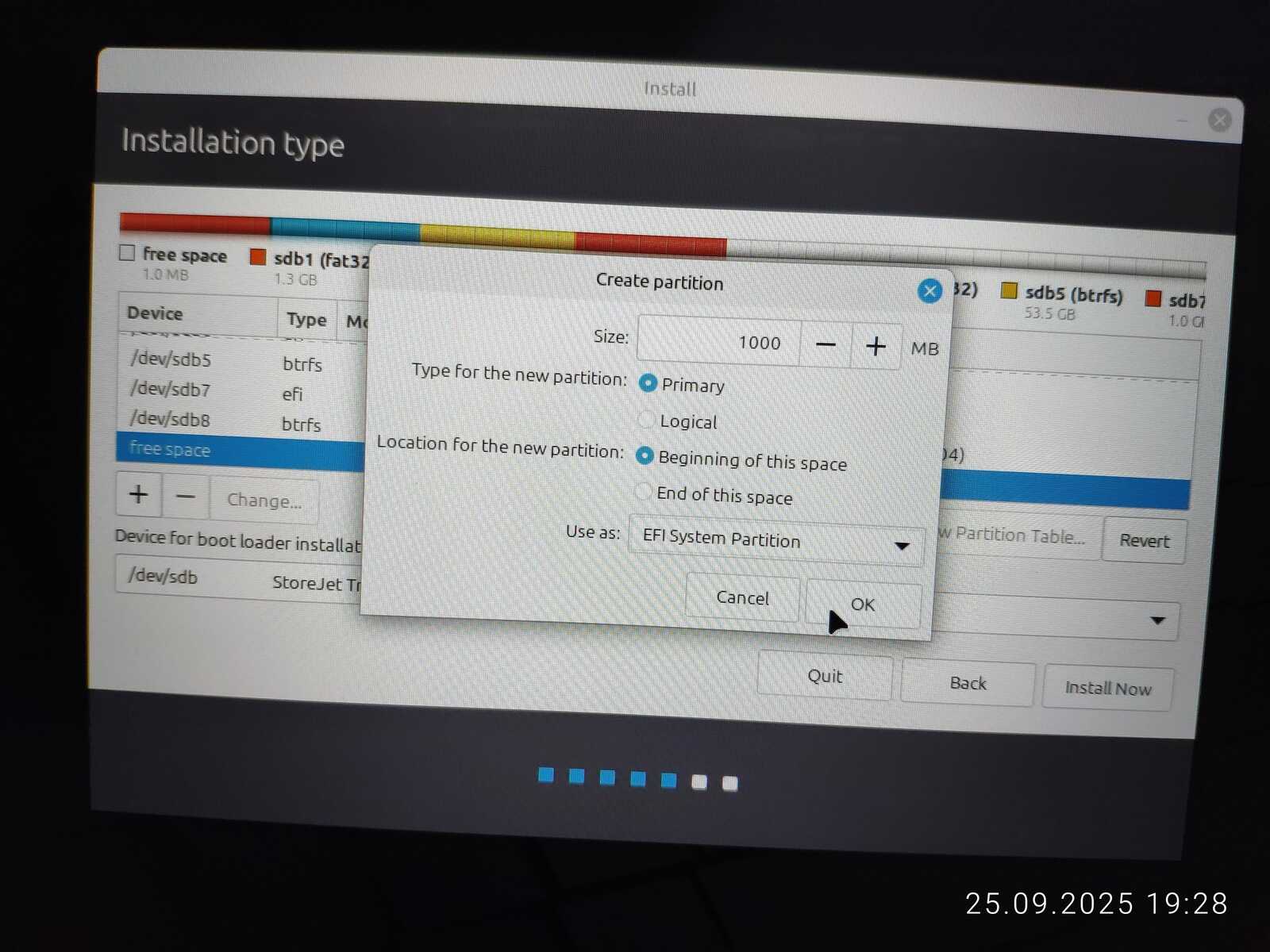 Опять занимаюсь снятием галочек с каждого EFI раздела, чтобы оставить только необходимый. Опять пытаюсь установить. Ну не хочу я уничтожать пять установленных операционных систем ради одного Linux Mint, отдавая всё во власть программы автоматической разметки.