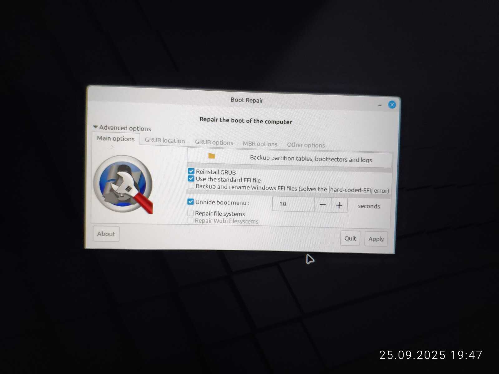 Запустил снова установку с флешки. Поискал программы для починки загрузчика. Одна нашлась. Но проблема в том, что программа для исправления загрузчика ничего по факту не могла исправить. Только сломать ещё и имевшиеся рабочие загрузчики.
