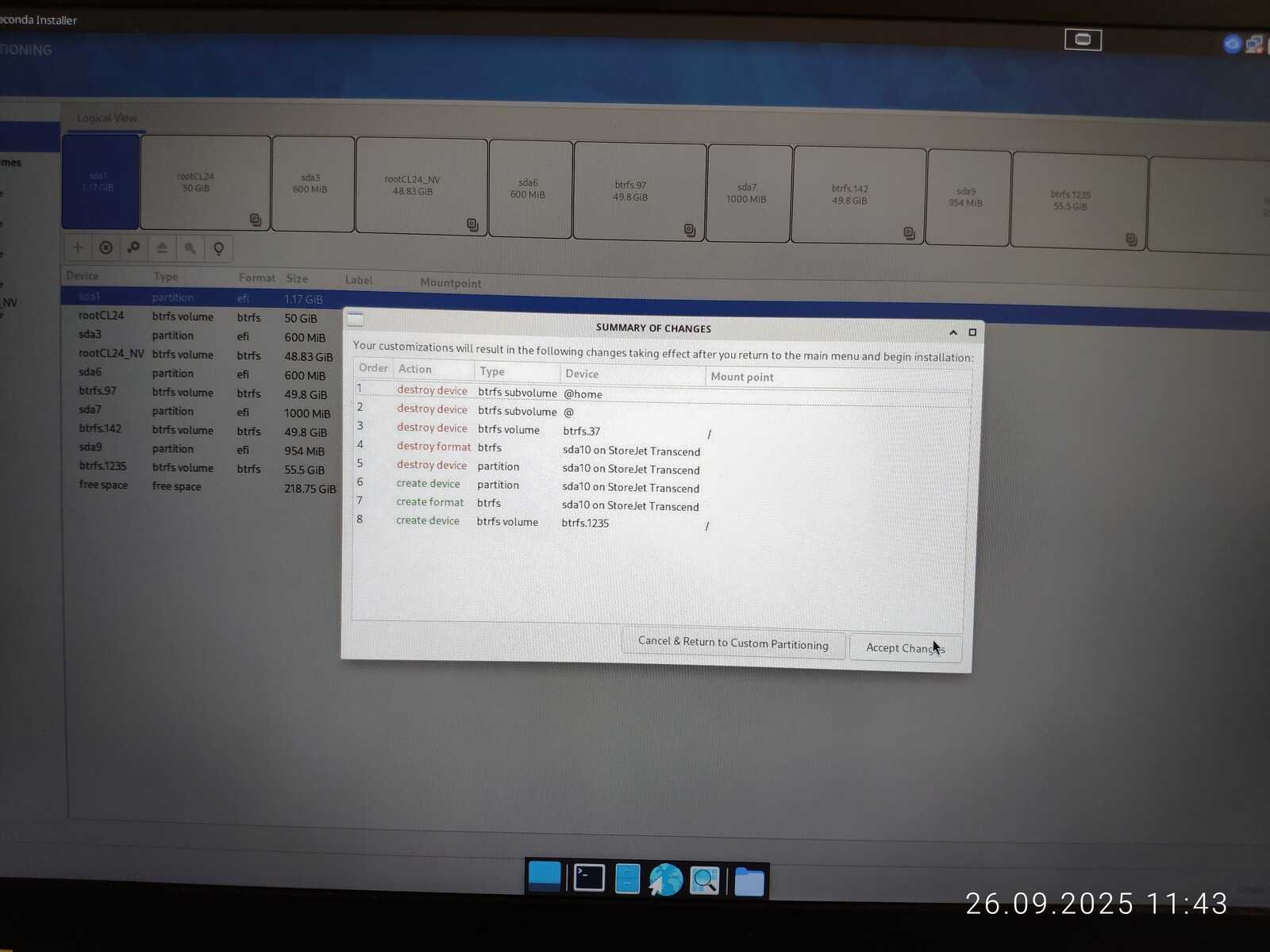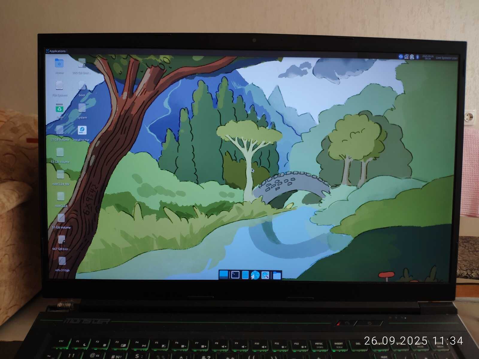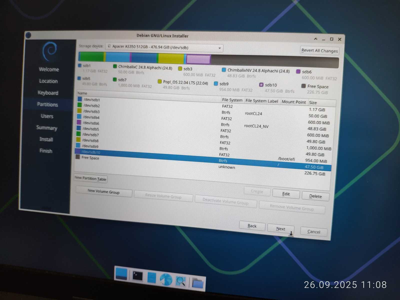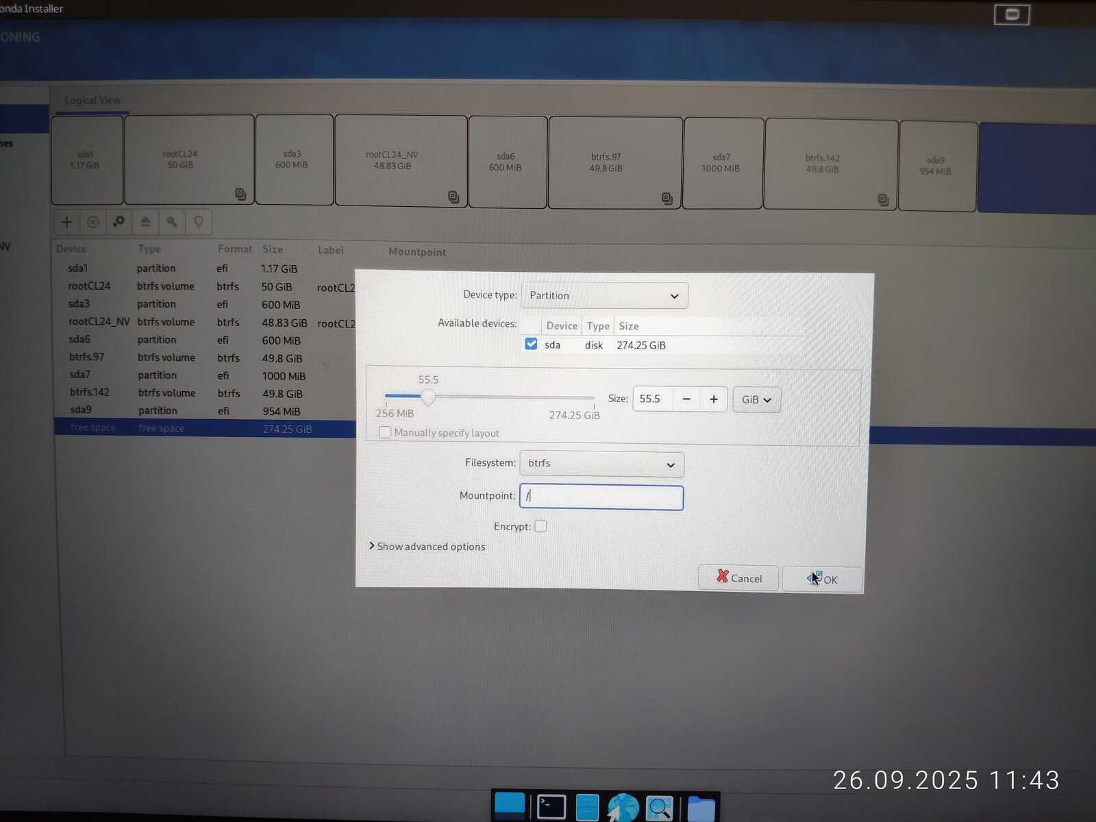 Программа установки не позволяет полноценно настроить клавиатуру. Да и к разметке дисков есть вопросы. Нельзя просто взять и создать нужные разделы без помощи стороннего софта. Даже пришлось переделывать, потому что под EFI раздел 600 мегабайт свободного места оказалось мало. Для загрузчика Chimbalix этого хватало. Да и Manjaro не жаловался с таким же объёмом.