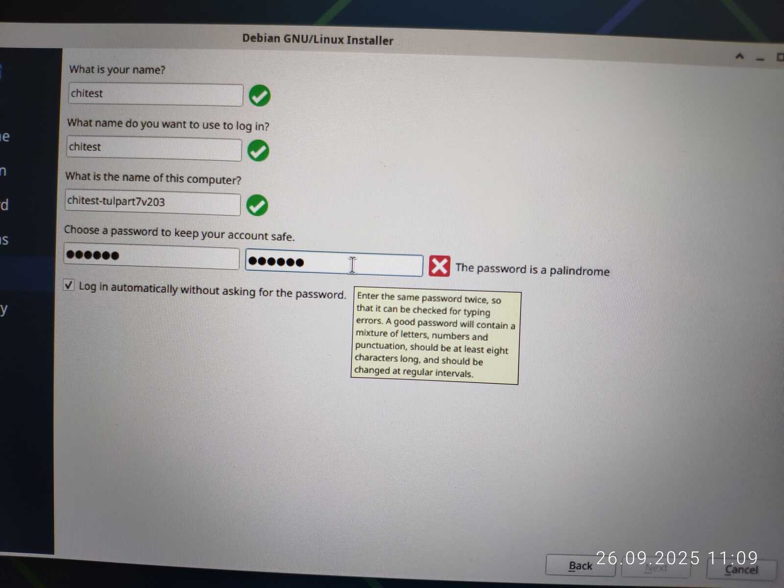 А вот дальше начинается просто лютое мракобесие. Разработчики Debian возомнили себя самыми важными шишками во Вселенной и решили, что могут позволить себе диктовать пользователям, какой пароль им использовать для учётной записи! Они меня, пользователя, просто взбесили этой наглостью!