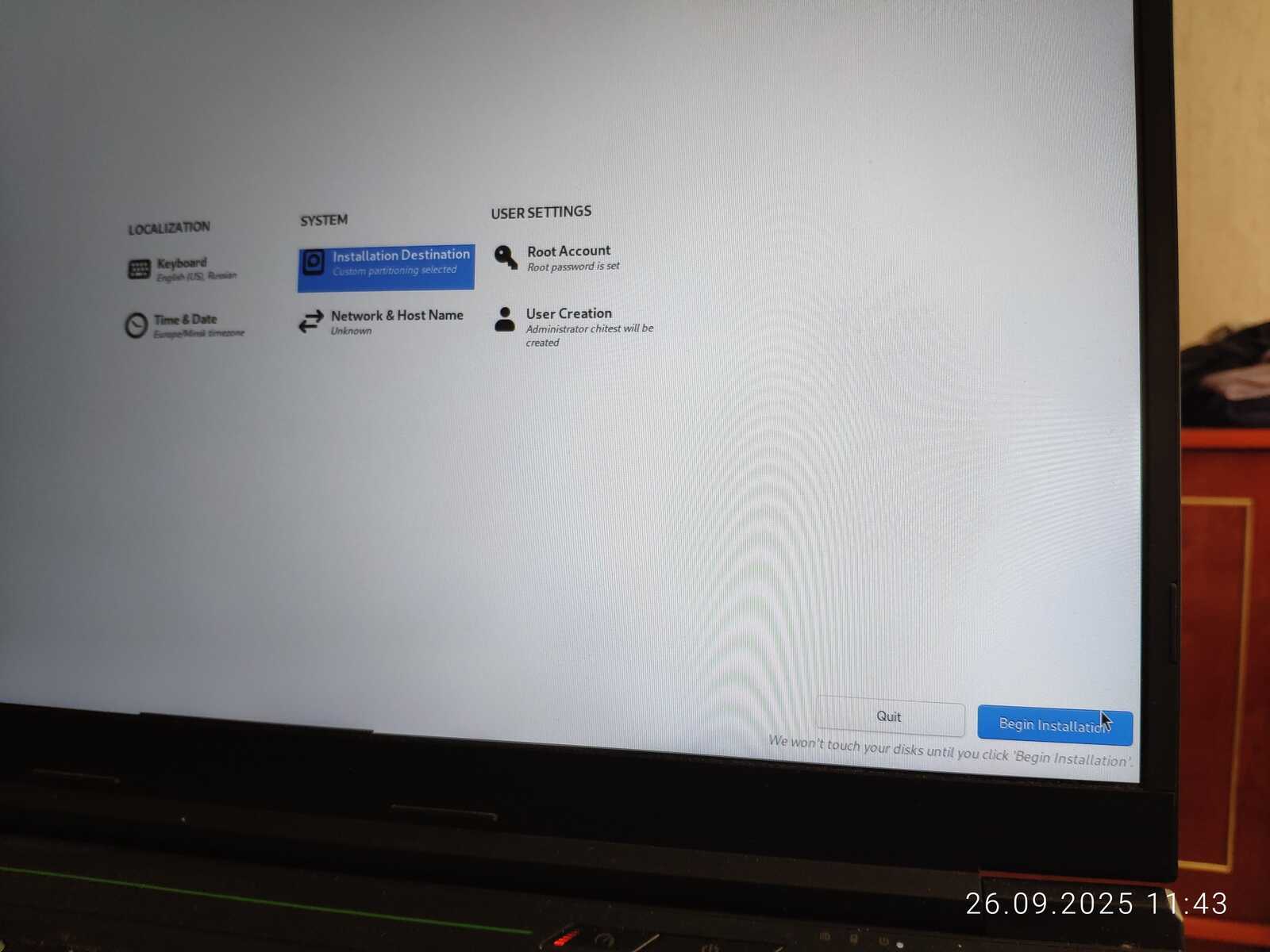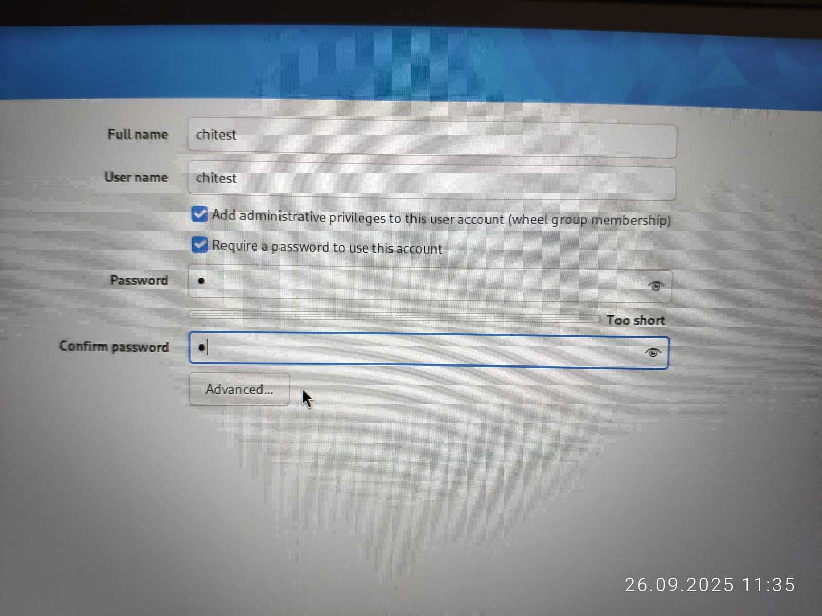 Программа установки ругается на слабый пароль, но не диктует свои правила в принудительном порядке, как это делает Debian 13.