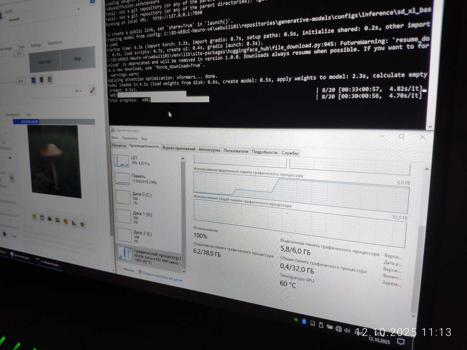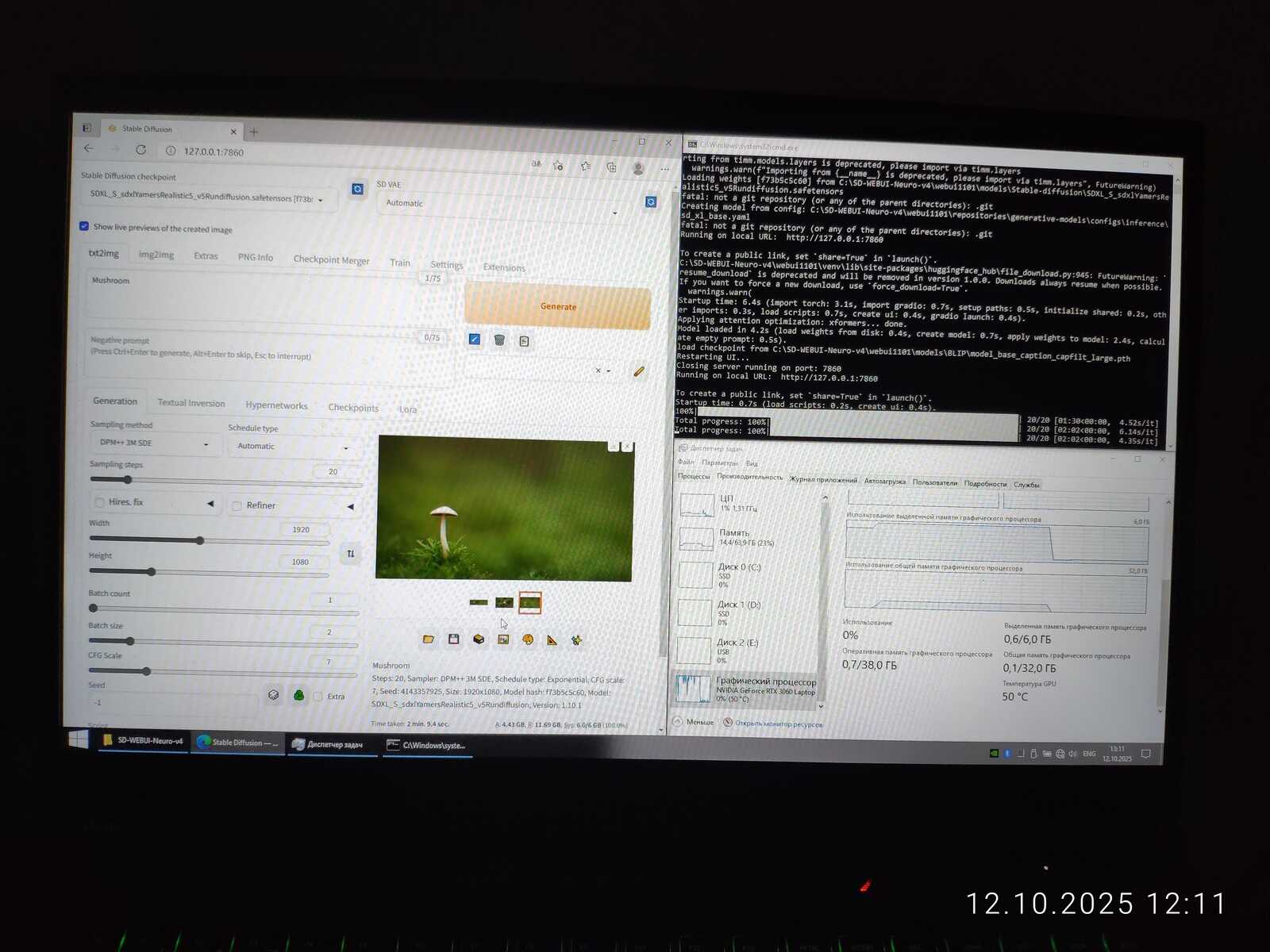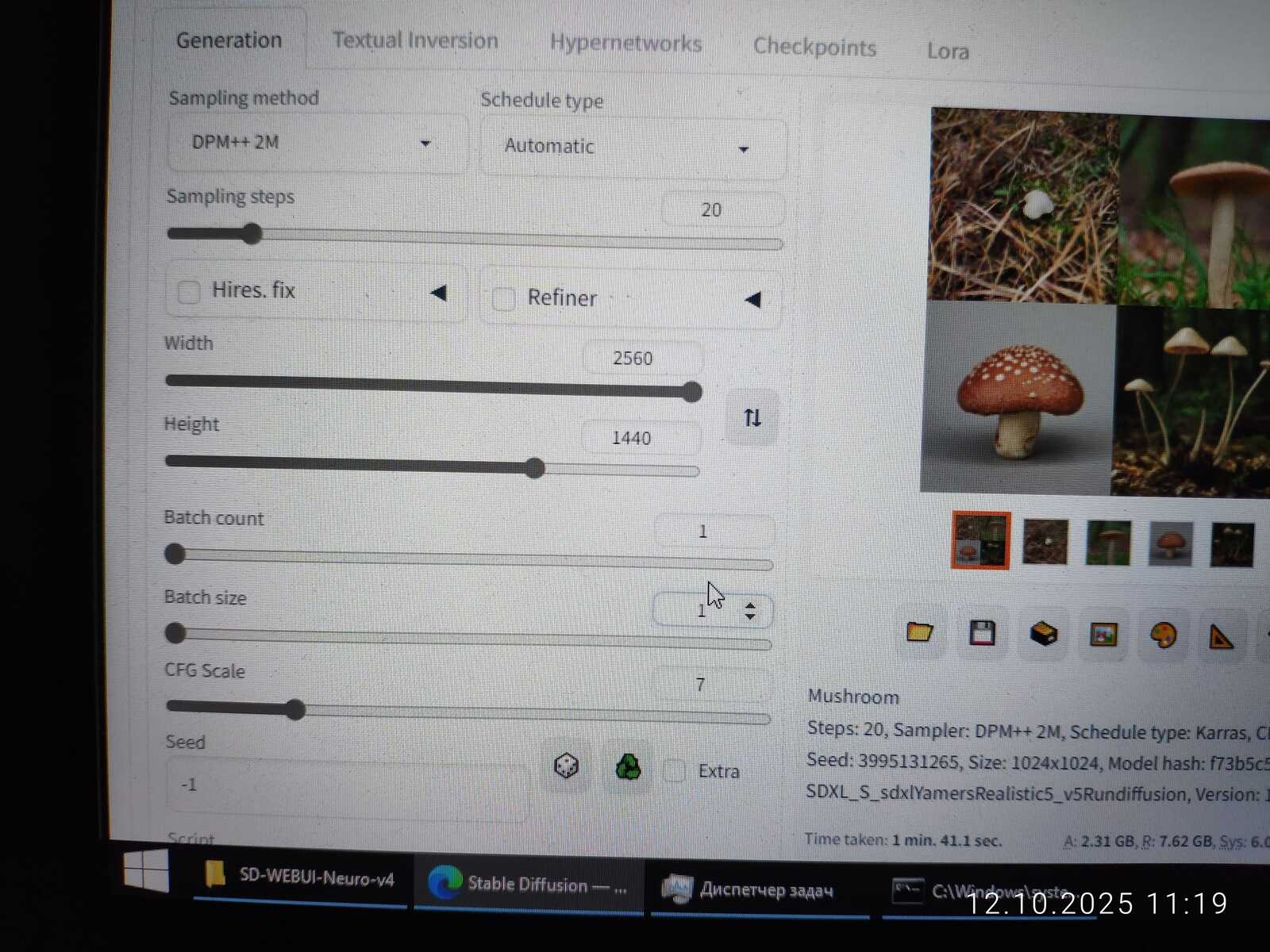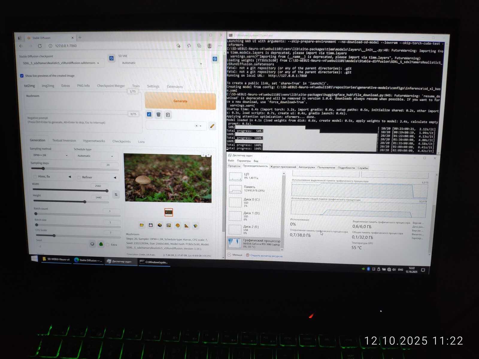 Ради интереса сгенерировал изображение в размере 2560x1440. На последнем этапе это заняло 18 гигабайт памяти видеокарты, что в 3 раза больше, чем есть физически у мобильной RTX 3060. Но генерация успешно завершилась. Потому что нормальная операционная система используется, умеющая правильно работать с памятью, в отличие от Linux.