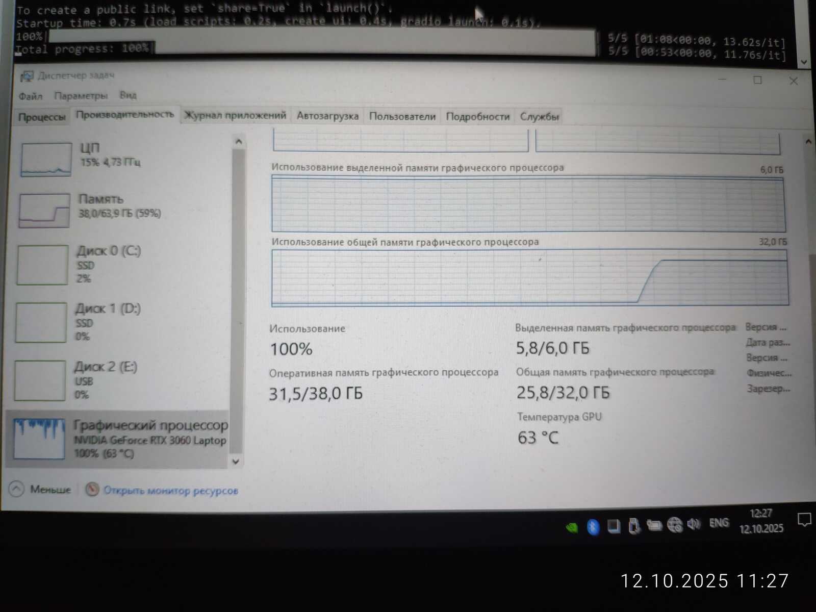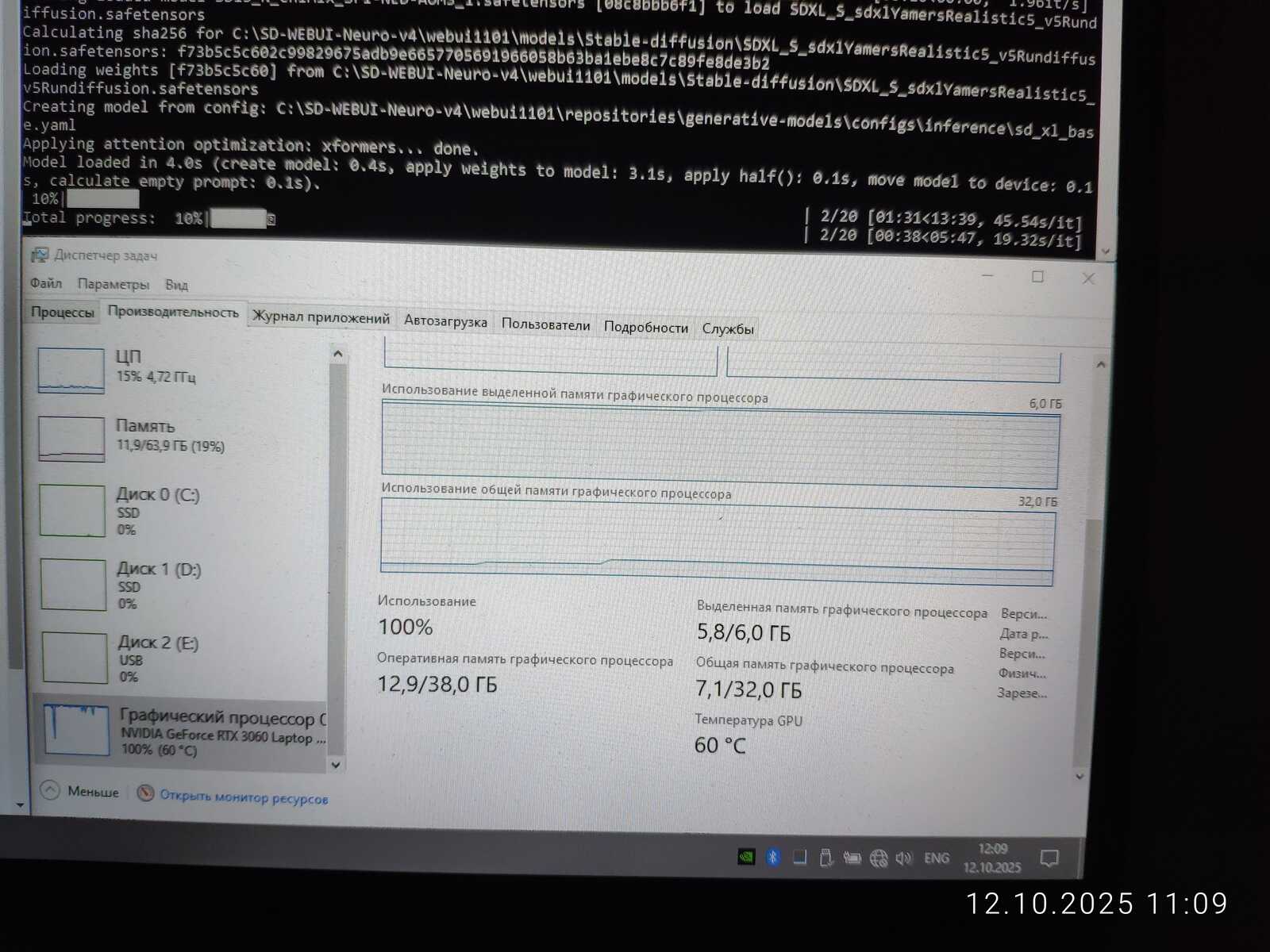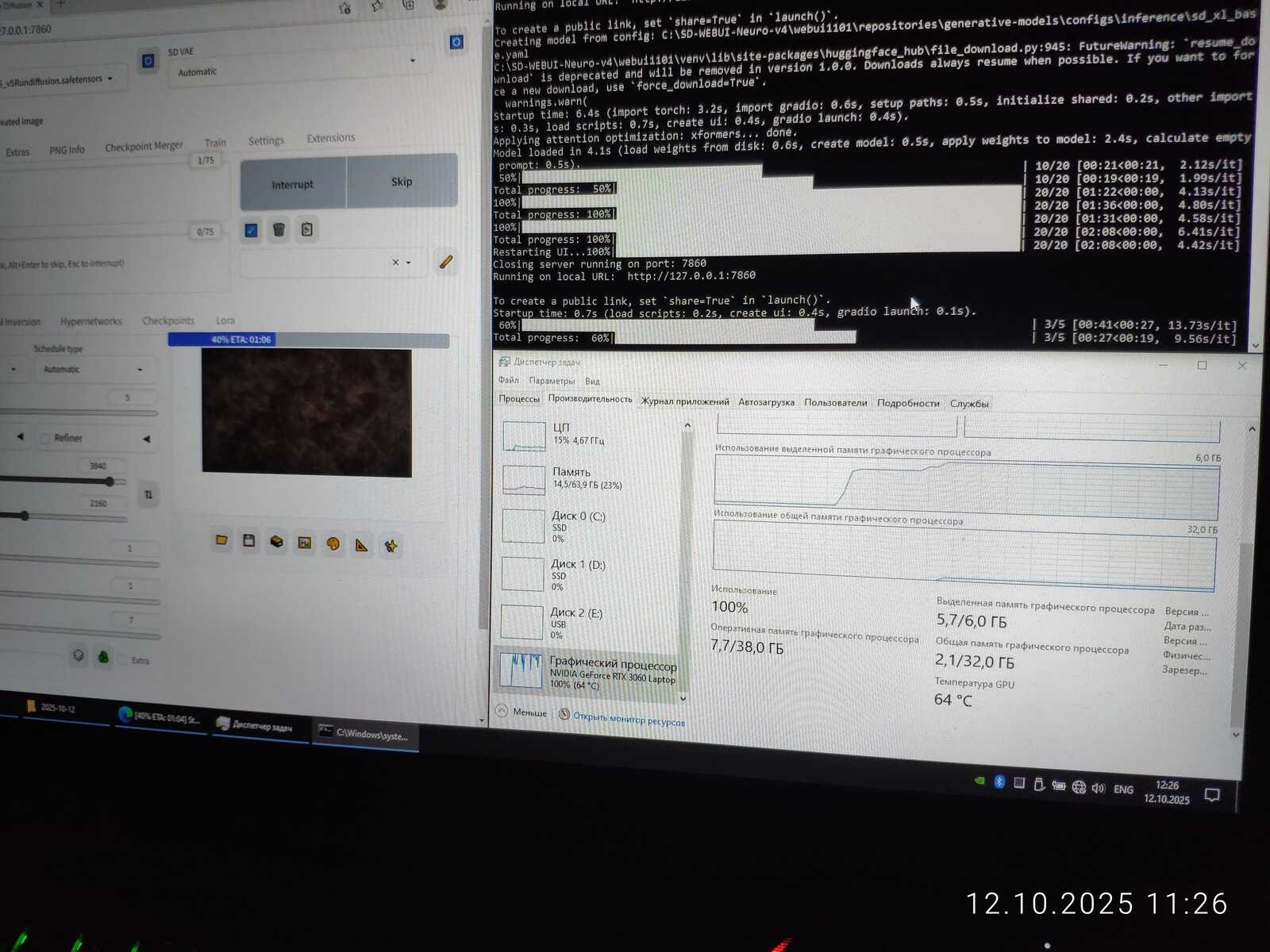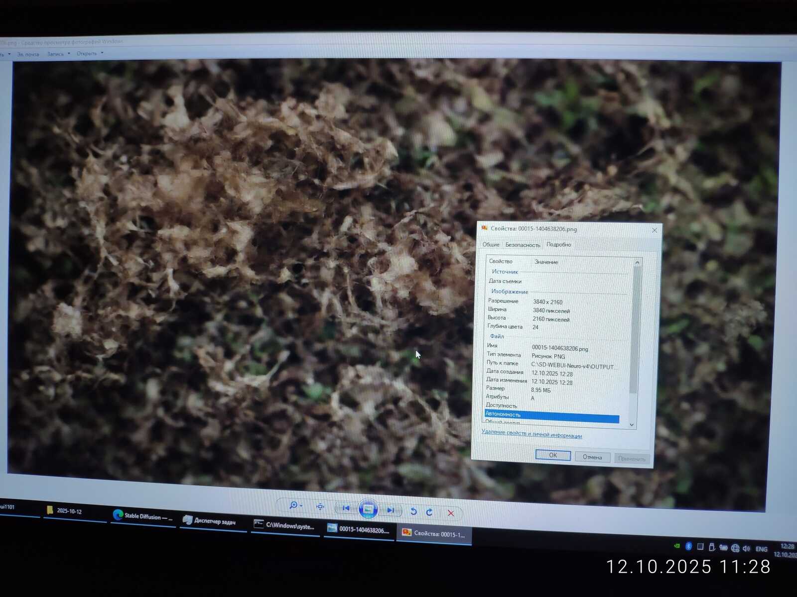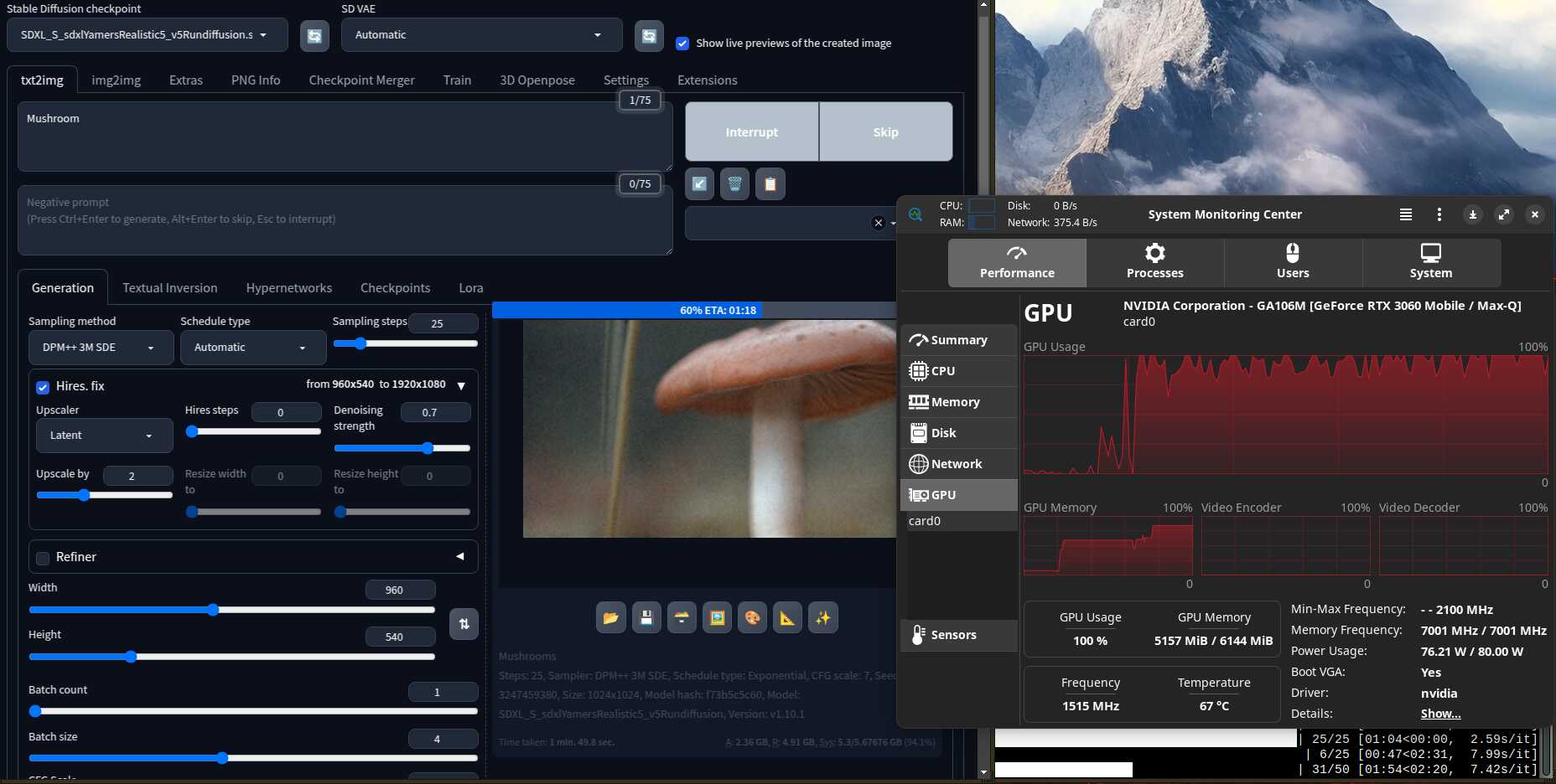 Ради интереса сгенерировал изображение в размере 2560x1440. На последнем этапе это заняло 18 гигабайт памяти видеокарты, что в 3 раза больше, чем есть физически у мобильной RTX 3060. Но генерация успешно завершилась. Потому что нормальная операционная система используется, умеющая правильно работать с памятью, в отличие от Linux.