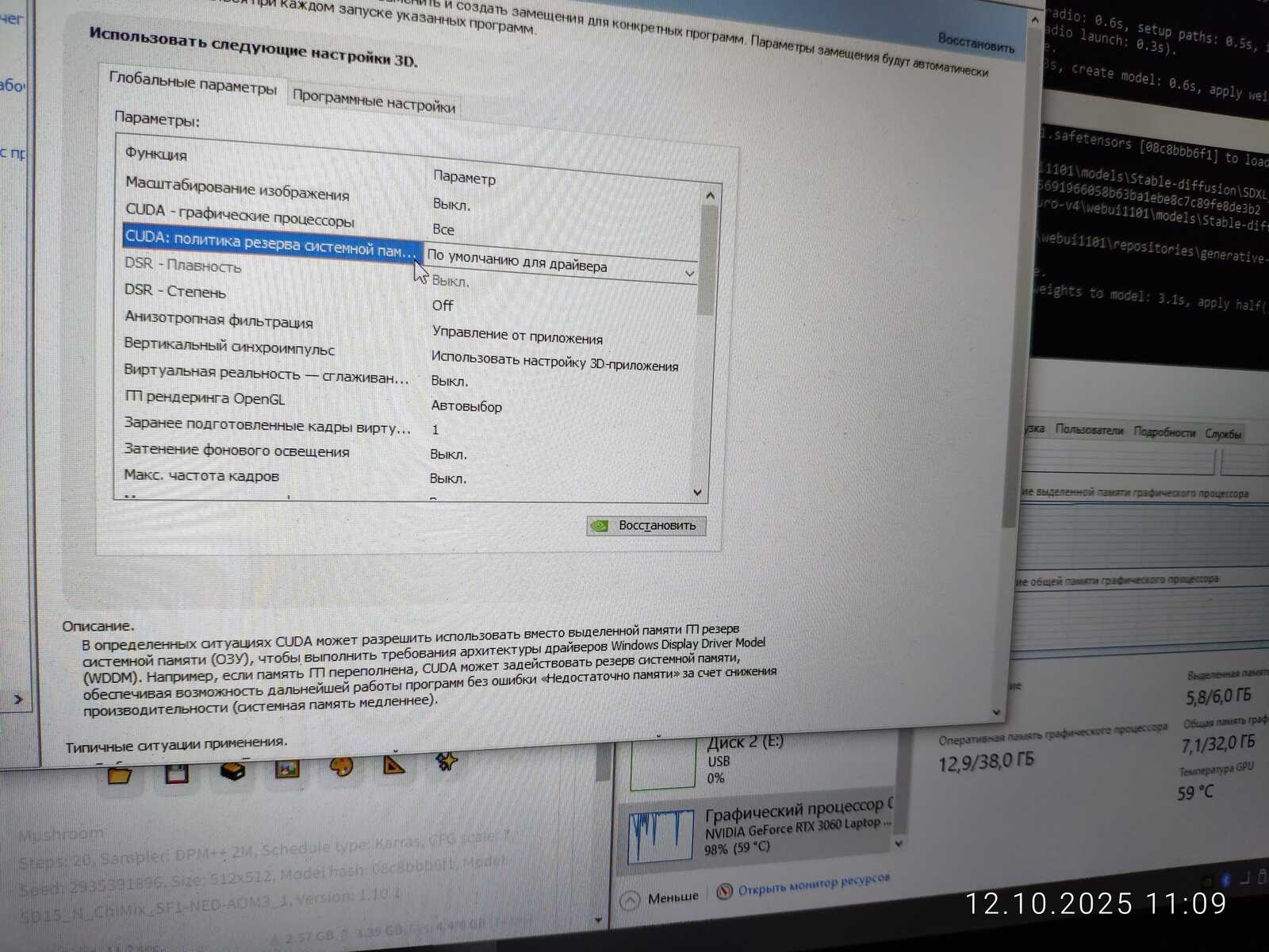 В среде Linux уже давно всё упало бы. Но почему не падает в среде Windows? Правильно! Потому что Windows умеет работать с памятью. В отличие от «пингвина», система сбрасывает излишки в обычную ОЗУ. И это можно отключить в Панели управления драйвера NVIDIA. Как все уже догадались, Linux так не умеет. Linux и так очень плохо работает с памятью. Куда там подкачивать память видеокарты.