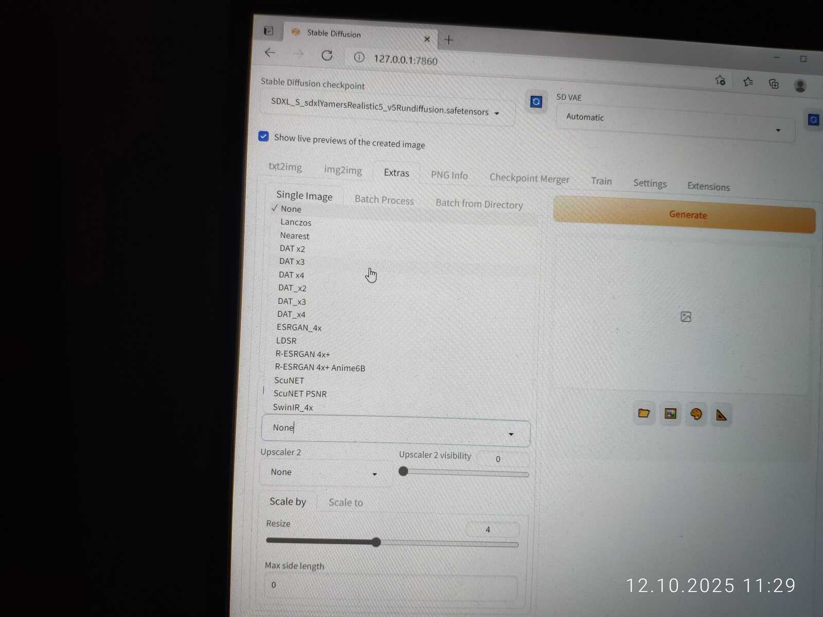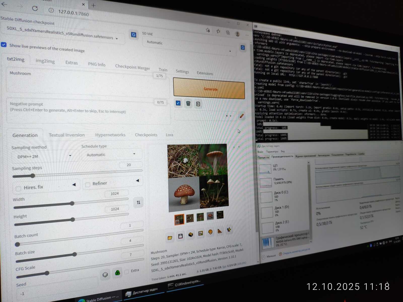 Перехожу на модель SDXL и вижу, что 6 гигабайт памяти на видеокарте слишком мало для полноценной работы. При генерации четырёх изображений одновременно в разрешении 1024x1024 ничего не падает, но работа идёт крайне медленно.