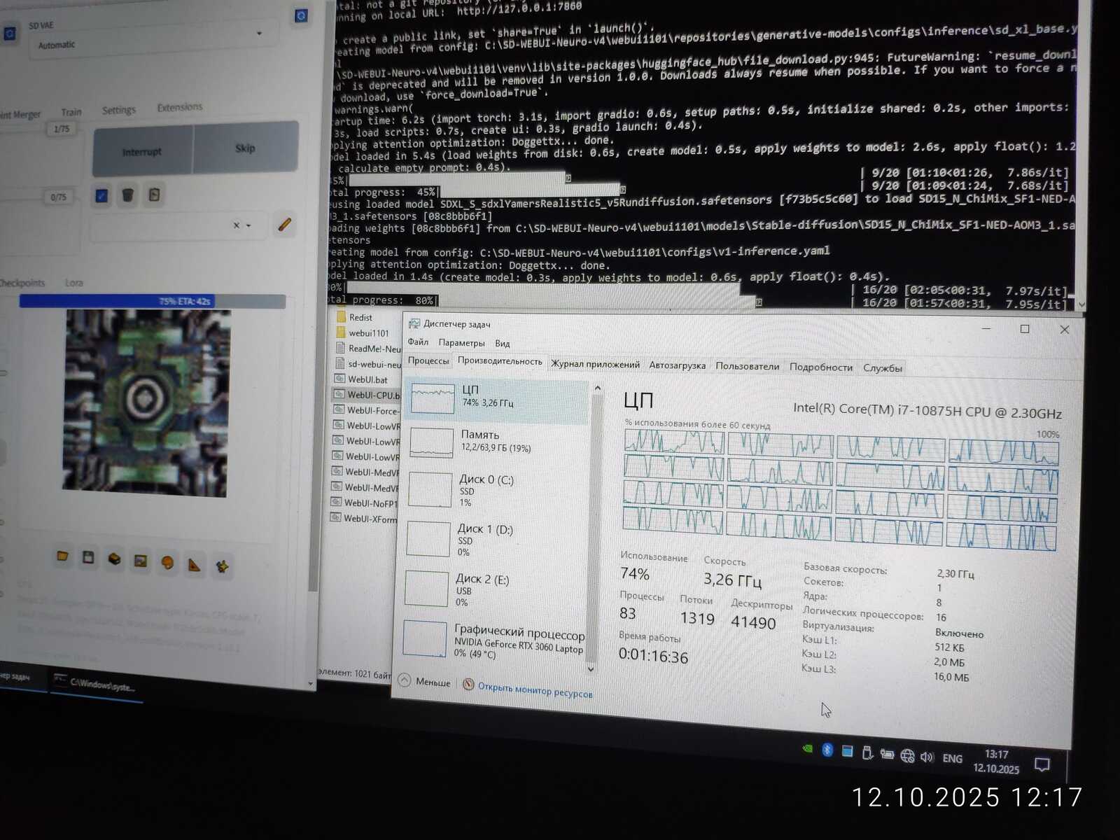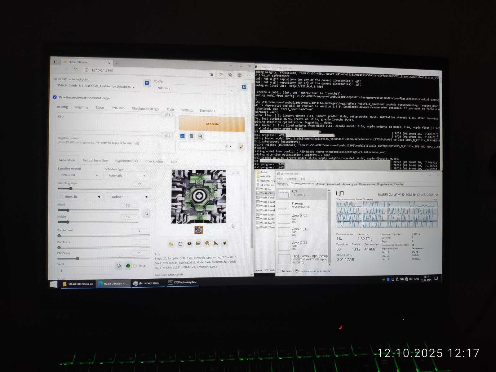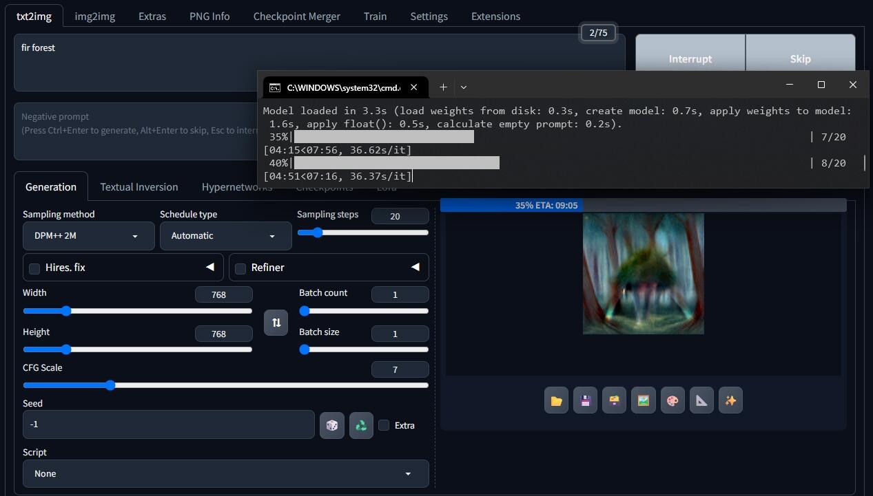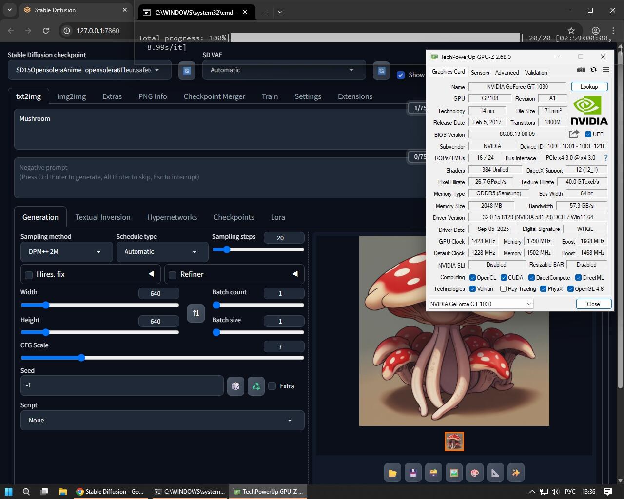 Даже серьёзный i7-10875H способен выдать итерацию лишь за 14 секунд при таком же разрешении генерации 768x768, когда GT 1030 выдает итерацию за 9-10 секунд.