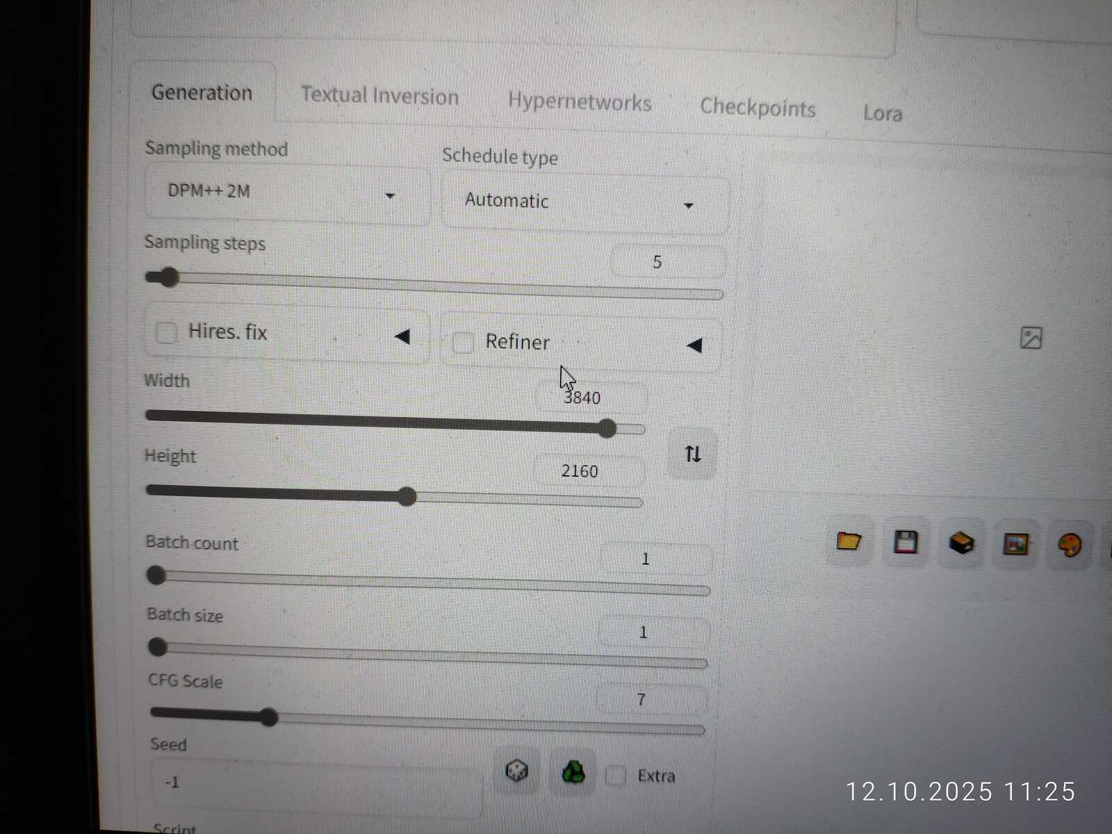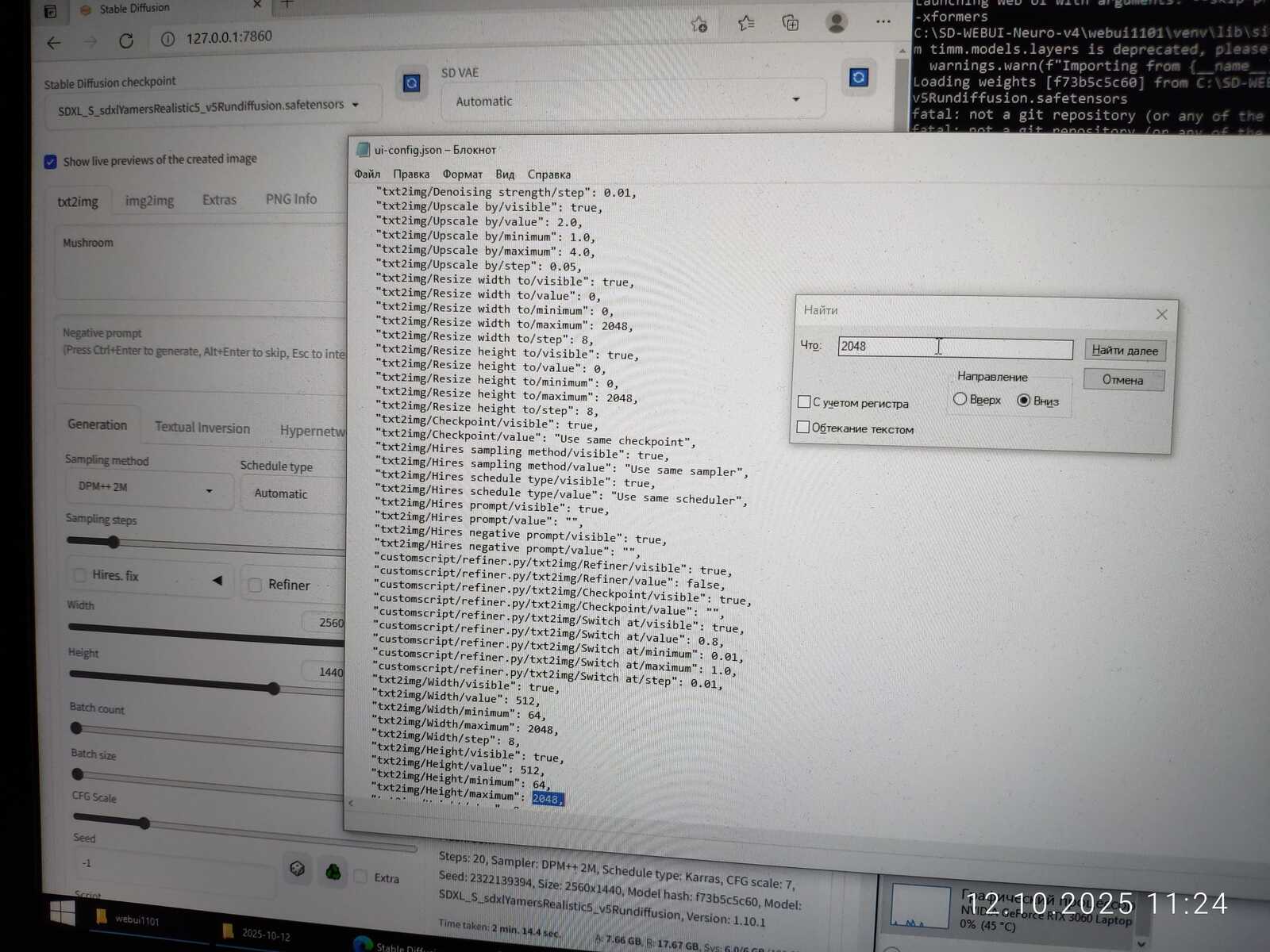 Раз уж такое дело. Не вижу ничего зазорного в том, чтобы расширить лимиты, доступные для генерации, до 4096. Так уже можно сгенерировать изображение в разрешении 3840х2160 на той же мобильной RTX 3060, имеющей всего 6 ГБ памяти. Чтобы ускорить дело, было выставлено всего 5 итераций качества, потому ничего внятного и не получилось. Нужно минимум 15 итераций для внятного результата. Важен сам факт, что генерация в таком размере возможна от начала до конца.